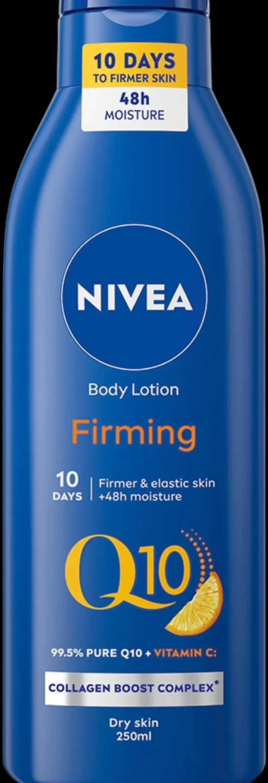 Valmistaudu kiinteään ja kimmoisaan ihoon! NIVEA Q10 Firming Body Lotion -vartaloemulsio sisältää kollageenitehoste-yhdisteen*, 99,5% puhdasta Q10-koentsyymiä + C-vitamiinia, vahvistaa ja parantaa ihon kimmoisuutta huomattavasti 10 päivässä. Kosteuttaa ihoa 48 tunnin ajan ja antaa miellyttävän tuoksun iholle. Sopii kuivalle ja erittäin kuivalle iholle.