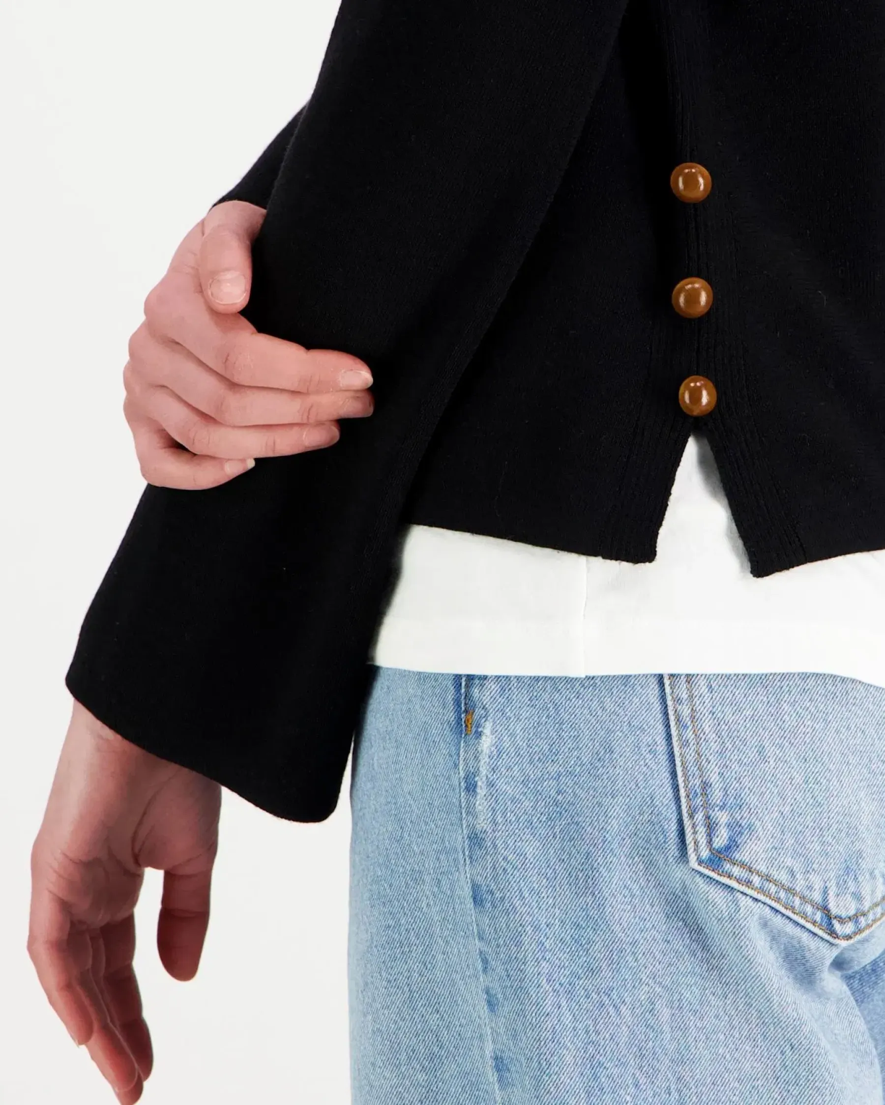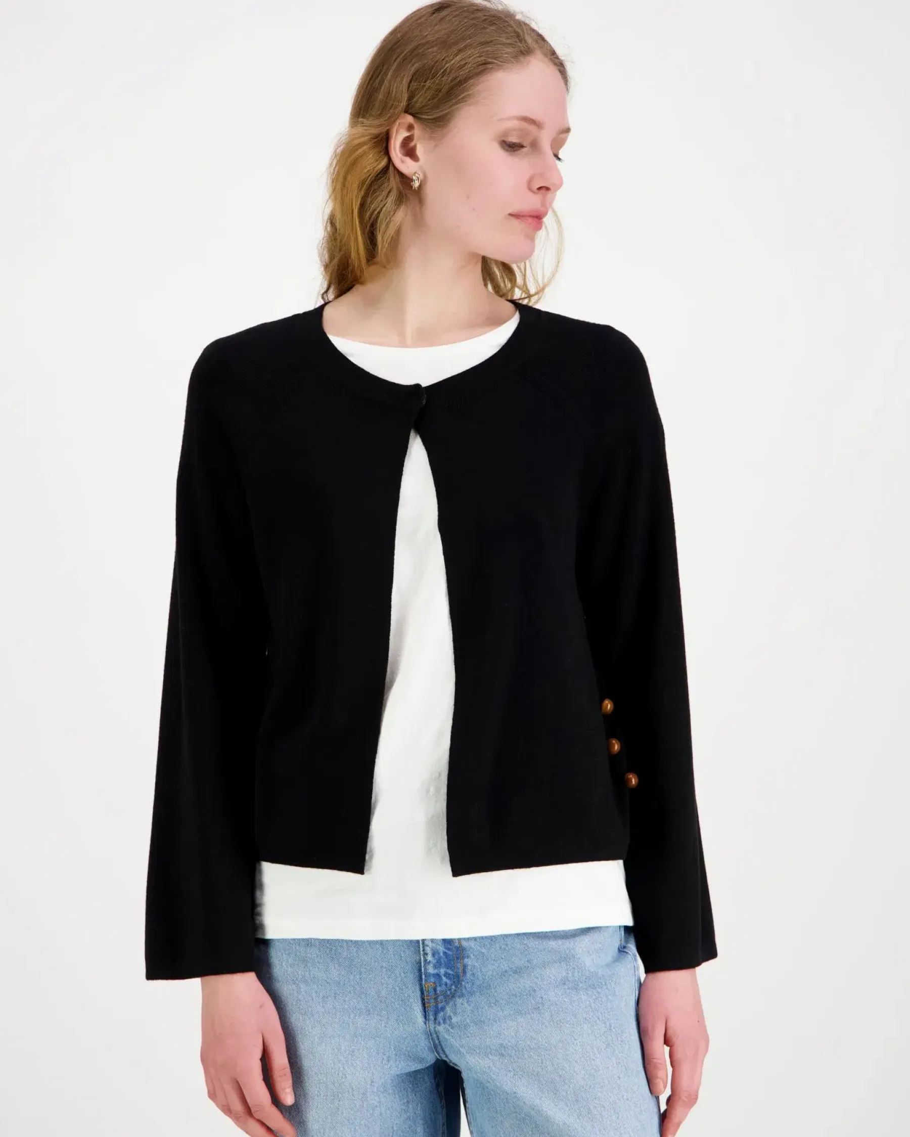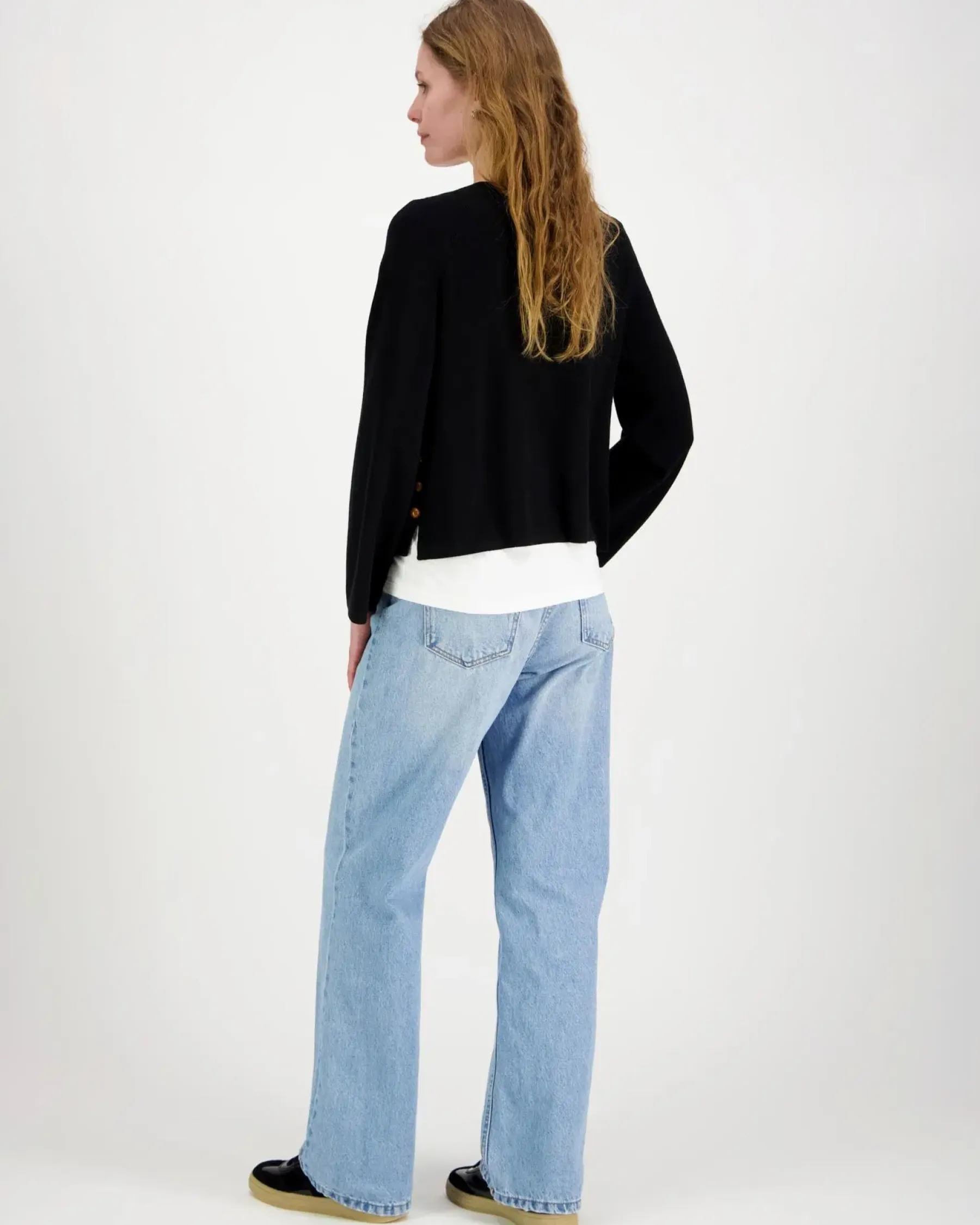 Merinovillasta valmistetussa A-linjaisessa Blanka-neuletakissa on pyöreä pääntie, piilotettu nappikiinnitys edessä ja 7/8-pituiset raglanhihat. Neuletakin sivuilla on helmikoristeet ja metallinen Aarikan a-logo. Hartiasta helmaan mitattuna pituus koossa S on 58 cm. Suunniteltu Suomessa.