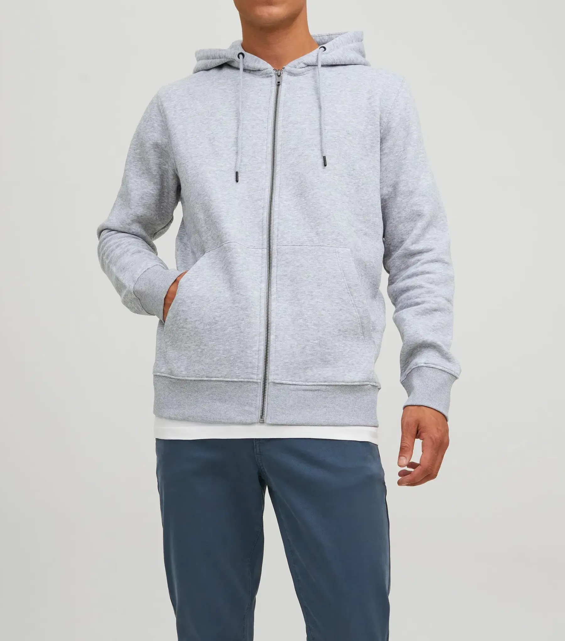 Miesten perusmallinen huppari, jossa vetoketjukiinnitys ja kengurutaskut edessä.