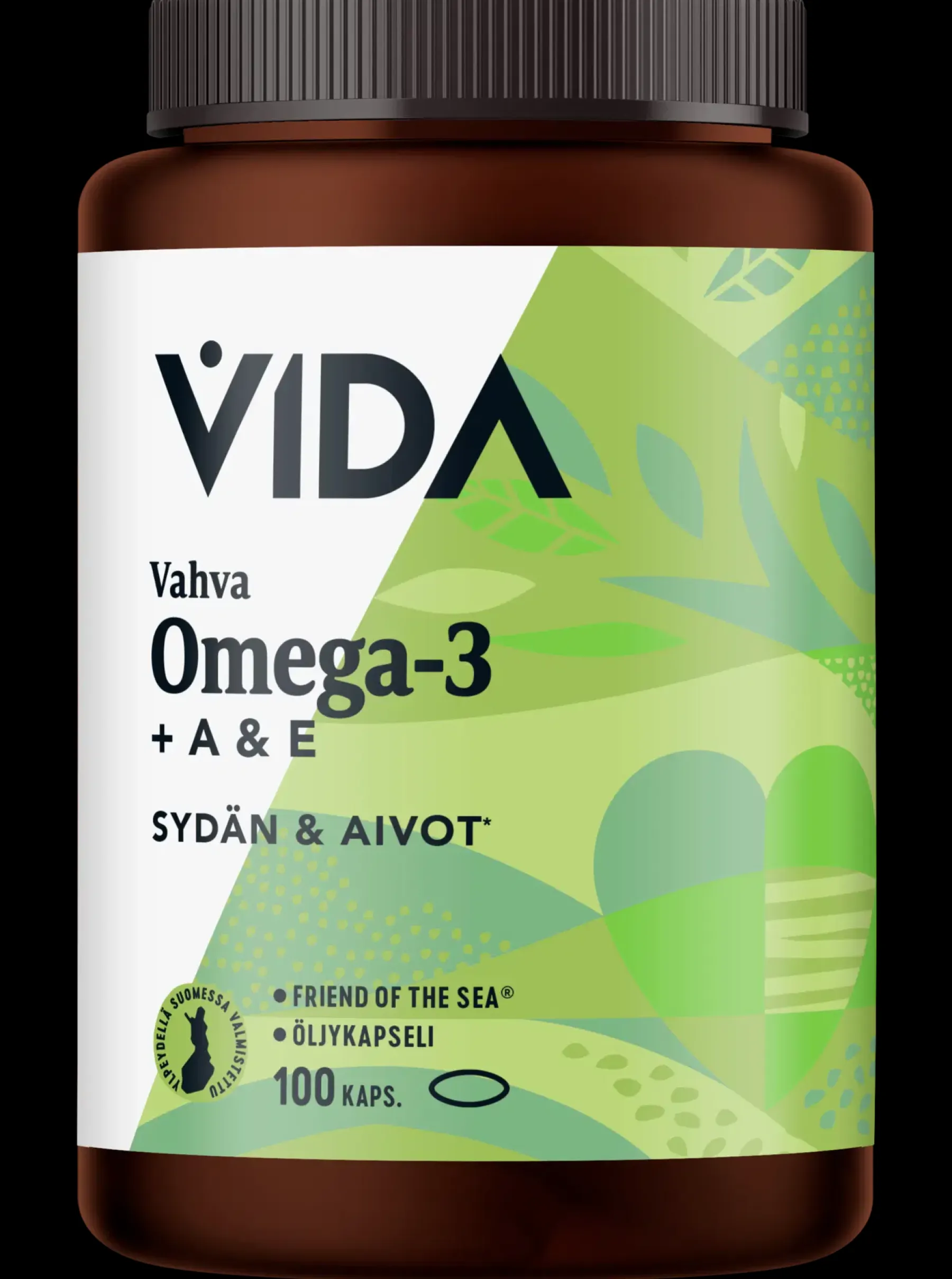 Vida Vahva Omega-3 + A- ja E-vitamiini sisältää runsaasti elintärkeitä EPA ja DHA rasvahappoja, jotka auttavat huolehtimaan sydämen ja aivojen hyvinvoinnista. Valmistettu kestävän kehityksen periaattein tuotetusta Friend of the Sea® sertifioidusta kalaöljystä Suomessa.