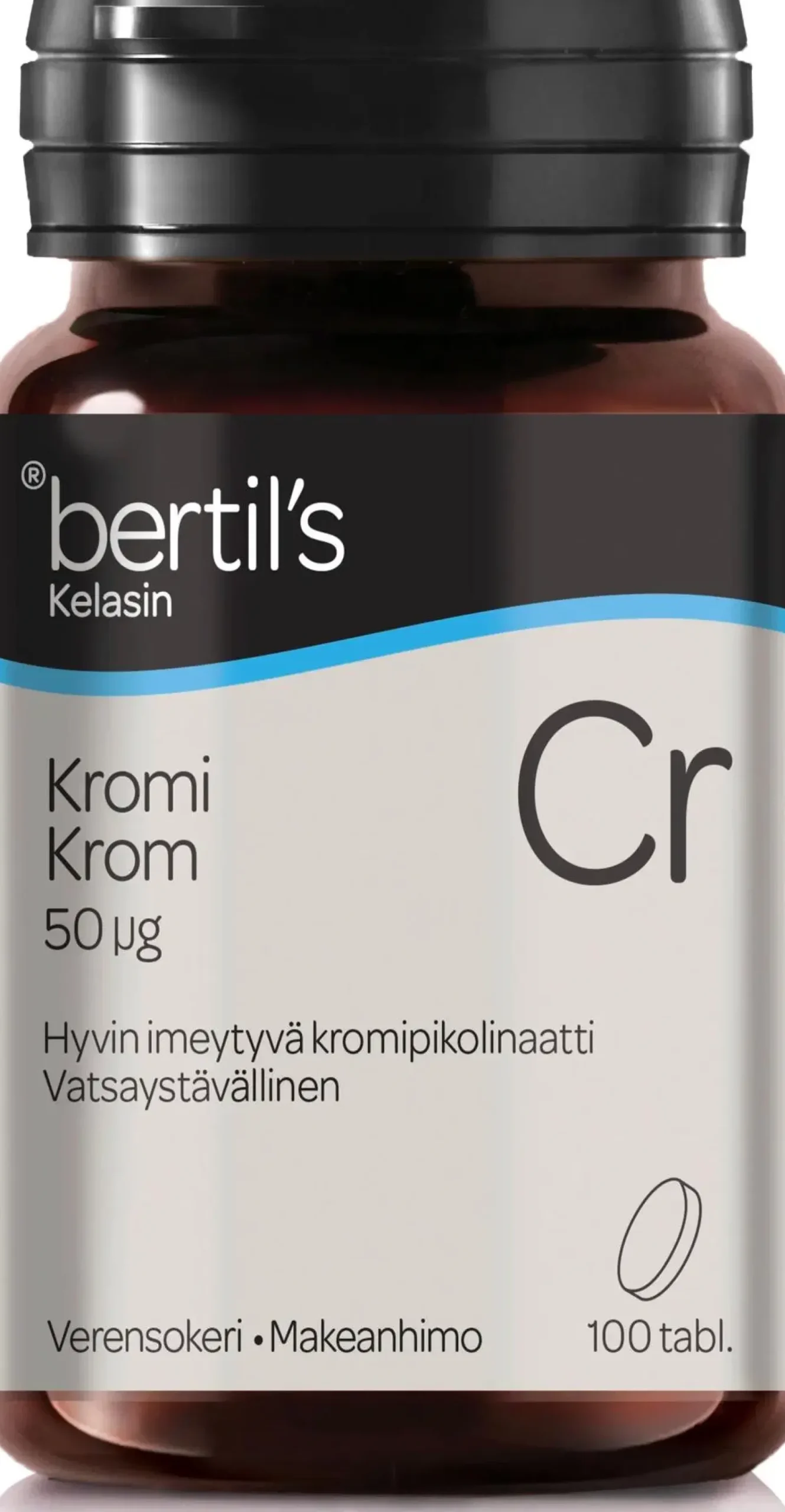 Kotimainen bertil’s Kromi sisältää kromipikolinaattia, joka on parhaiten imeytyvä kromin muoto eikä ärsytä vatsaa. Paras mahdollinen imeytyminen takaa kromille myös parhaat mahdolliset terveysvaikutukset. Kromia tarvitaan mm. tasapainoiseen sokeriaineenvaihduntaan.