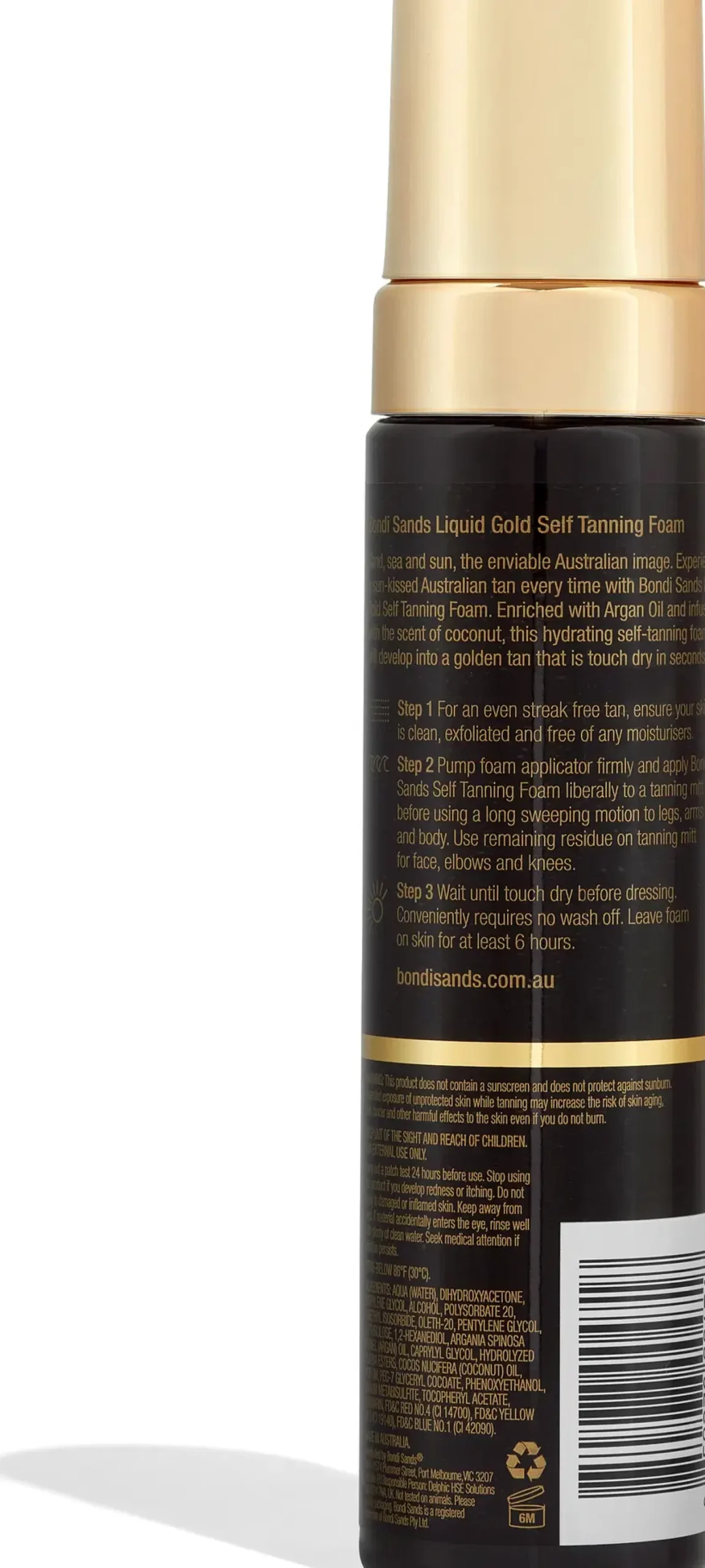 ”Merta, hiekkaa ja aurinkoa Australian tyyliin. Saat auringon suuteleman Australialaisen rusketuksen joka kerta Bondi Sands Liquid Gold Self Tanning Foam -vaahdon avulla. Arganöljyllä rikastettu ja kookospähkinältä
