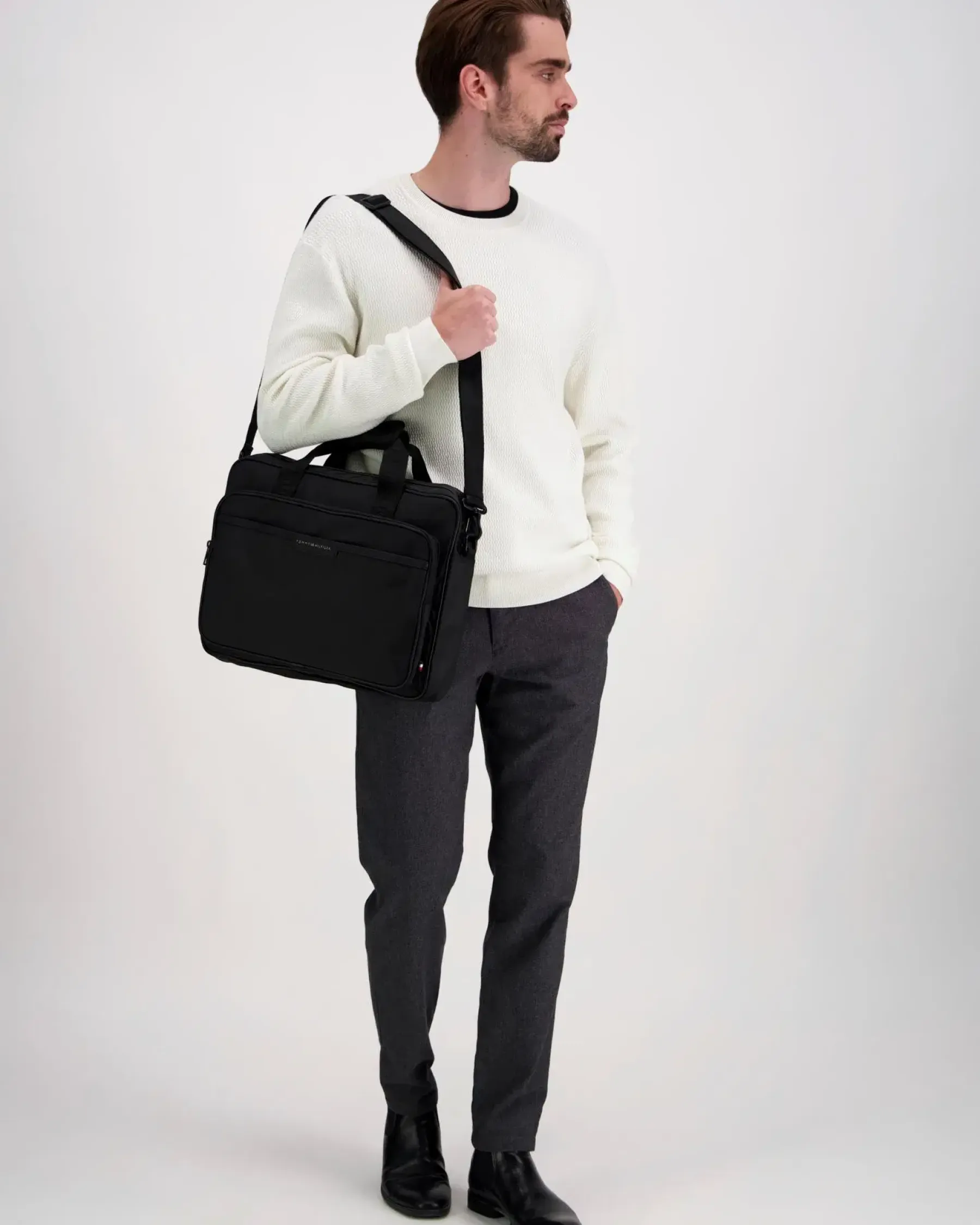 Materiaaliltaan kevyt tietokonelaukku tyylikäs valinta. Laukussa on useita taskuja ja lokeroita. Olan yli ulottuvan hihnan pituus on säädettävissä. Laukun saa tarvittaessa kätevästi kiinni vedettävään laukkuun.