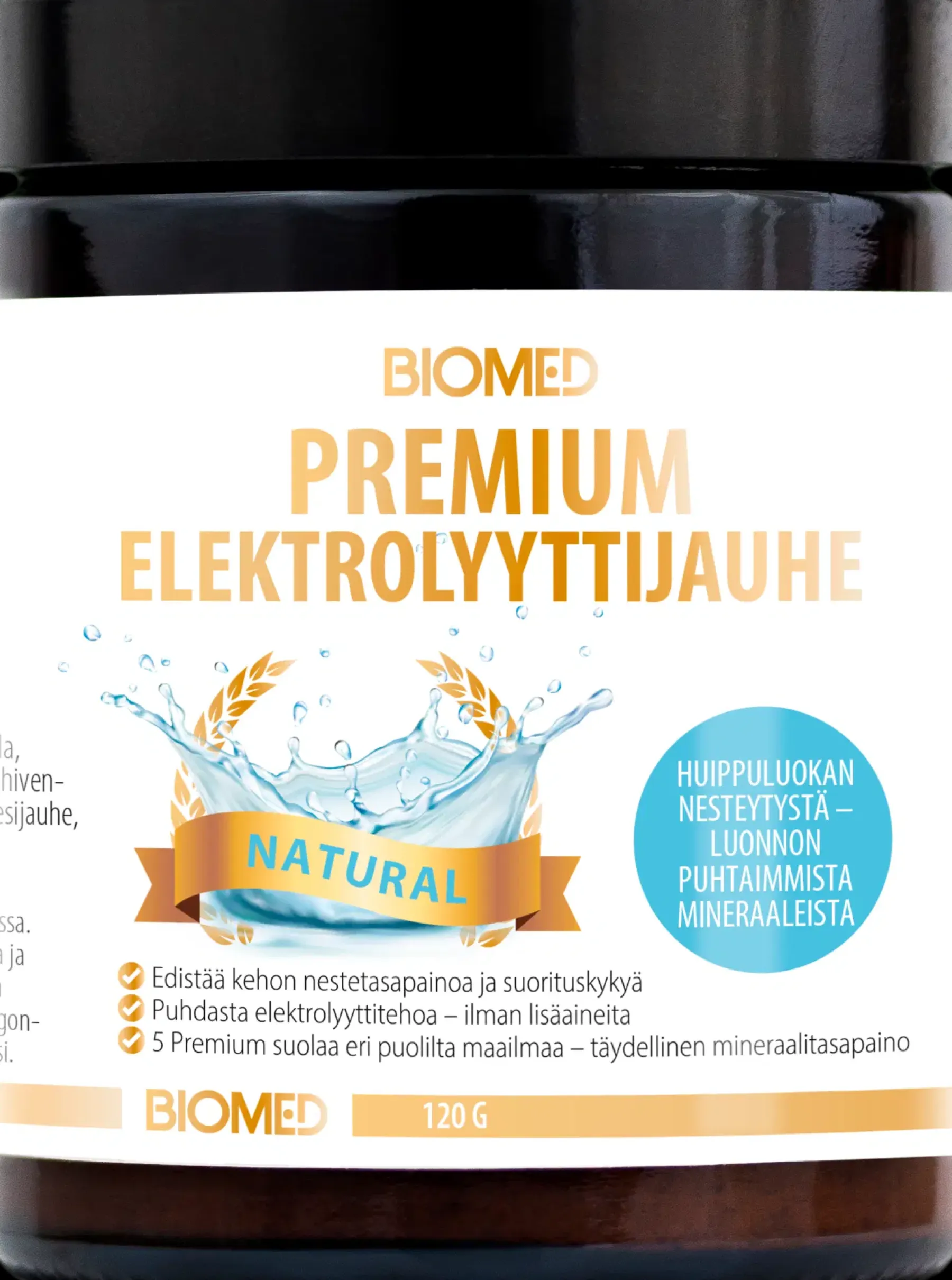 Elektrolyytit tukevat nestetasapainoa & lihas- ja hermotoimintaa – erinomainen valinta aktiiviseen elämään, paaston tueksi tai arjen hyvinvointiin. Biomedin Elektrolyyttijauhe tarjoaa tehokasta nesteytystä ilman kompromisseja. Sisältää viisi huippulaatuista, kokonaista luonnollista suolaa, joiden täydellinen ja tasapainoinen mineraaliprofiili tukee kehoa kokonaisvaltaisesti. Lisäksi mukana on palkittu Concentrace®-kivennäisuute, joka tuo mukanaan myös harvinaisia hivenaineita aidossa, luonnollisessa muodossa.