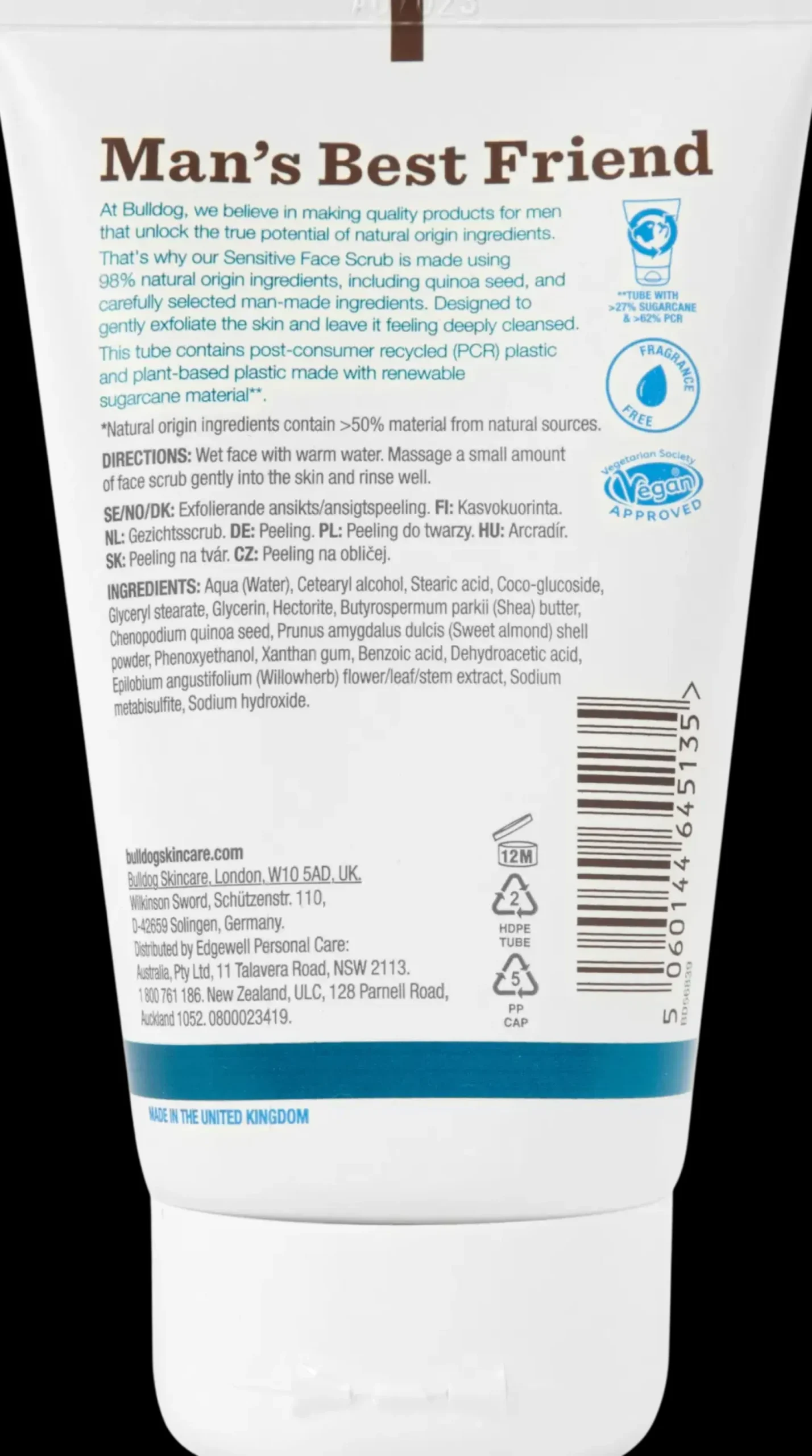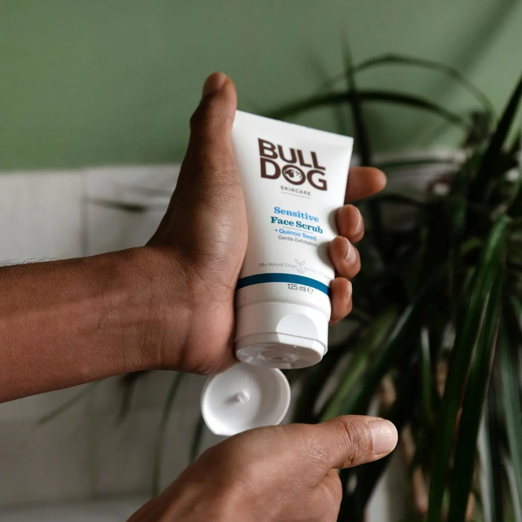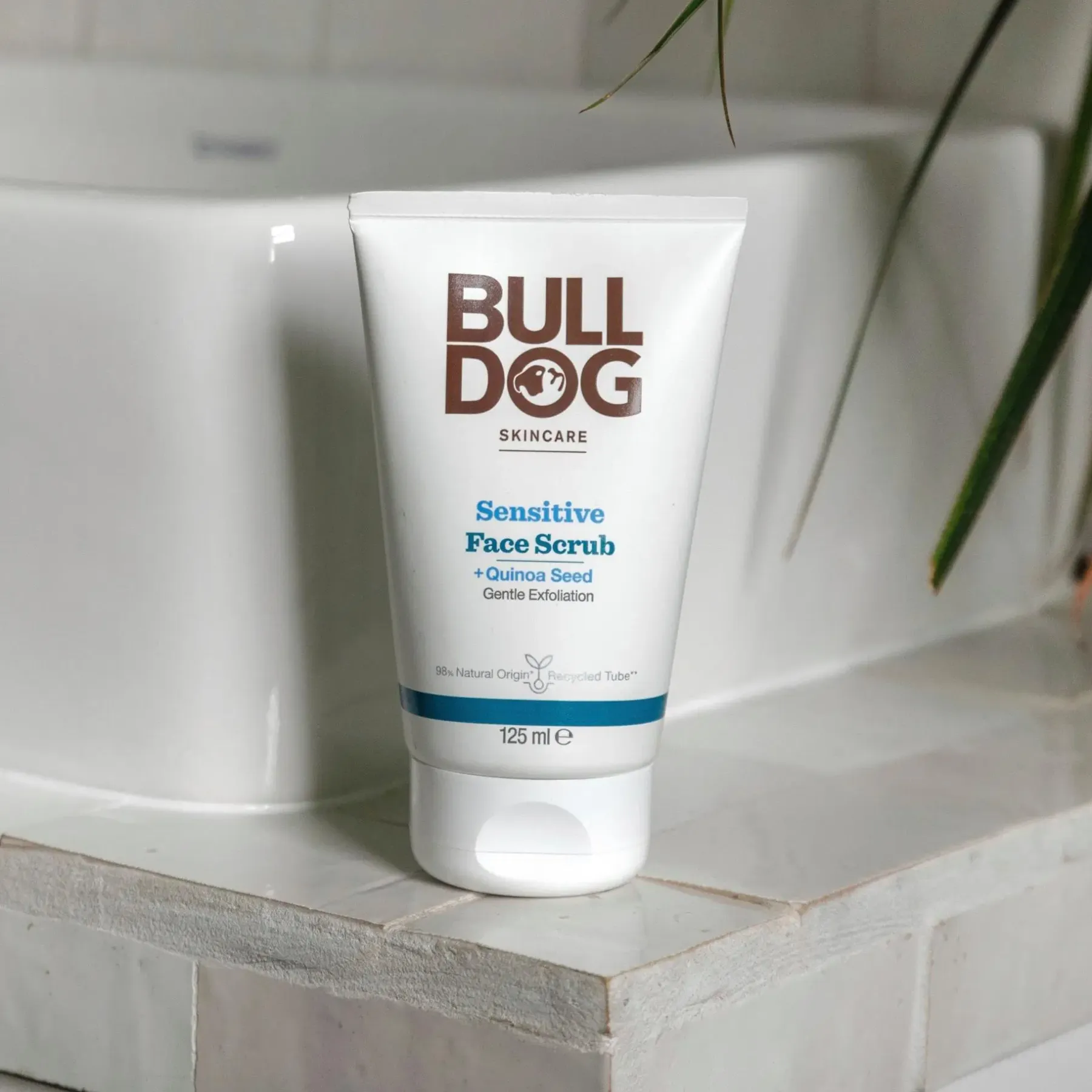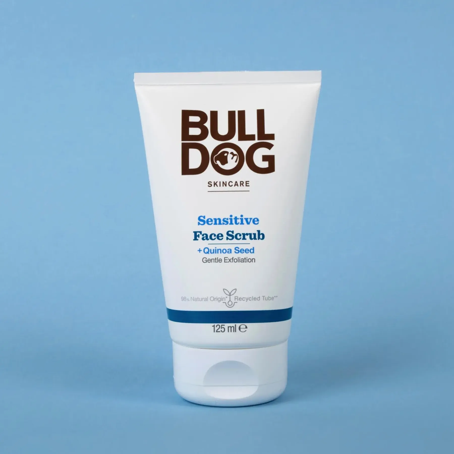 Bulldog Sensitive Face Scrub on hajusteeton kasvokuorinta miehille, joilla on herkkä iho. 98 % luonnollisia ainesosia, mukaan lukien kvinoan siemenet, luonnollinen kuorinta-aine hellävaraiseen kuorintaan. Kuorinta-aine on kehitetty poistamaan hellävaraisesti kuollutta ja kuivaa ihoa. Tuote sisältää myös Kanadan pohjoisilta preerioilta kotoisin olevaa ainutlaatuista horsmakasvia, joka on kehittänyt voimakkaita monikäyttöisiä fytokemiallisia ominaisuuksia selviytyäkseen ankarassa ilmastossa.