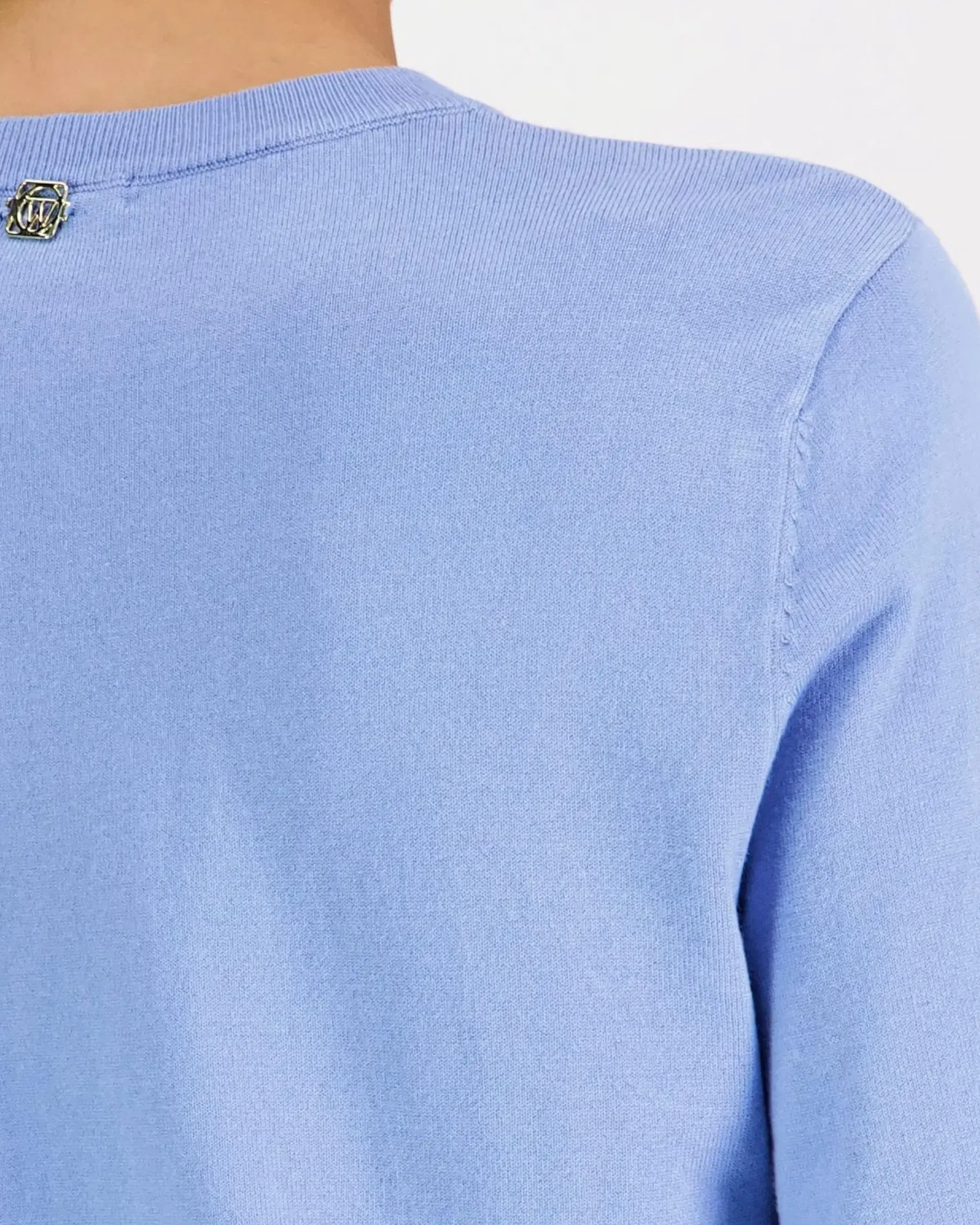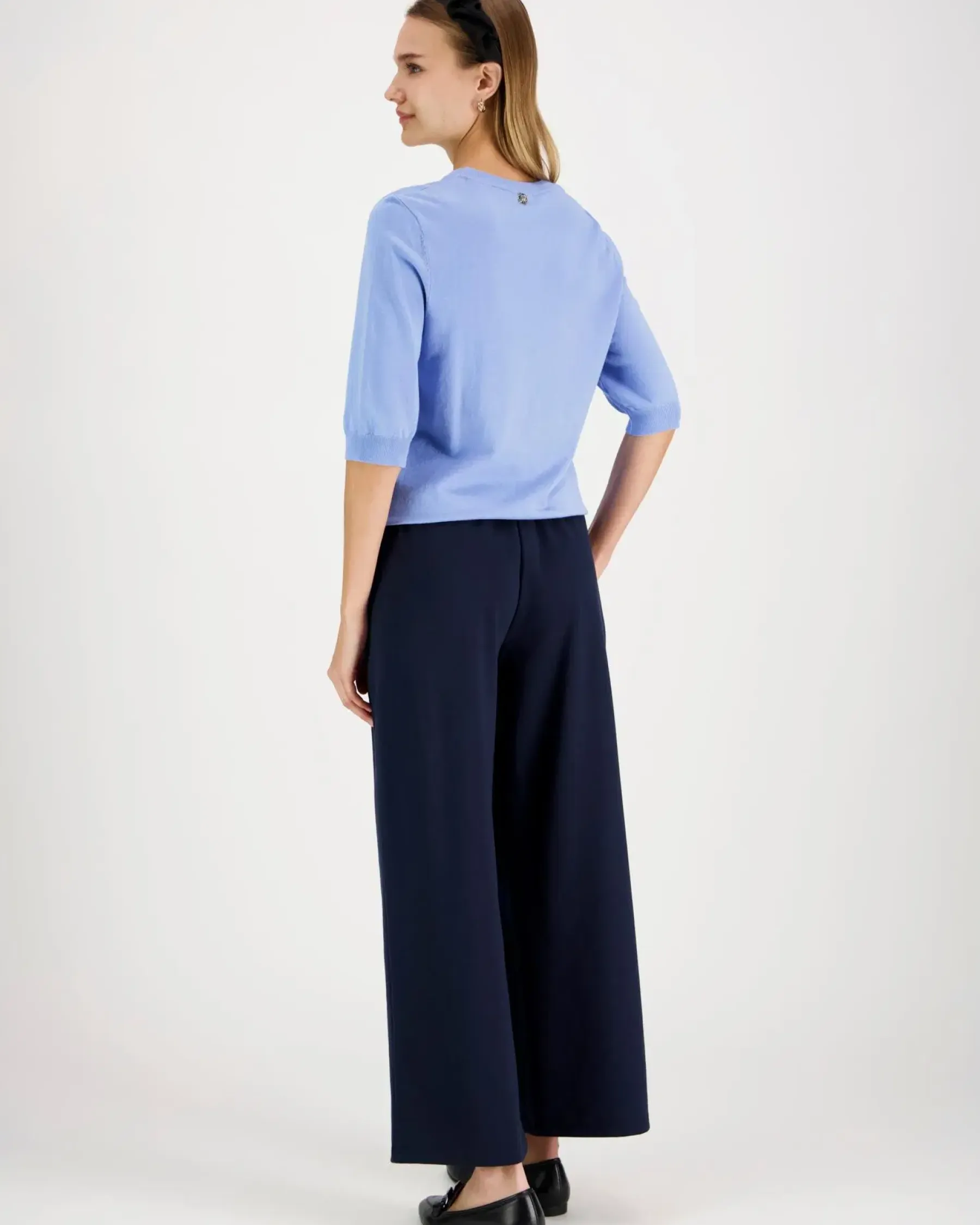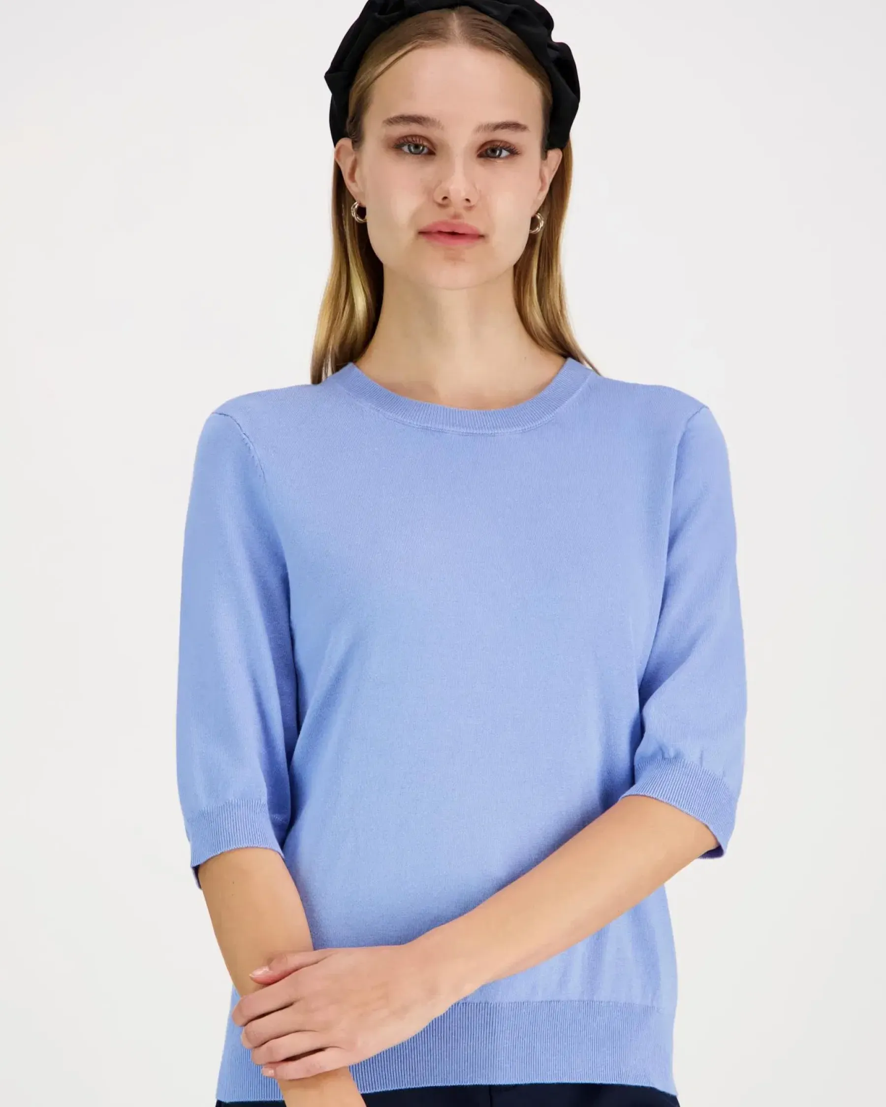 Viskoosisekoitteinen neulepusero, jossa käytännölliset vajaamittaiset hihat. Resorit o-pääntiellä, helmalla ja hihansuilla