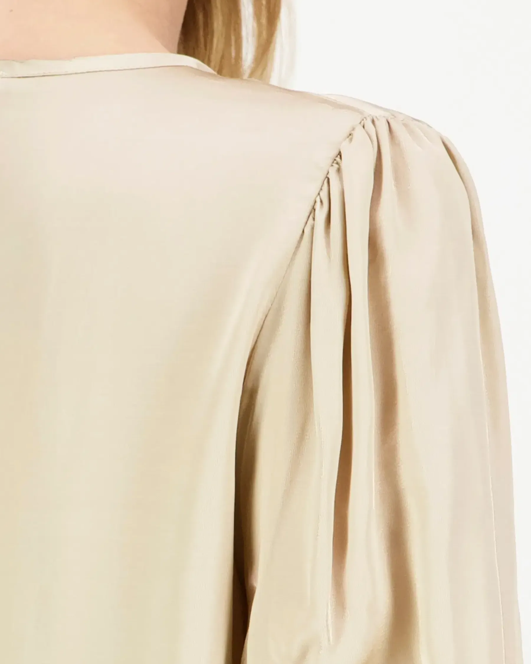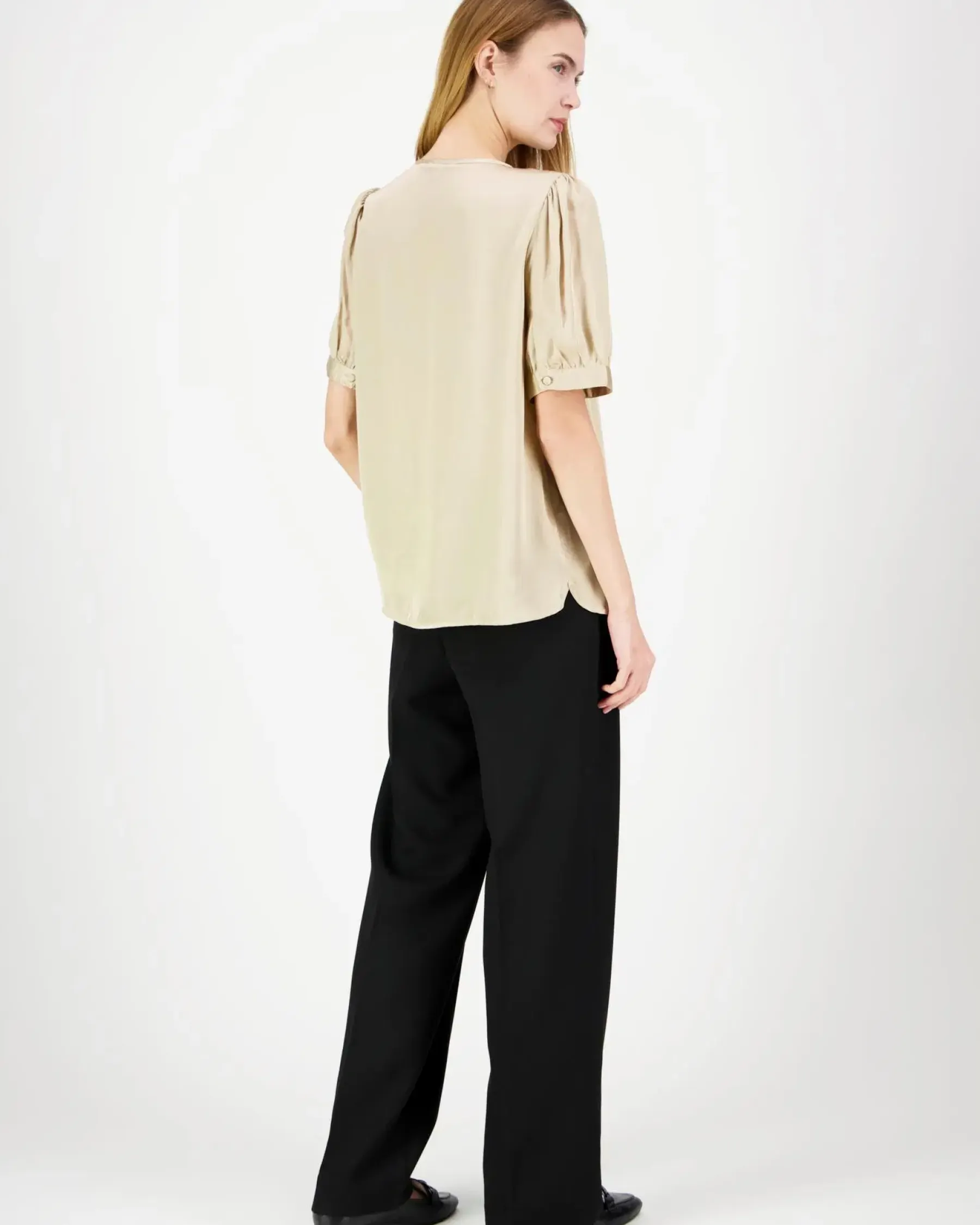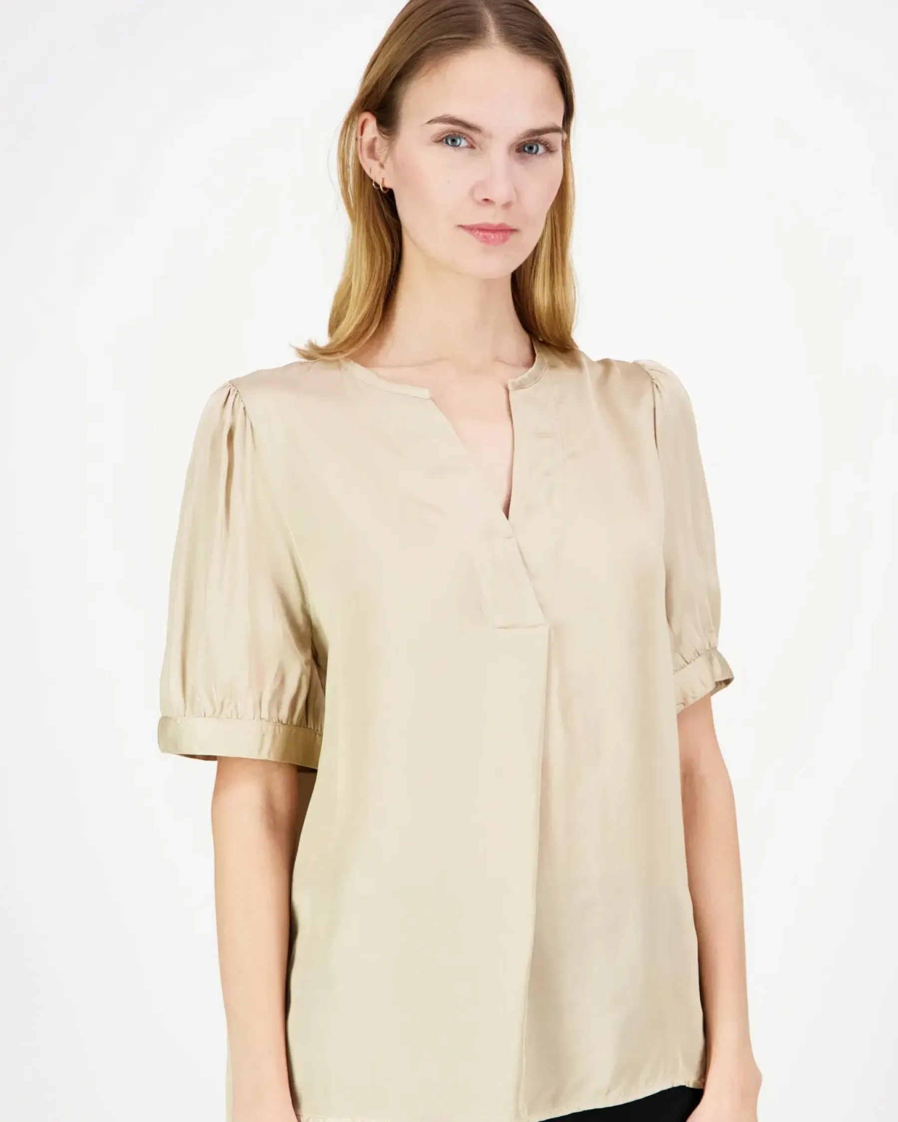 Satiiniviskoosinen, päänpäältä puettava pusero lyhyillä hihoilla ja pyöristetyllä helmalla. Puserossa on v-pääntie. Etuosalla kauniisti laskeutuva laskos.Hihansuilla takaosassa nappikiinnitys.