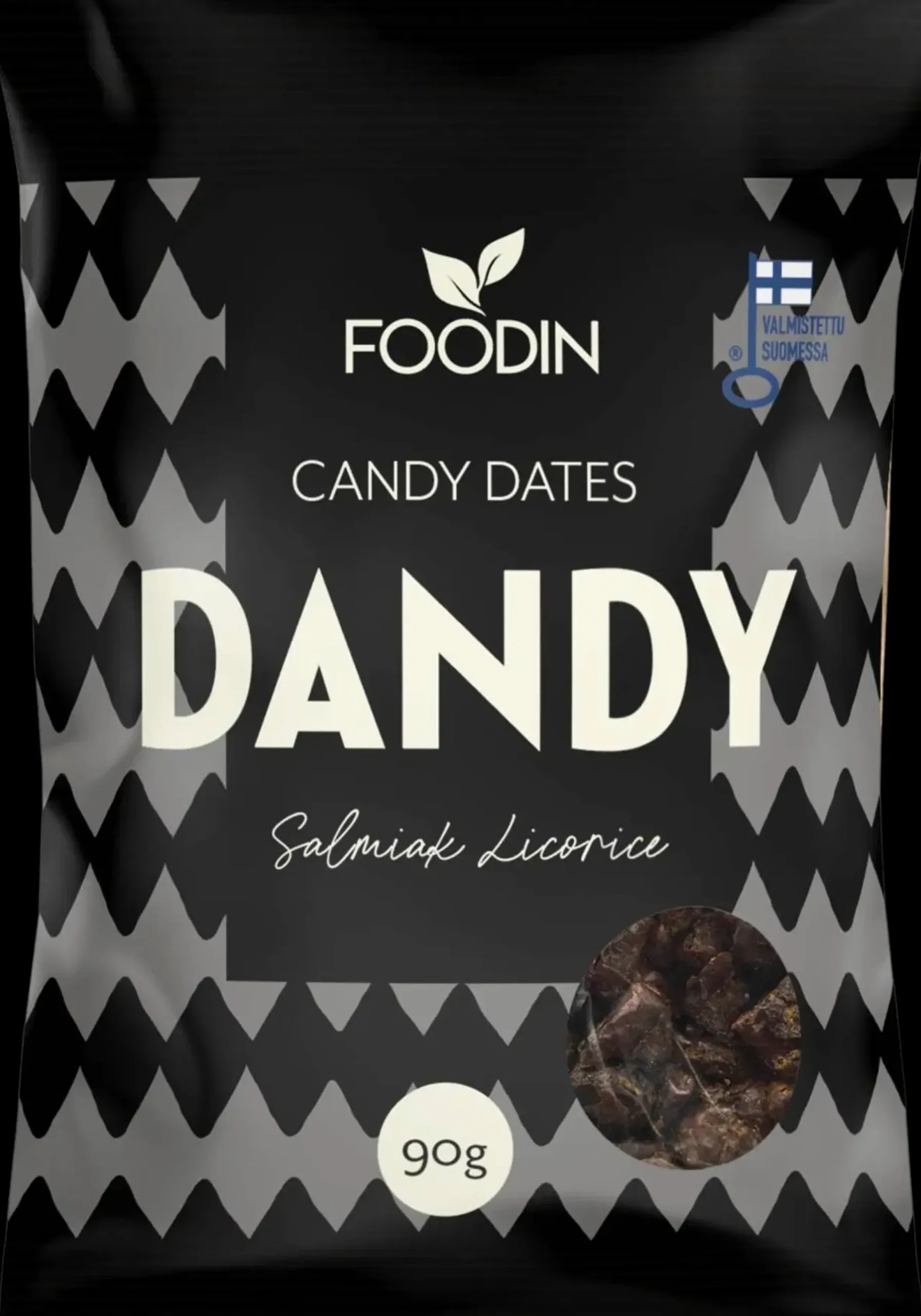 Foodinin Candy Dandy karkkitaatelit – parempaa kuin karkki! Salmiak Liquorice maussa taatelin luonnollinen makeus ja täyteläinen lakritsi luovat vastustamattoman makuelämyksen Karkkitaatelit sopivat karkin korvikkeeksi terveelliseen herkutteluun, naposteluun, välipalaksi ja kestävyysurheiluun energiaa antamaan.