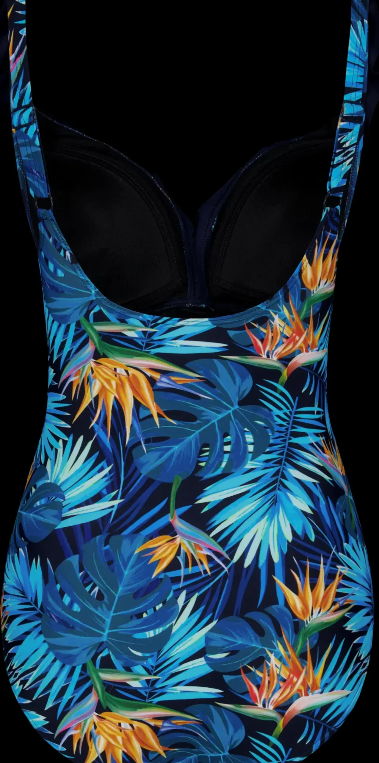 Uimapuku, topatut kupit, kaula-aukossa frilla koristelu, säädettävät olkaimet, etuosassa rypytystä, viidakkokuosi.