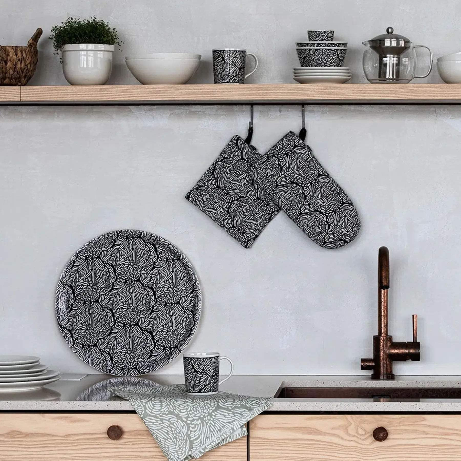 Minna Niskakankaan suunnittelema graafinen Jäkälä syntyi herkkää luonnon materiaalia katsellessa. Jäkälä henkii hiljaista vähäeleisyyttä ja tuo palan luontoa kotiisi. Mustavalkoinen tarjoitin on valmistettu koivuvanerista.