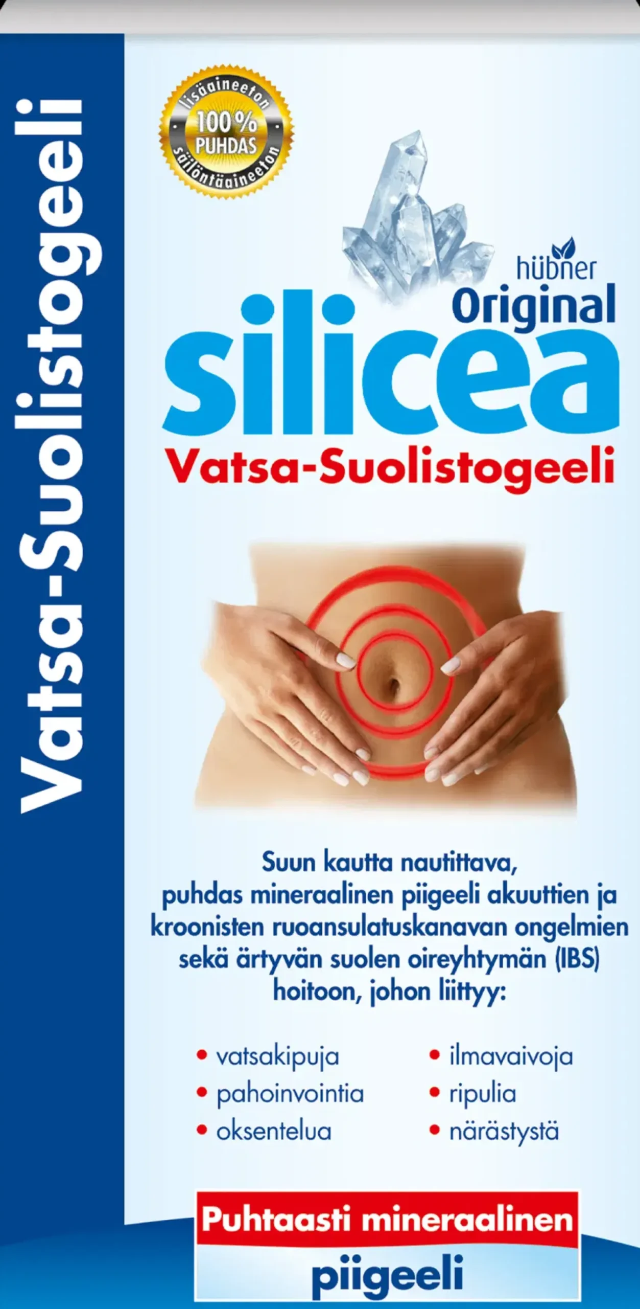 Suun kautta nautittava, puhtaasti mineraalinen piigeeli mahan ja suoliston ongelmien hoitoon, joihin liittyy vatsakipuja, pahoinvointia, oksentelua, ilmavaivoja, ripulia ja närästystä. Myös ärtyvän suolen oireyhtymän (IBS) hoitoon. Akuutteihin ja kroonisiin oireisiin. Sopii lapsille ja aikuisille. Silicea Vatsa-Suolistogeelin voi ottaa sellaisenaan tai veteen sekoitettuna aterioiden välissä. Lisä- ja säilöntäaineeton. Silicea vatsa-suolistogeeli on CE-merkitty lääkinnällinen laite (CE0297). Valmistaja Anton Hübner GmbH.