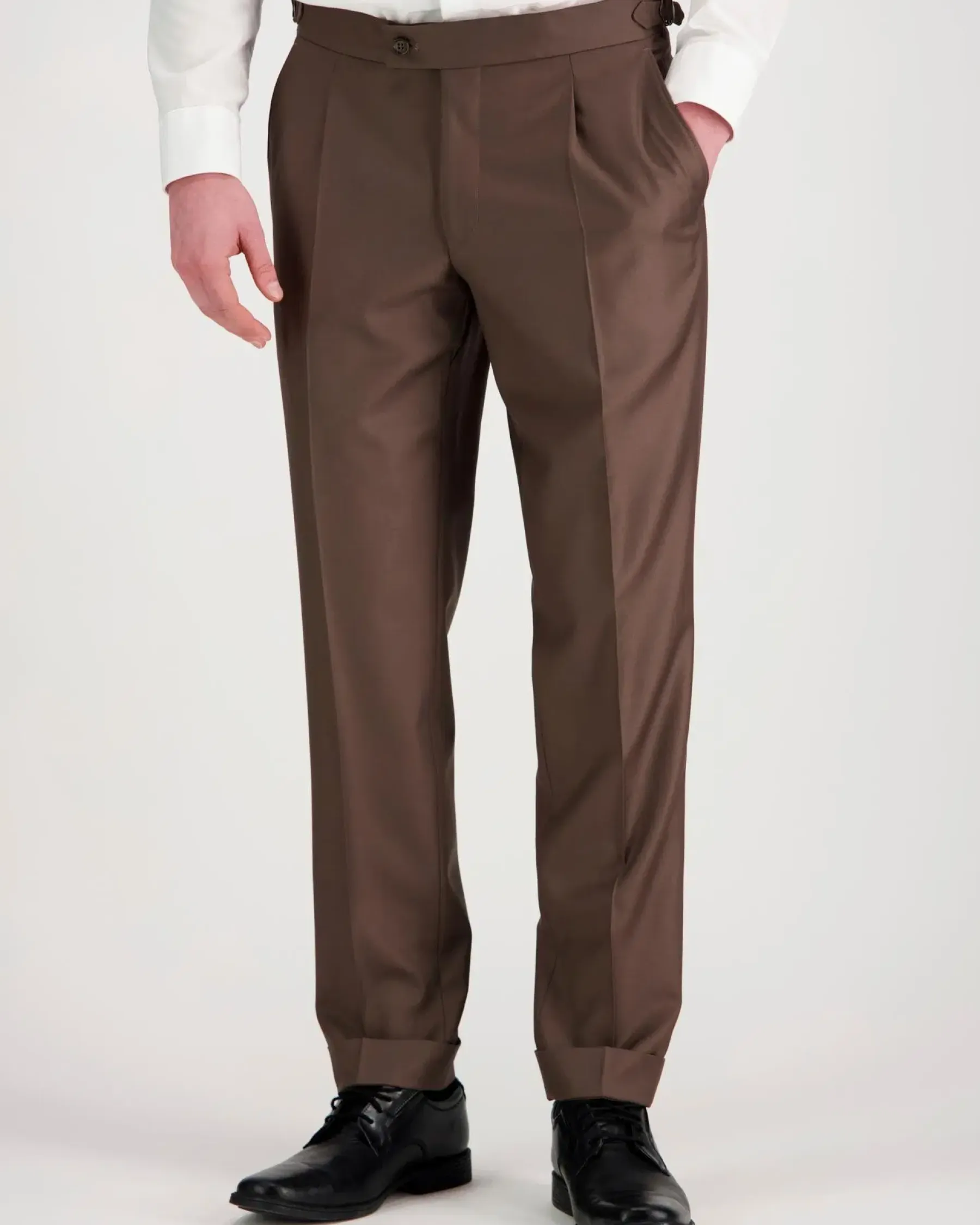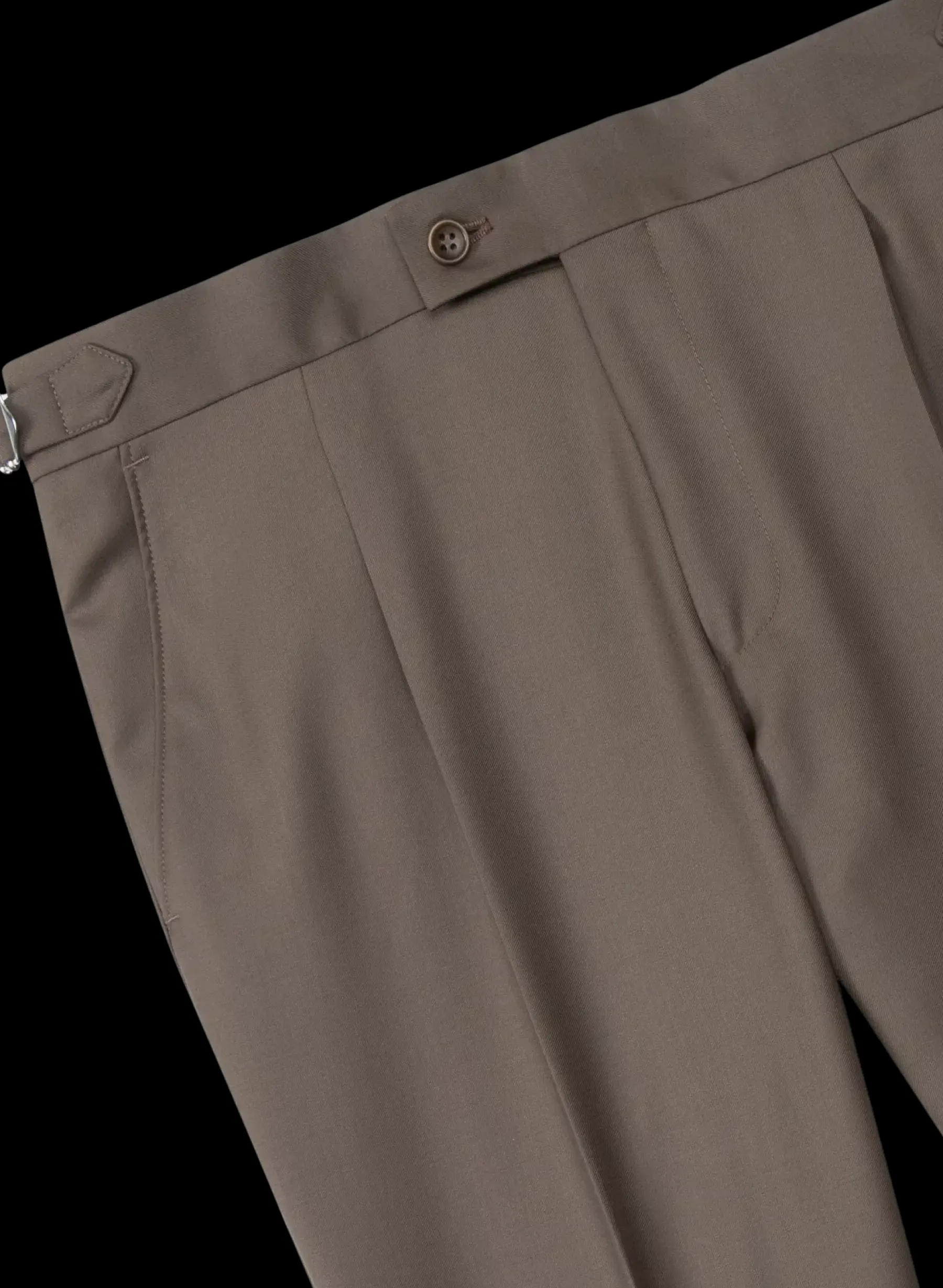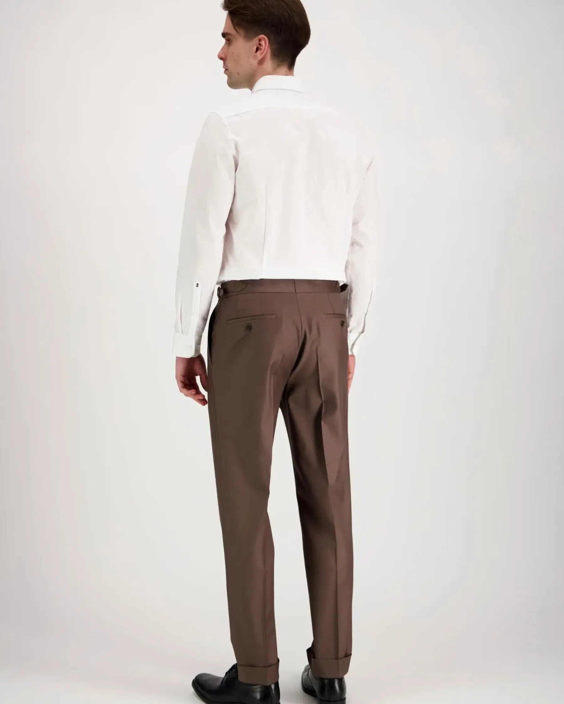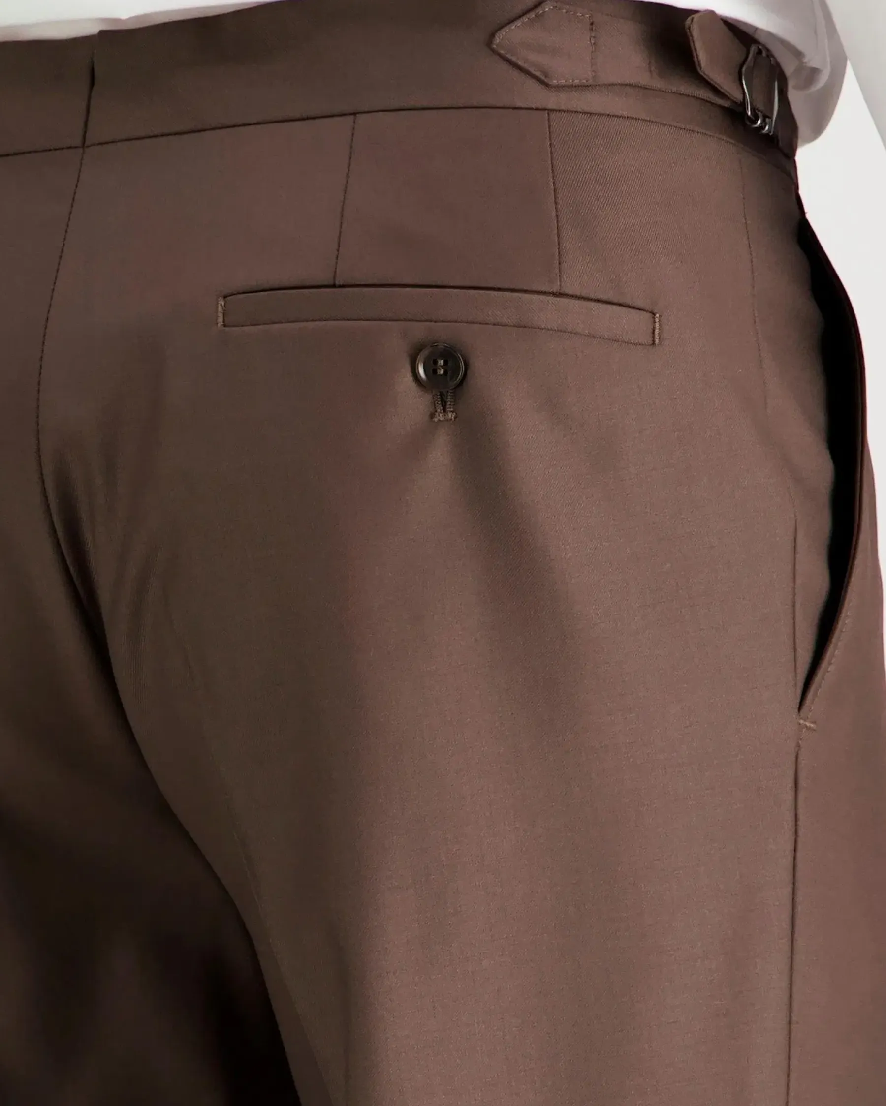 Puvunhousut, jotka on yhdistettävissä näyttävän kaksirivisen Jan 7574 puvuntakin kanssa. Kankaan vaaleanruskea väri on täysin ainutlaatuinen ja sen on ensiluokkaisesta merinovillasta kutonut italialainen Vitale Barberis Canonico. Slim fit -leikkaus on suunniteltu istumaan arvokkaasti hoikalle tai urheilulliselle keholle. Takin pituus koossa 52 on 76cm.