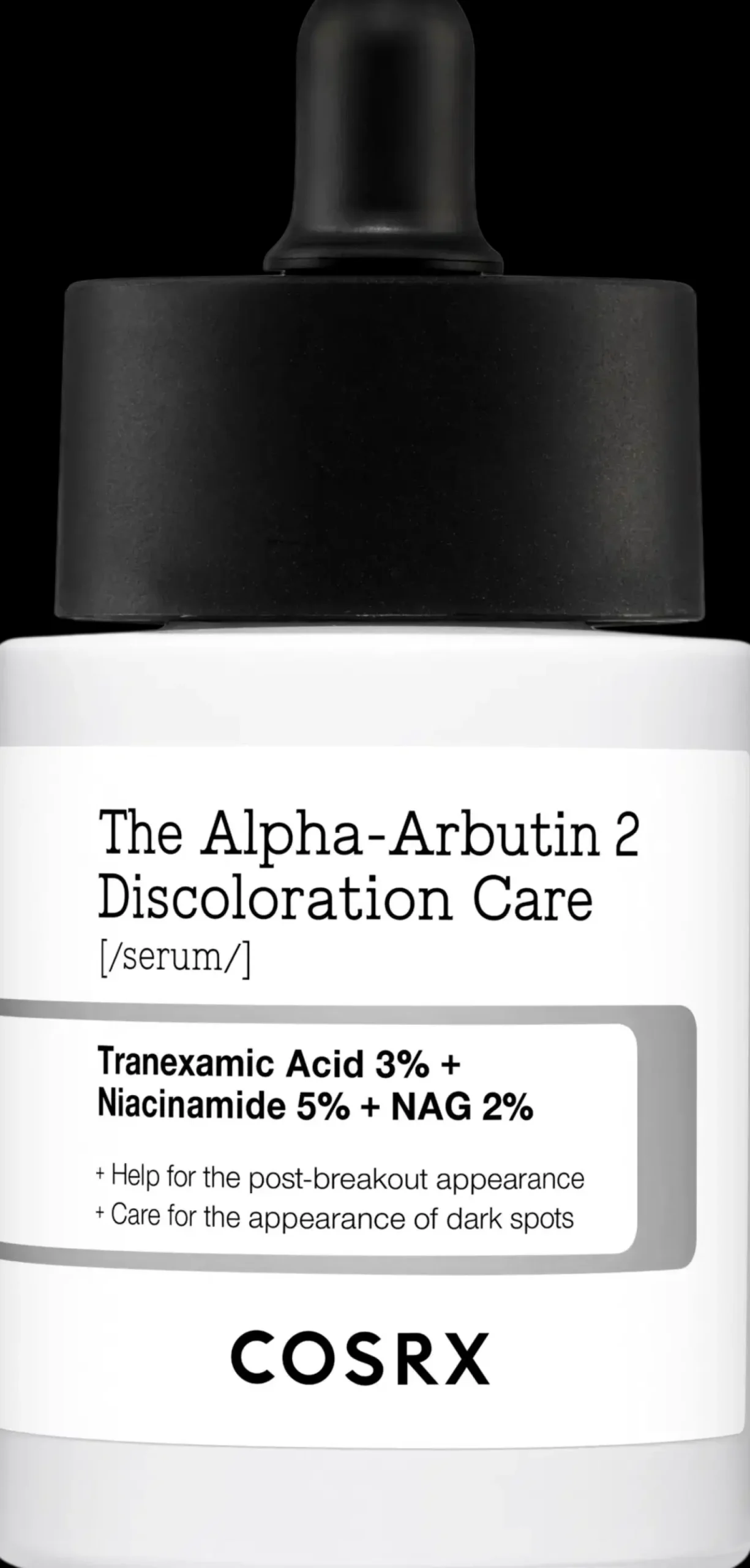 COSRX The Alpha-Arbutin 2 Discoloration Care Serum on tehoseerumi aknearpien ja ihon pigmenttimuutosten hoitoon. Sen teho kohdistuu jokaiseen pigmenttimuutoksen muodostumisen vaiheeseen, samalla rauhoittaen ja kosteuttaen ihoa. Tuote sopii parhaiten iholle, jolla esiintyy epäpuhtauksia, aknearpia tai pigmenttiläiskiä. Tuote on ei-komedogeeninen (ei tuki ihohuokosia), sopii herkällekin iholle ja sen teho on kliinisesti testattu.