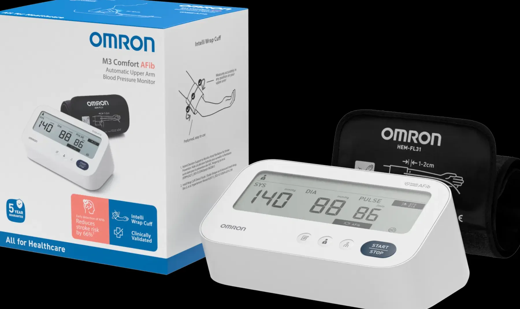 Uudistunut Omron M3 Comfort AFib havaitsee eteisvärinän. Se ilmoittaa jokaisella mittauskerralla, mikäli rytmihäiriöitä havaitaan. Lisäksi siinä on myös erillinen AFib-tila eteisvärinän tunnistamiseen. Siinä mittari tekee automaattisesti kolme peräkkäistä mittausta ja näyttää niiden keskiarvon. Jos eteisvärinän mahdollisuus on olemassa, näkyviin tulee eteisvärinän ilmaisimen symboli. Mukana tuleva Intelli Wrap -mansetti mittaa tarkasti 360 asteen alueelta ja sopii olkavarsille, joiden ympärysmitta on 22–42 cm. Mansetin asettaminen on helppoa ja mittaustulos aina tarkka. Laite on validoitu ja hyväksytty myös diabeetikoille sekä raskauden ja raskausmyrkytyksen aikana. Valkoinen nuolisymboli näyttää, jos verenpaine ylittää tavoitearvon (135/85). OK-LED-symboli varmistaa, että mansetti on oikein kiinnitetty. Mittaustulos näkyy suurikokoisella näytöllä yhdellä painalluksella. IntelliSense-teknologia tekee mittauksesta nopean ja kivuttoman. Muisti kahdelle käyttäjälle, 60 tulosta per käyttäjä. Ilmoittaa epäsäännöllisestä sykkeestä ja liiallisesta liikkumisesta mittauksen aikana. Laskee automaattisesti kolmen viimeisen mittauksen keskiarvon. Pakkauksessa: laite, mansetti, säilytyspussi, paristot ja käyttöohjeet. 5 vuoden takuu.