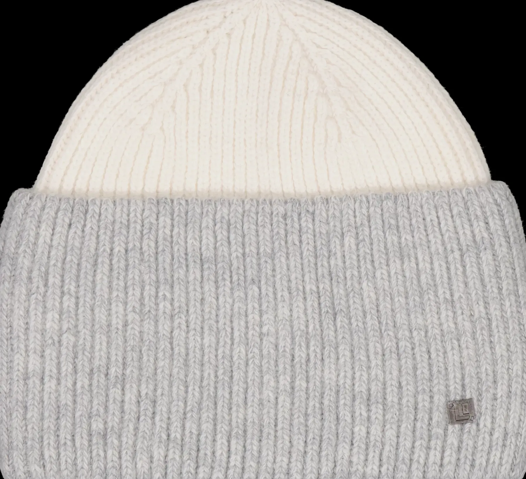 Kaksivärinen angora-sekoitteinen neulepipo. Paksu ribbineulos ja reilu käänne tekevät piposta lämpimän.
