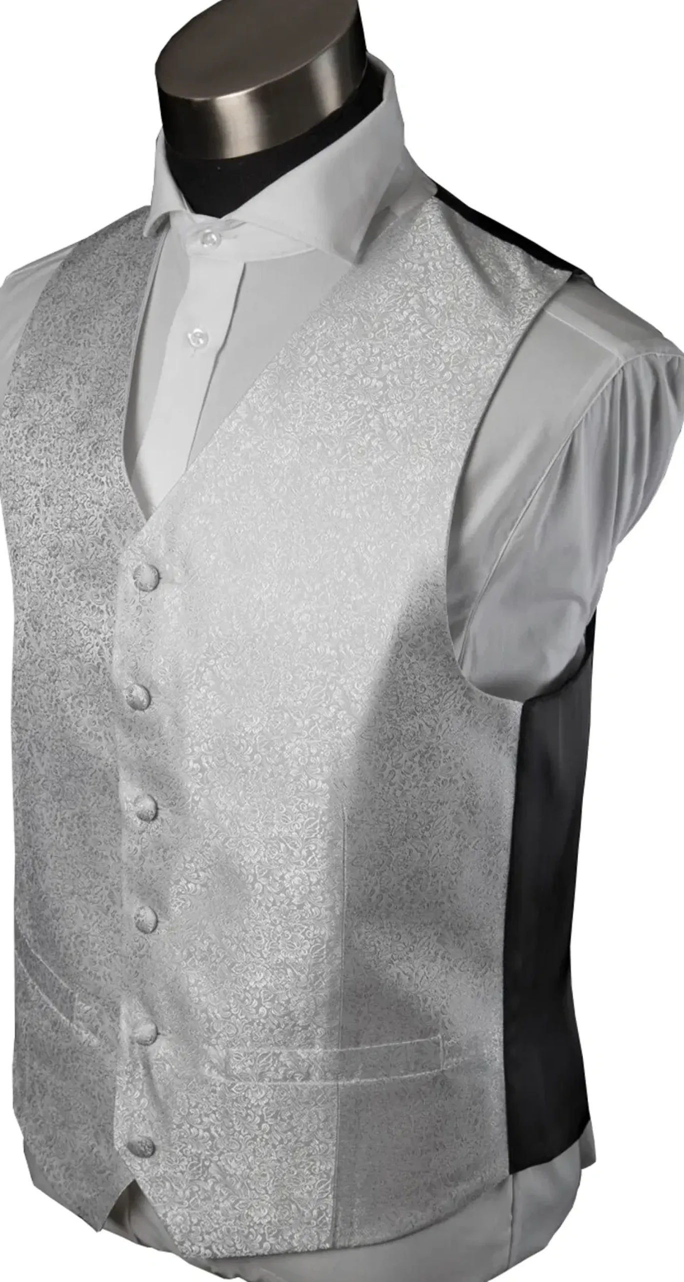 Jaquard-kudottu juhlaliivi mustalla selkäkappaleella. Liivin takana säätövara.