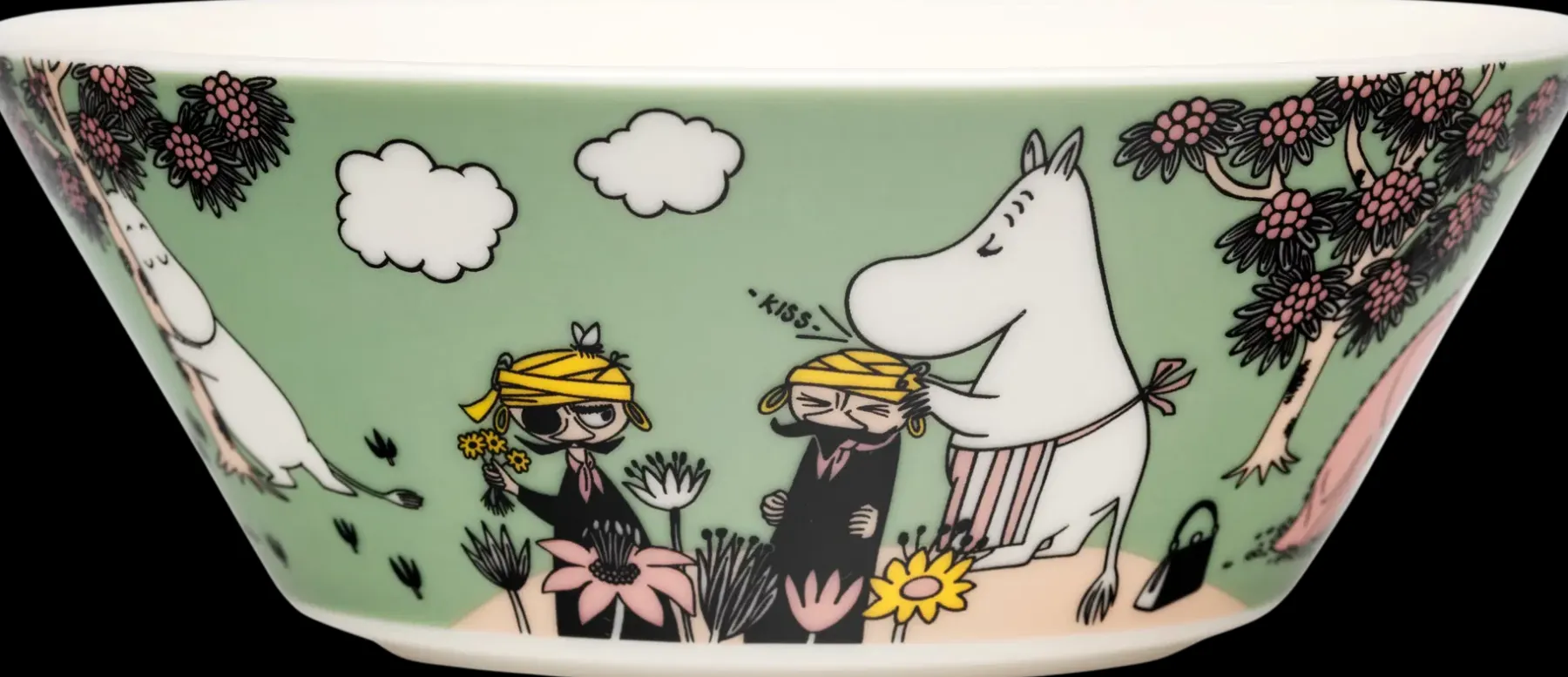 Hellyys-kulhon kuvitus kuvastaa muumiperheen henkeä – jokainen otus Muumilaaksossa on rakkauden ja huolenpidon arvoinen. Mukin kuvituksessa piknik-retki muuttuu rohkeaksi pelastusoperaatioksi, jossa Muumit pelastavat haaksirikkoutuneita matkustajia. Moomin Arabia kulho 15cm, Hellyys