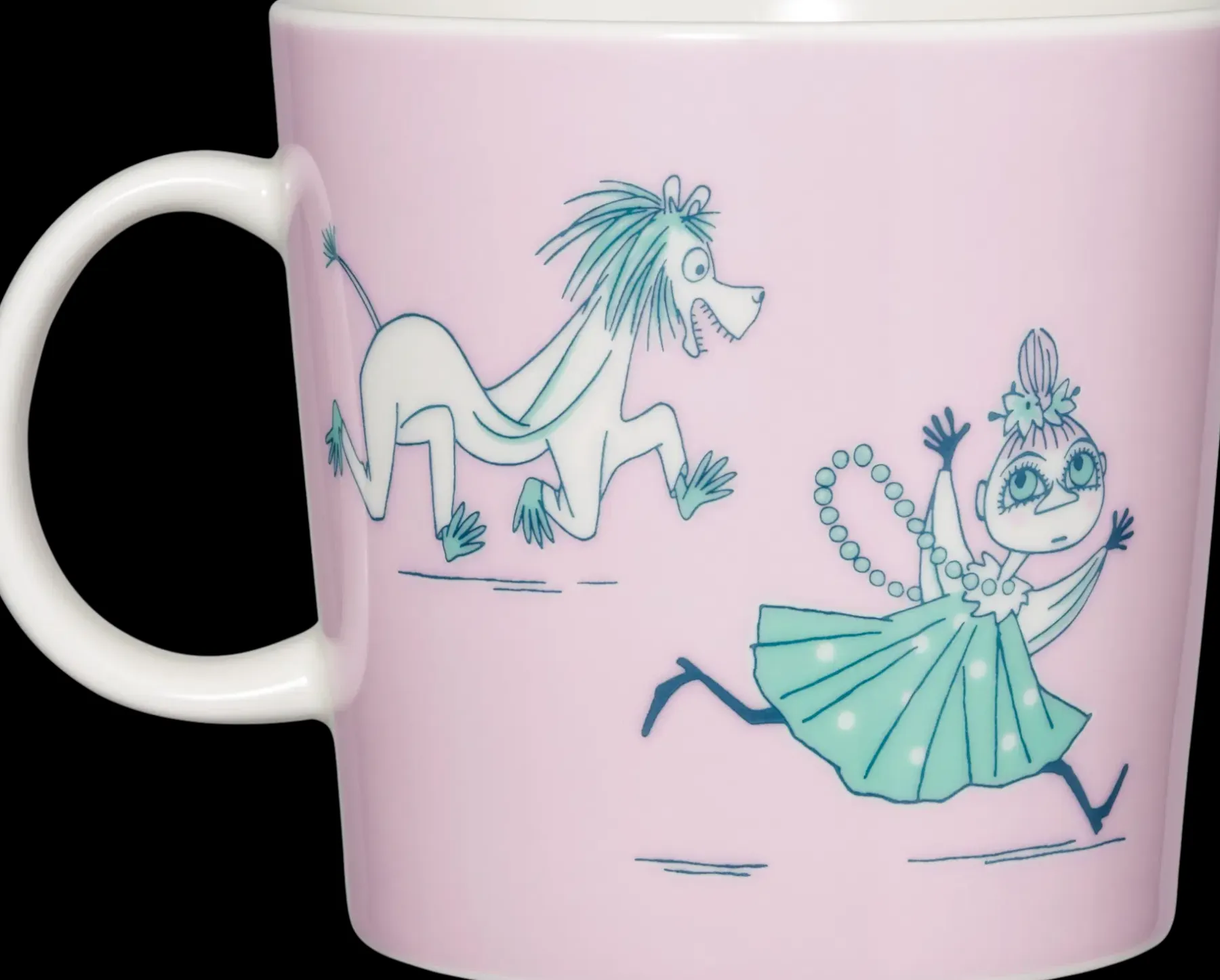 S-mukissa teatterirotta Emma tarkkailee piilopaikastaan vieraidensa erikoista käytöstä. Vanhasta sängynpeitteestä naamionsa saanut jalopeura jahtaa Mymmeliä lavalla. Kaltevan lattian takia tiskit on naulattu siihen kiinni ja naulaaminen on rikkonut astiat. Emma paheksuu näkemiään outouksia. Moomin Arabia, muki 0,4l, ABC S
