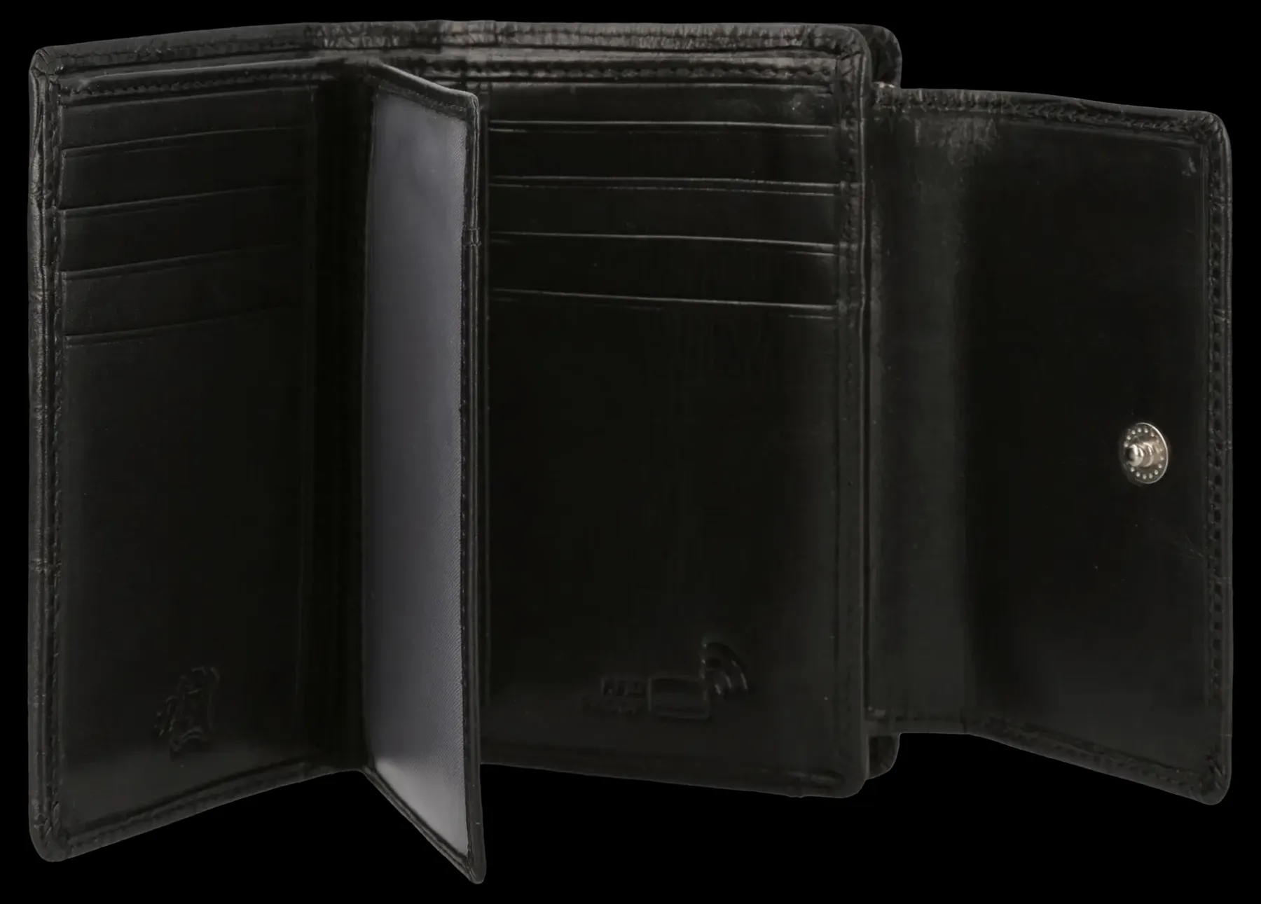 Tyylikäs nahkalompakko monipuolisilla taskuilla. Nepparikiinnitteisen läpän alla on yhdeksän ylöspäin aukeavaa korttipaikkaa, kolme keskelle aukeavaa korttipaikkaa sekä iso ikkunallinen korttipaikka. Lisäksi myös muita välejä. Taustalla seteliväli. Lompakon takapuolella on kaksiosainen vetoketjullinen kolikkopuoli. RFID-suojaus estää lähimaksukorttien luvattoman etäluvun.