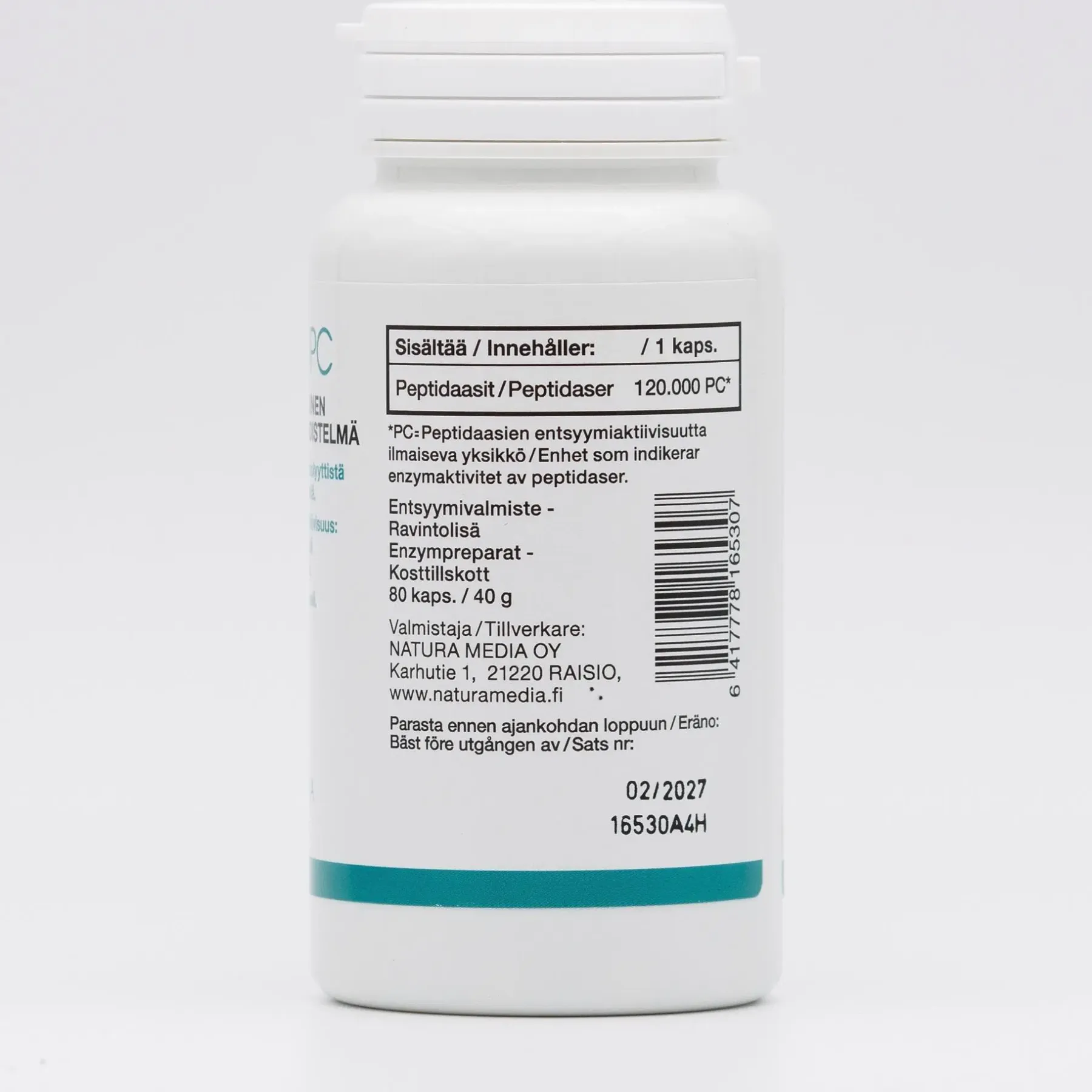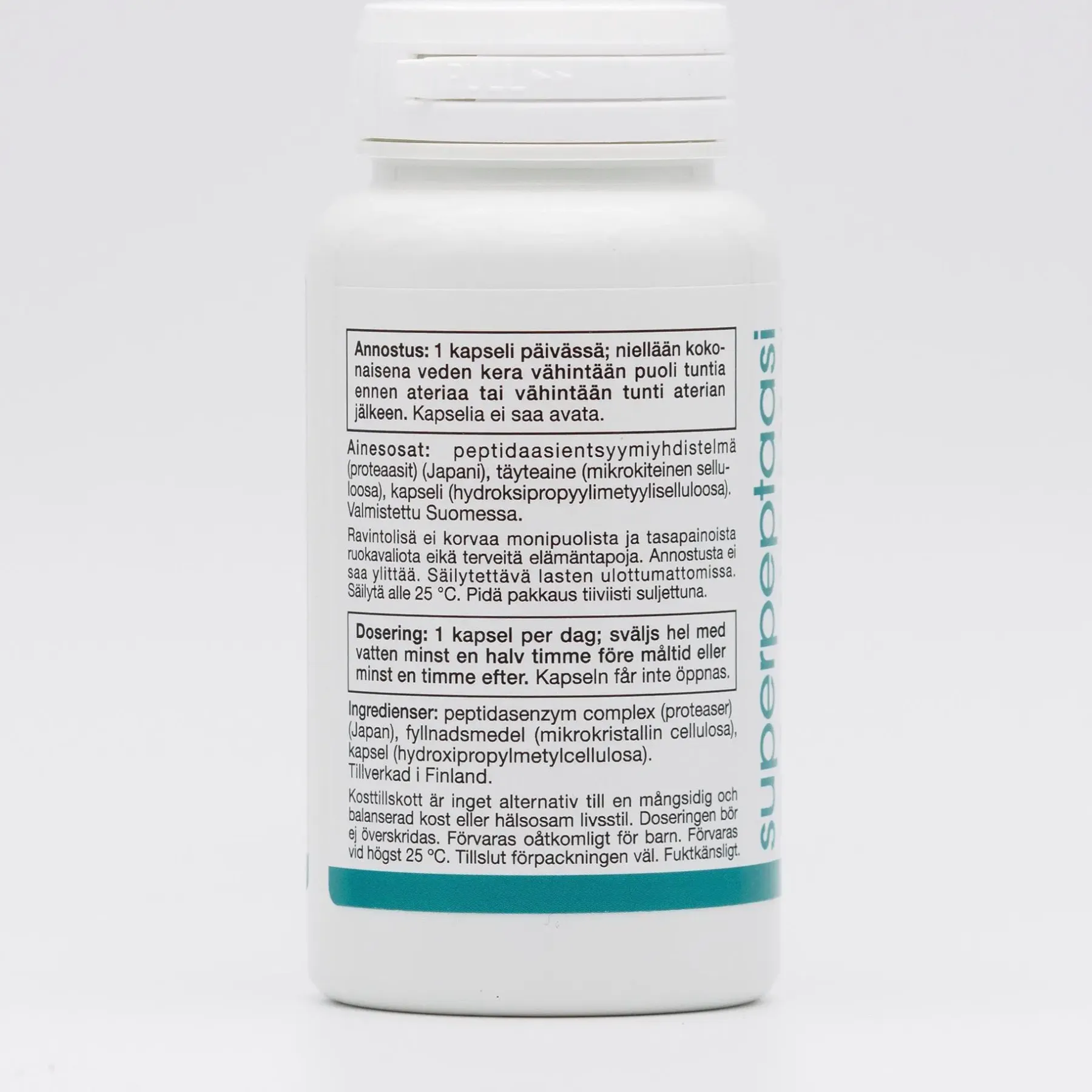 Proteolyyttinen peptidaasiyhdistelmä Japanista. Serrapeptaasin kaltainen toimintamekanismi. Superpeptaasi 120.000 PC on peptidaasiyhdistelmä, jolla on proteolyyttinen, serrapeptaasin (serratiopeptidaasin) kaltainen toimintamekanismi. Peptidaasit, jotka kuuluvat proteaaseihin, ovat proteiineja pilkkovia entsyymejä. Proteiineja pilkkovaa entsyymiä kutsutaan myös proteolyyttiseksi entsyymiksi. Superpeptaasi 120.000 PC -peptidaasiyhdistelmään on valittu kaksi peptidaasia, joilla saavutetaan samankaltainen proteolyyttinen toimintamekanismi kuin serratiopeptidaasilla. Yksi Superpeptaasi 120.000 PC-kapseli vastaa vahvuudeltaan 180.000 U serrapeptaasia. Valmistamme Superpeptaasi 120.000 PC-kapselit omassa tuotantolaitoksessamme Raisiossa. Raaka-aineena käyttämämme peptidaasiyhdistelmän hankimme korkeita kriteerejä noudattaen Japanista, josta myös serratiopeptidaasi on alunperin lähtöisin. Superpeptaasi 120.000 PC eroaa serrapeptaasista peptidaasien valmistustavan kautta. Superpeptaasi 120.000 PC:n peptidaasit on valmistettu Aspergillus melleus- ja Aspergillus oryzae-fermentoinnilla, kun taas serrapeptaasin peptidaasi (serratiopeptidaasi) on valmistettu Serratia marcescens E15-fermentoinnilla. Ainesosat: Peptidaasientsyymiyhdistelmä (proteaasit) (Japani), täyteaine: mikrokiteinen selluloosa, kapseli: hydroksipropyylimetyyliselluloosa. Sisältää/1 kaps.: Peptidaasit 120.000 PC* (*PC = peptidaasien/proteaasien aktiivisuuden yksikkö).