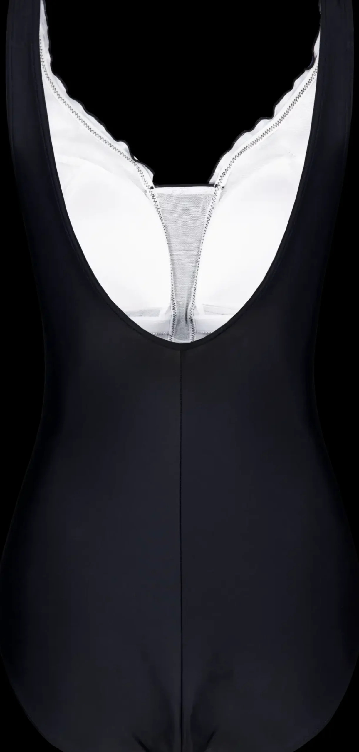 Uimapuku, topatut kupit, drapeerausta edustassa, etuosassa lehtikuosi, powernet vuoraus, jolla on hoikentava vaikutus, etuosassa lehtikuosi.