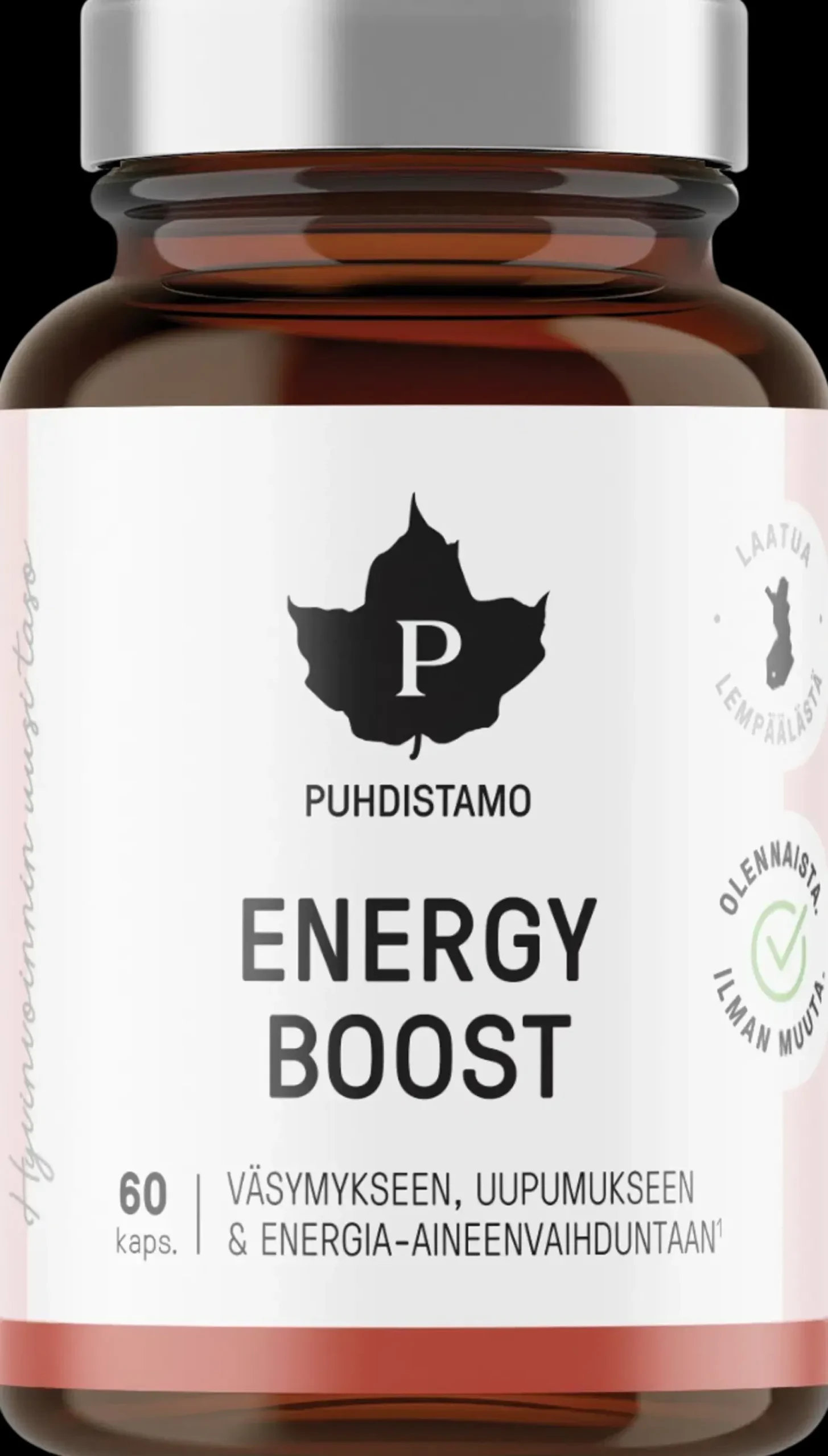 Puhdistamon EnergyBoost on kokonaisvaltaisesti kehon energiantuotantoa tukeva yhdistelmävalmiste. Niasiini ja riboflaviini edistävät normaalia energia-aineenvaihduntaa ja auttavat vähentämään väsymystä ja uupumusta. EnergyBoost sopii erityisen hyvin käytettäväksi yhdessä Smart Multi -monivitamiinin kanssa.