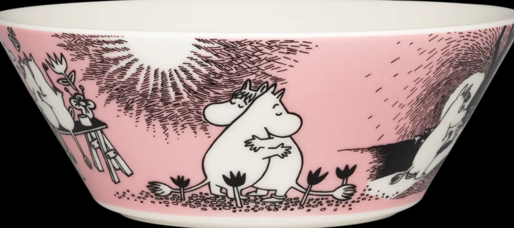 Rakkaus 30 -kulhoa koristaa kuvitus, jossa Niiskuneiti ja Muumipeikko halaavat. He ovat hyviä ystäviä ja leikkikavereita – ja joskus enemmänkin. Kulhon pohjassa on erityinen Rakkaus 30 -pohjaleima. Moomin Arabia kulho 15cm, Rakkaus 30