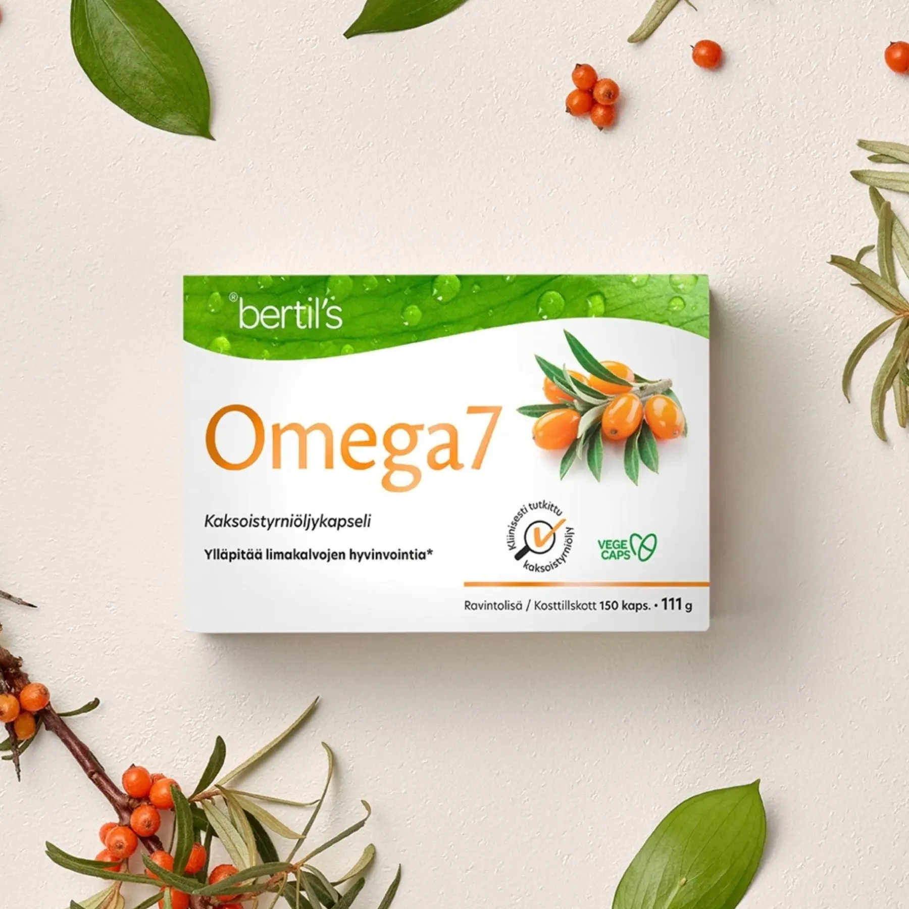Terveet limakalvot ja iho ovat monin tavoin olennaiset elimistön hyvinvoinnin kannalta. Korkealaatuiset Omega7 Kaksoistyrniöljykapselit tukevat limakalvojen ja ihon hyvinvointia sisältämiensä rasvahappojen, kasvisteroleiden ja antioksidanttien avulla. Tuotteen sisältämä erityislaatuinen kaksoistyrniöljy tarjoaa täyden hyödyn tyrnimarjan poikkeuksellisista ravitsemuksellisista ominaisuuksista, sillä se sisältää molemmat tyrnimarjan sisältämät öljyt – sekä tyrnimarjan hedelmälihan että siementen öljyn.