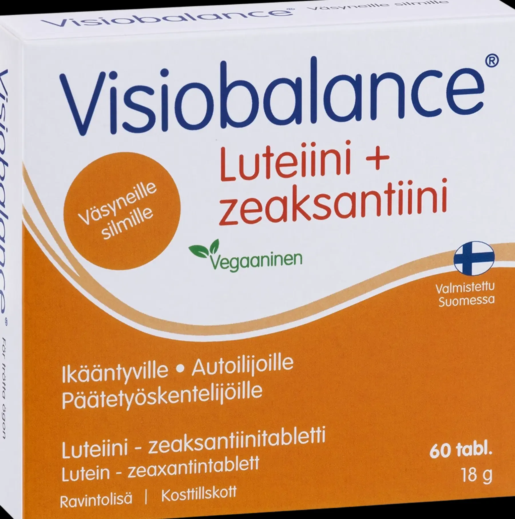Visiobalance®-ravintolisä sisältää merkittävän määrän luteiinia ja zeaksantiinia, jotka ovat ainoat silmänpohjassa ja linssissä esiintyvät karotenoidit. Elimistö ei pysty itse tuottamaan luteiinia ja zeaksantiinia, joten niitä on saatava ravinnosta. Visiobalance-ravintolisällä voidaan täydentää luteiinin ja zeaksantiinin saantia päivittäin. Laktoositon, hiivaton, makeuttamaton, gluteeniton. Ei sisällä eläinperäisiä aineisosia. Valmistettu Suomessa.