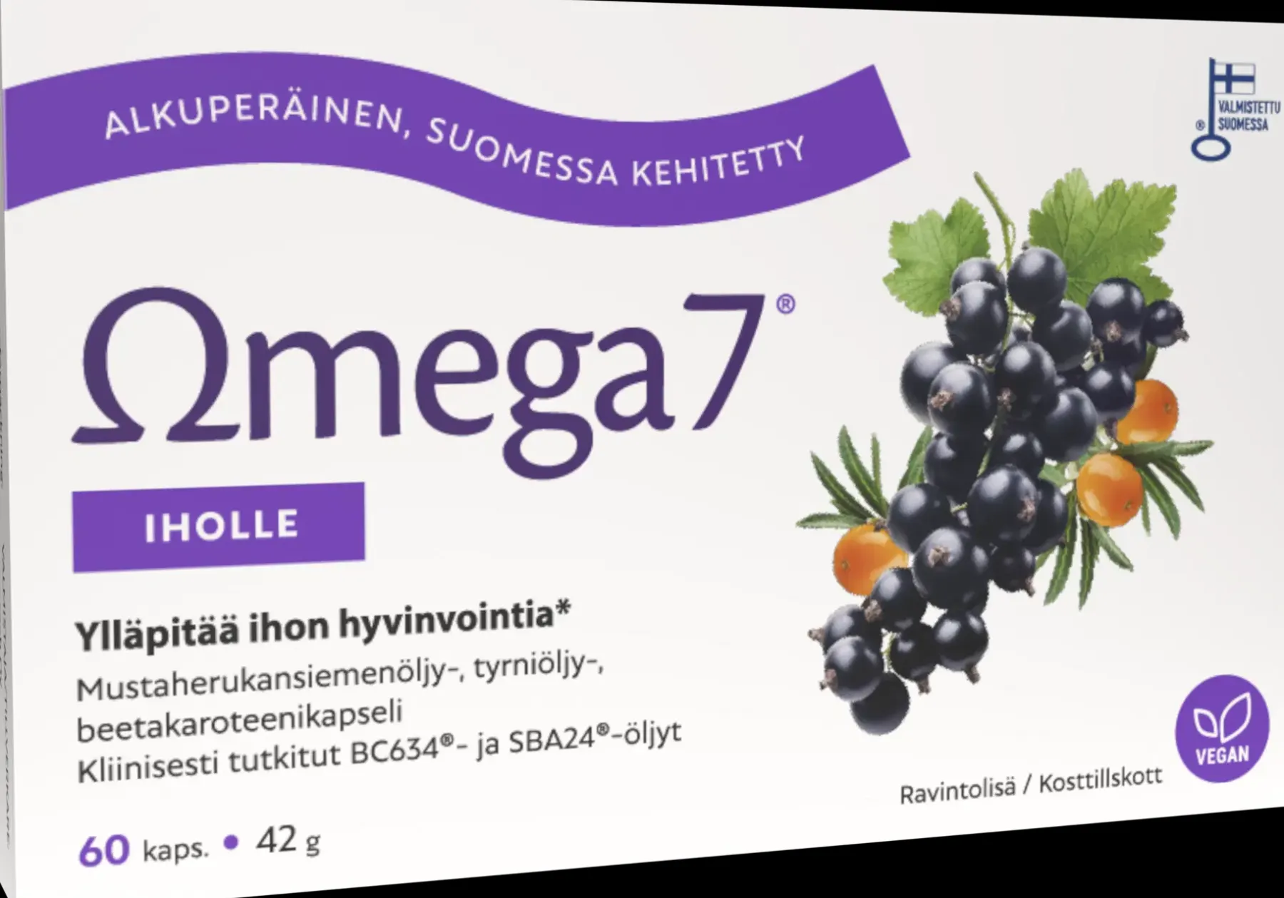 Alkuperäinen ja Suomessa kehitetty Omega7 BC634® + SBA24® iholle sisältää tasapainoisen seoksen omega-3, -6, -7 ja -9 -rasvahappoja, joista erityisen tärkeää ihon hyvinvoinnille on gammalinoleenihappo (GLA). Ainutlaatuiset BC634®-mustaherukansiemenöljy ja SBA24®-kaksoistyrniöljy valmistetaan hellävaraisella ja ympäristöystävällisellä hiilidioksidiuutolla. Näin saadaan puhdasta öljyä, jonka tehoaineet ovat säilyneet aktiivisessa muodossa. Riittävät ja vakioidut A- ja E-vitamiinitasot takaavat tuotteen toimivuuden. Kehomme valmistaa beetakaroteenista A-vitamiinia, joka ylläpitää ihon hyvinvointia. Öljyn E-vitamiini suojaa soluja hapettumisstressiltä. Vakioidut marjaöljyt on valmistettu ja tutkittu Suomessa. Sopii kuivalle, kutisevalle, ärtyneelle ja ikääntyvälle iholle. Tyypillisesti vaikutukset havaitaan 2-5 viikon säännöllisen käytön jälkeen. Avainlippu.