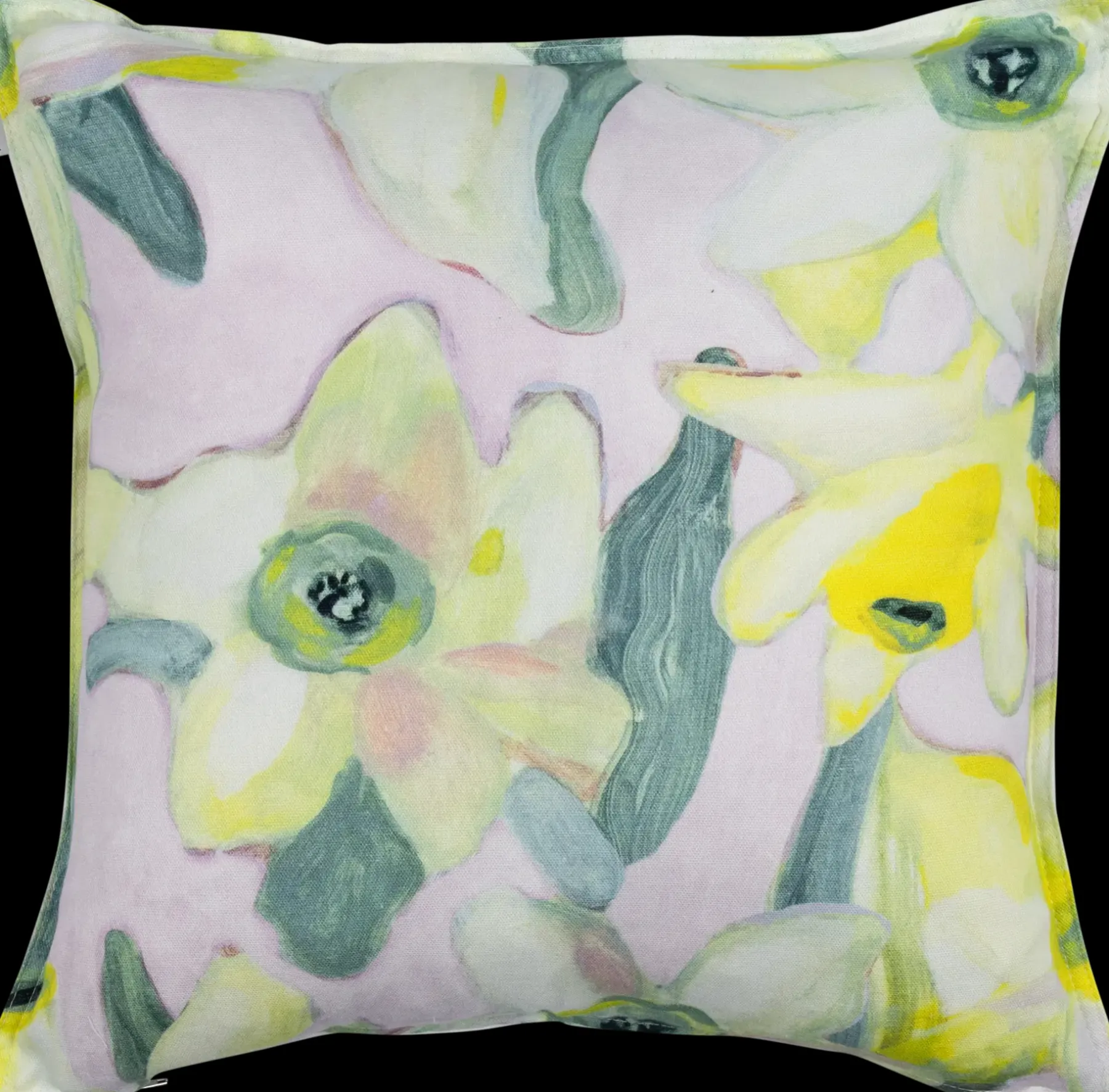 Iloisenväriset narsissit kiirehtivät nauttimaan kevätauringosta ensimmäisten kasvien joukossa, ja niistä on tullut hyvän ruuan ohessa tärkeä osa pääsiäisen viettoa monessa kodissa. Lasse Kovanen maalasi Narsissi-kuosin perinteisellä tempera-tekniikalla, jossa värien sidosaineena käytetään kananmunaa. Ikonimaalauksesta tutulle maalaustavalle on ominaista hento läpikuultavuus, joten kuosissa näkyvät kauniina yksityiskohtina siveltimenvedot ja useat maalauskerrokset. Narsissi-tekstiilit tuovat kotiin raikasta ja iloista pääsiäistunnelmaa trendikkäillä sitruunankeltaisilla sekä turkooseilla sävyillä. Narsissi-malliston värikäs tyynynpäällinen on mitoiltaan 45×45 cm, joten siihen sopii 48×48 cm kokoinen sisätyyny, joka saa tyynyn näyttämään muhkealta. Kukkakuvioinen tyynynpäällinen on 100 % puuvillaa.