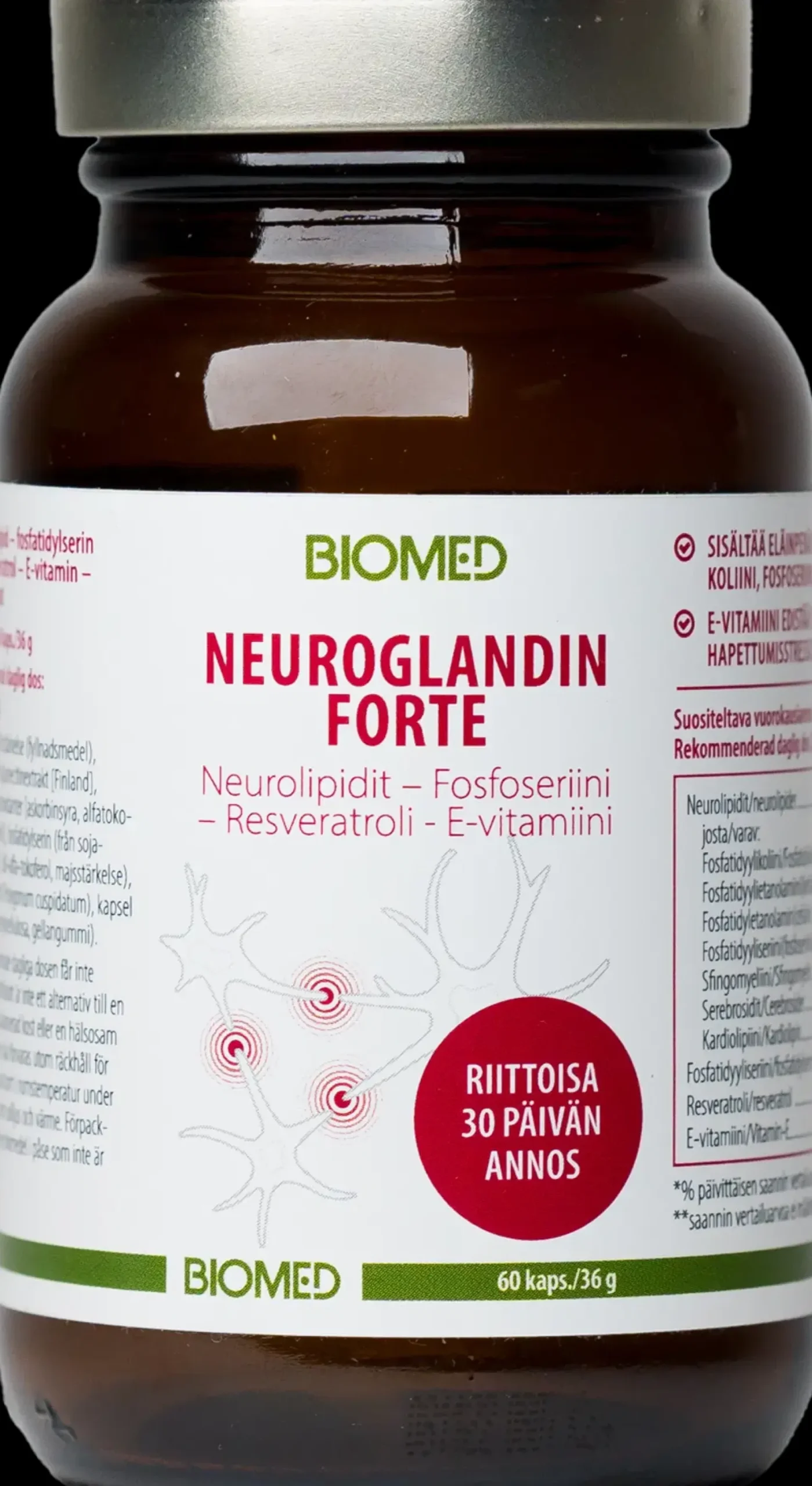 ELÄINPERÄISET NEUROLIPIDIT – PELLAVANSIEMENÖLJY – FOSFOSERIINI – E-VITAMIINI – RESVERATROLI