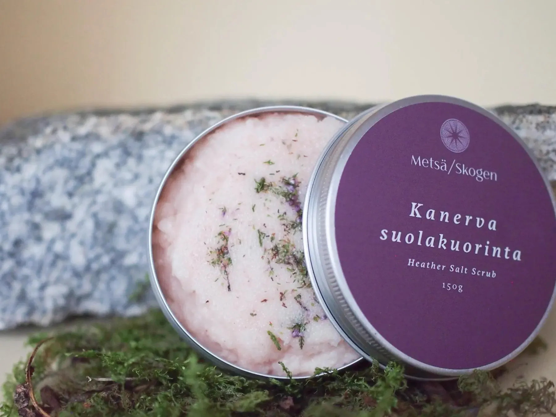 Metsä/Skogenin Kanerva-suolakuorinta tuo suomalaisen metsän kylpyhuoneeseesi jättäen samalla ihosi silkinpehmeäksi. Himalajan ruususuolaa, sheavoita, kookosöljyä ja manteliöljyä sisältävä suolakuorinta on helppokäyttöinen: hiero kuorintavoidetta kostutetulle iholle nautiskellen eteeristen öljyjen harmonisesta tuoksusta ja huuhtele kuorinta lopulta vedellä pois. Suolakuorinta sopii mainiosti käytettäväksi lauteilla täydentäen samalla rentouttavan saunahetken, mutta voit kuoria ihosi myös kotisuihkussa. Kanerva-suolakuorinta on valmistettu Suomessa.