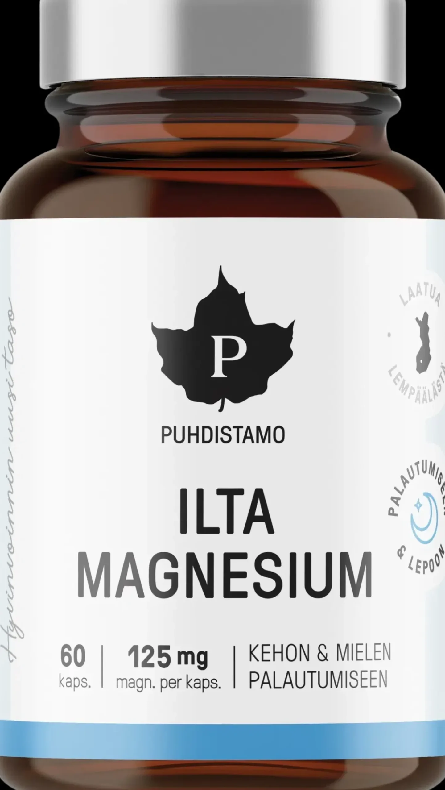 Puhdistamon Ilta Magnesium on magnesium-yrttiuutevalmiste. Magnesiumglysinaatti palauttaa kehoa ja mieltä, sillä magnesium edistää normaaleja psykologisia toimintoja ja hermoston normaalia toimintaa stressaavankin arjen keskellä. Valmisteen sisältämä l-tryptofaani on välttämätön aminohappo, joka on sekä serotoniinin ja melatoniinin lähtöaine. Tuotetta suositellaan käytettäväksi iltaisin, ja se voi auttaa parempilaatuisen unen tavoittelussa.