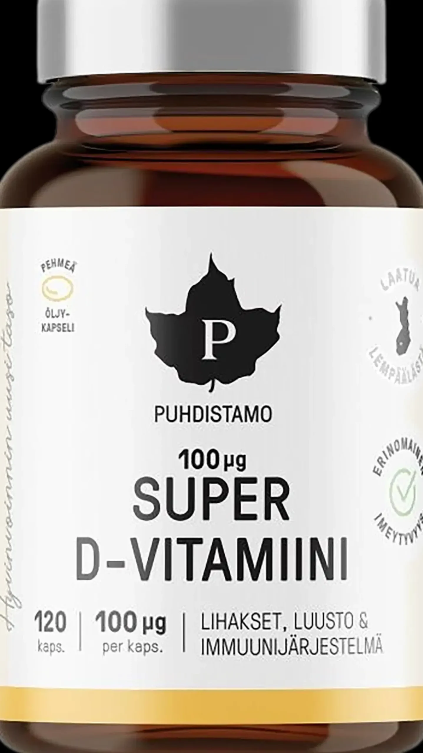 Puhdistamon Super D-vitamiini on vahva 100 µg D3-vitamiinivalmiste. Pehmytkapseliin pakattu turskanmaksaöljy sisältää luontaisesti A-vitamiinia ja D-vitamiinia, minkä lisäksi sitä on täydennetty lampaanvillan rasvasta saatavalla D3-vitamiinilla. Luonnossa D-vitamiinia esiintyy eniten kalan rasvassa, joten Super D-vitamiiniin on valittu laadukas kalaöljy tuotteen pohjaksi. Luonnollinen kalaöljy varmistaa D-vitamiinin erinomaisen imeytymisen. D-vitamiini edistää lihastoiminnan, luuston ja immuunijärjestelmän normaalia toimintaa.
