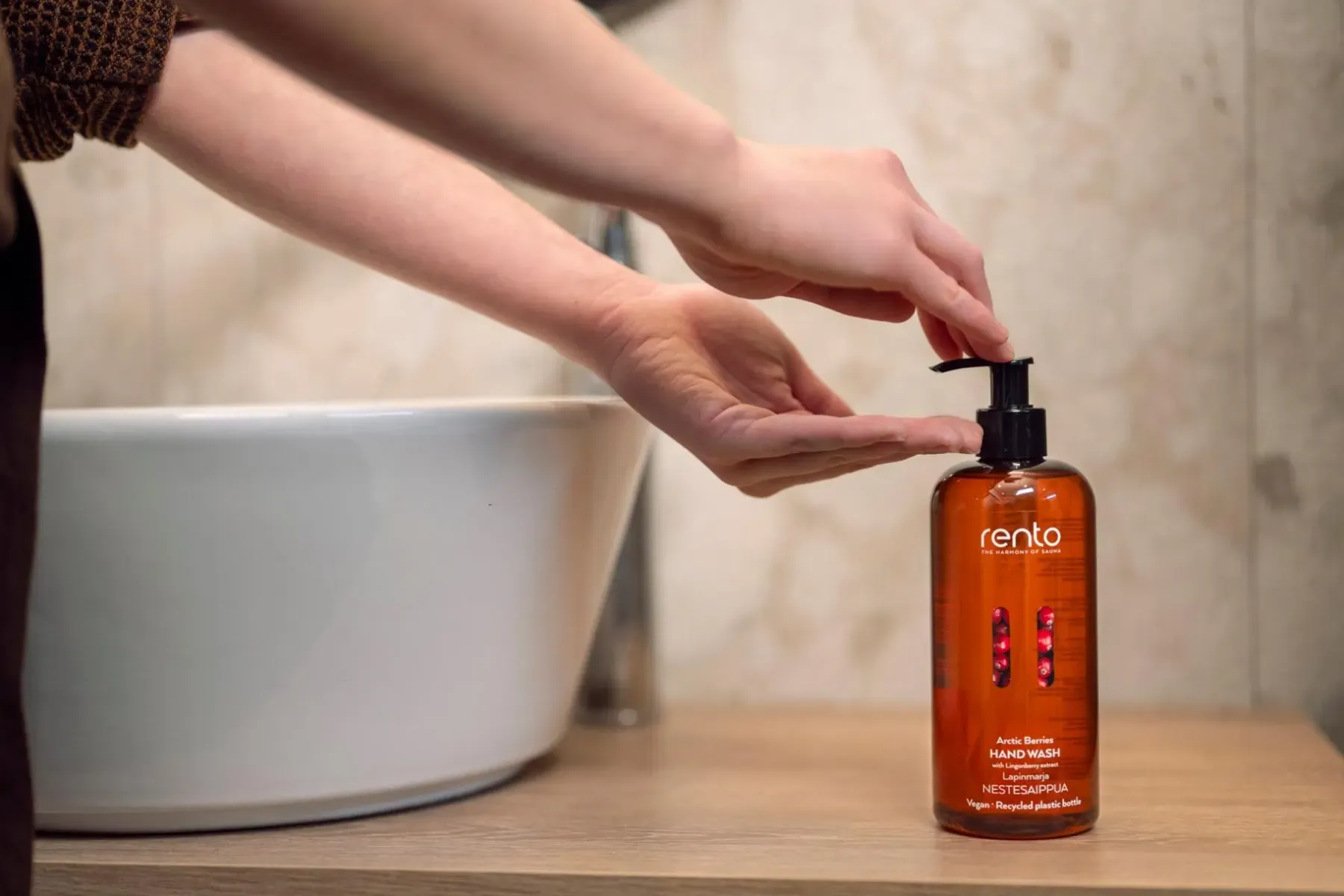 Hoitava nestesaippua käsille. Sisältää ihoa pehmentävää glyseriiniä ja puolukkauutetta Suomen luonnosta. Tuoksussa raikkaita yöttömän yön kypsyttämiä Lapin marjoja ja tunturiluontoa. Käyttö: levitä kosteisiin käsiin, vaahdota ja huuhtele huolellisesti. Valmistettu Suomessa.