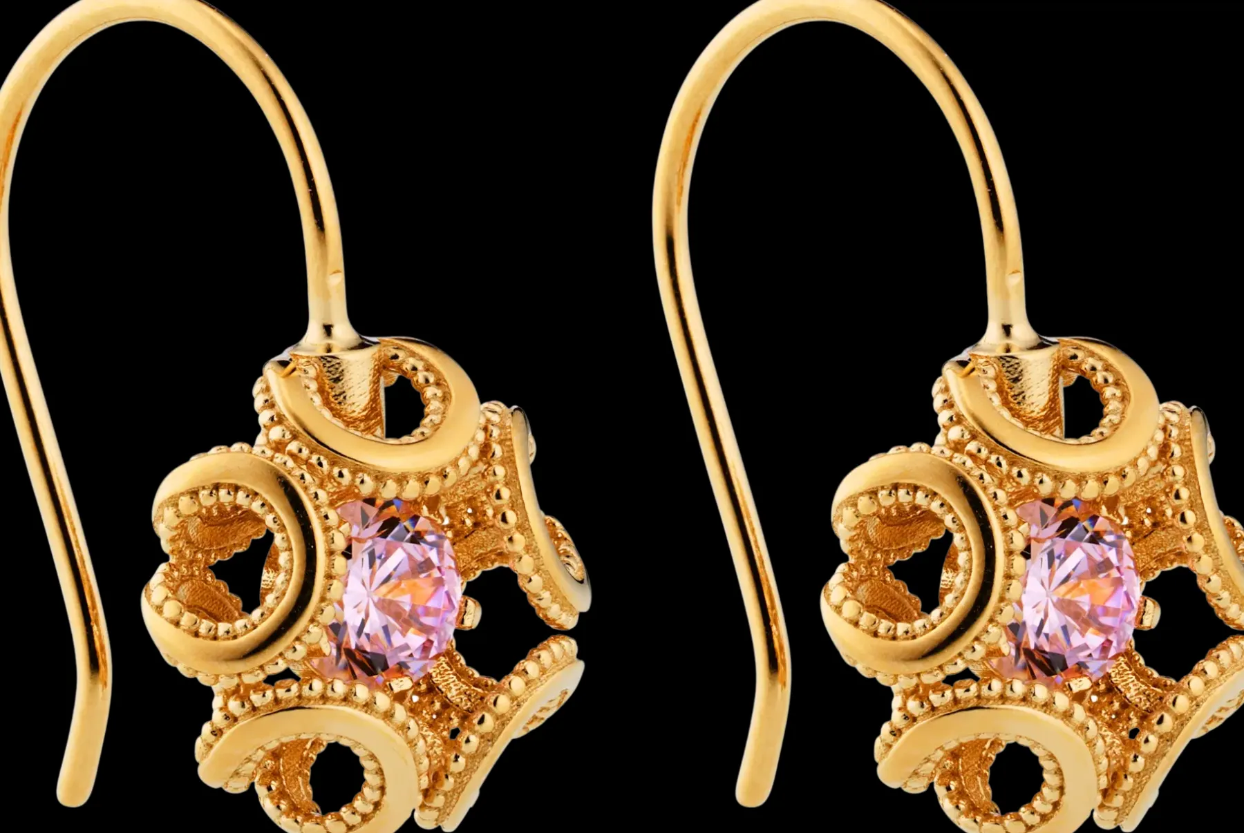 Alma tuo perinteikkään viktoriaanisen muotokielen tähän päivään koristeellisen muodon ja pitsimäisten yksityiskohtien kautta. Keskiöön asetettu vaaleanpunainen kivi korostaa korun kerroksellisuutta ja muuttaa herkän kokonaisuuden kiinnostavaksi. Alman korvakoruissa koukkuosa on kiinteä ja pysyy hyvin paikallaan. 100% kierrätettyä hopeaa, keltakullattu.