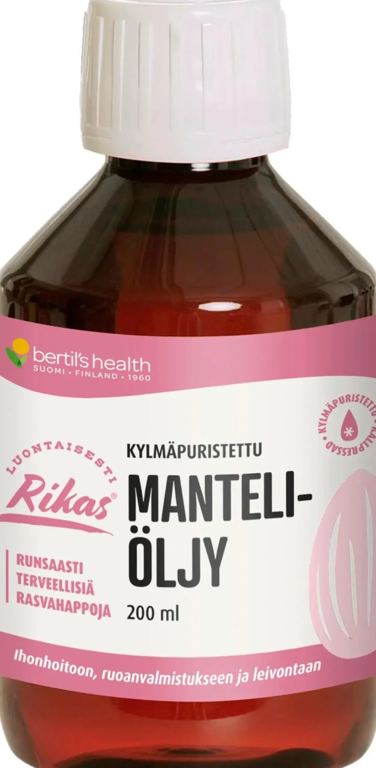 Puhdas, kylmäpuristettu manteliöljy sopii ulkoisesti ihonhoitoon. Suositellaan erityisen herkälle ja kuivalle iholle esim. pikkuvauvoille. Manteliöljy soveltuu myös hierontaöljyksi sellaisenaan tai pohjaksi aromaterapeuttisille hierontaöljyille.