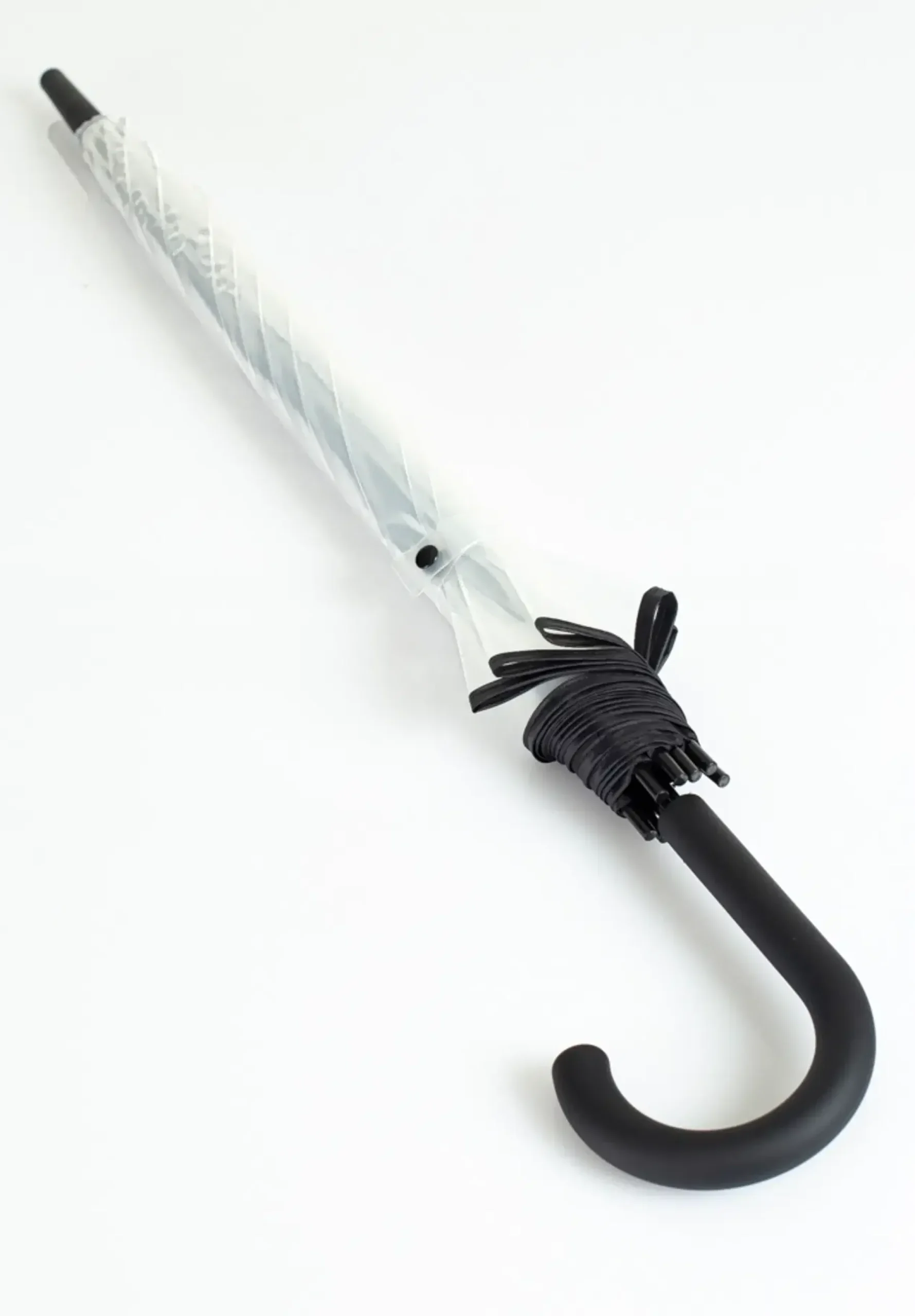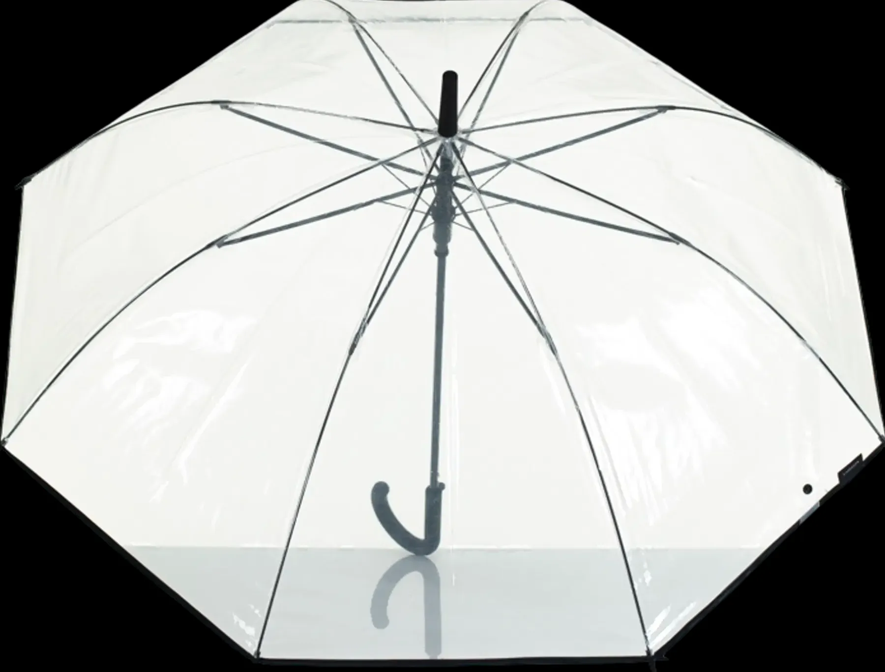 Läpinäkyvä pitkä sateenvarjo, jossa musta terenauha reunassa. Automaattisesti avautuva.