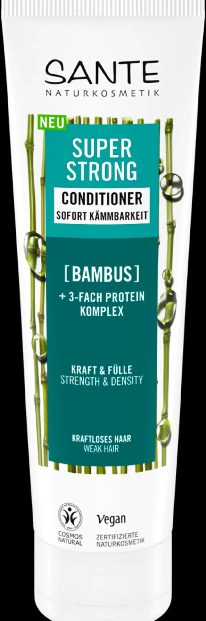 Super Strong Hoitoaine sisältää erittäin tehokkaan hoitokoostumuksen, joka on valmistettu luomu bambuuutteesta ja kolminkertaisesta proteiinikompleksista, joka vahvistaa hiuksia ja vähentää katkeilua. Saat kimmoisat, terveen näköiset hiukset latvoihin asti latistamatta niitä. Kolminkertainen proteiinikompleksi vahvistaa, ravitsee ja suojaa hiuksia tyvestä latvoihin. Kosteuttava hoitokompleksi täyttää ja rakentaa hiuksia luonnollisen vahvan rakenteen aikaansaamiseksi. Yhteensopivuus on dermatologisesti testattu.