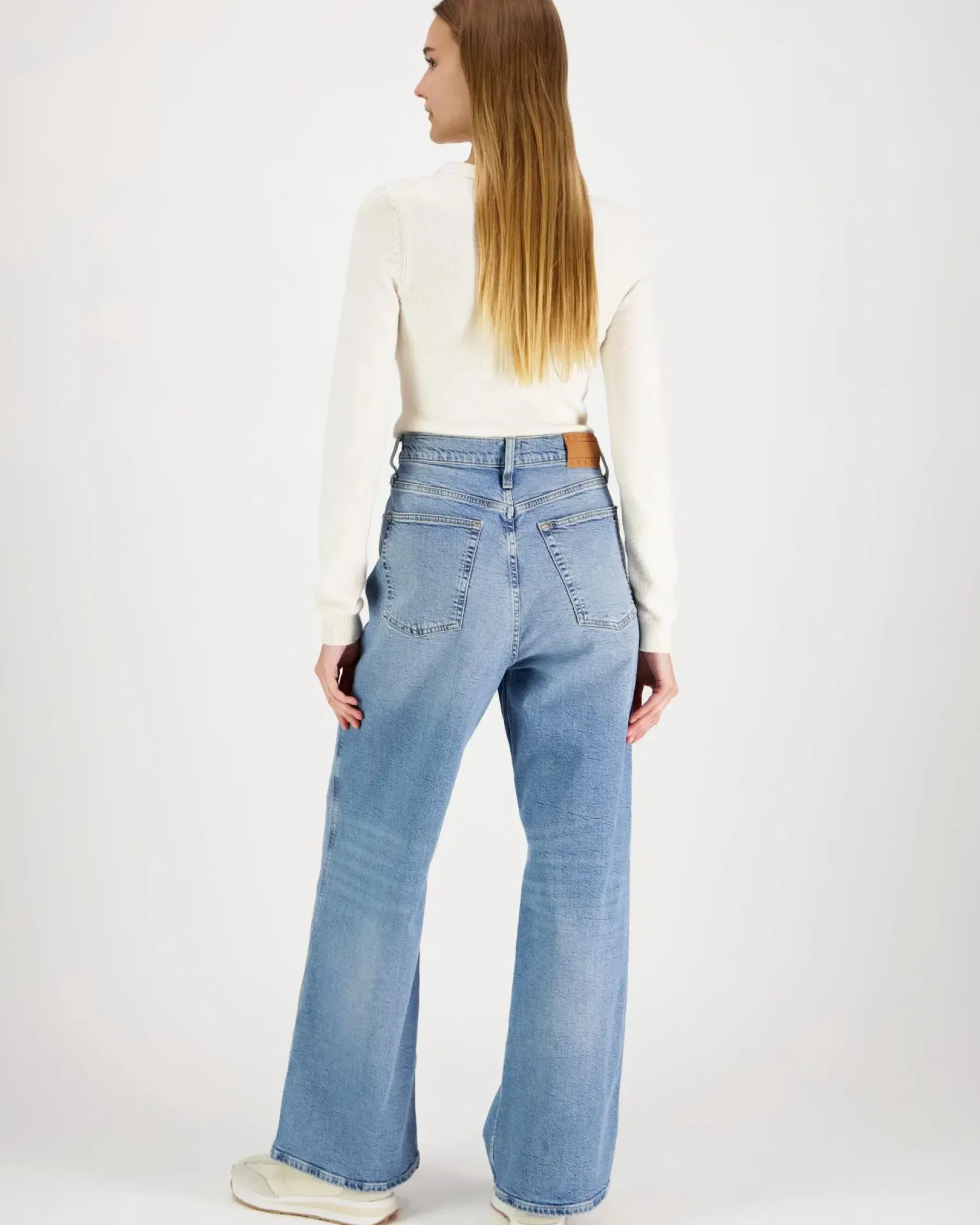 Leveän malliset korkeavyötäröiset farkut, joissa keskisininen denimpesu. Materiaalissa regeneratiivista puuvillaa sekä kierrätettyä puuvillaa ja elastaania.
