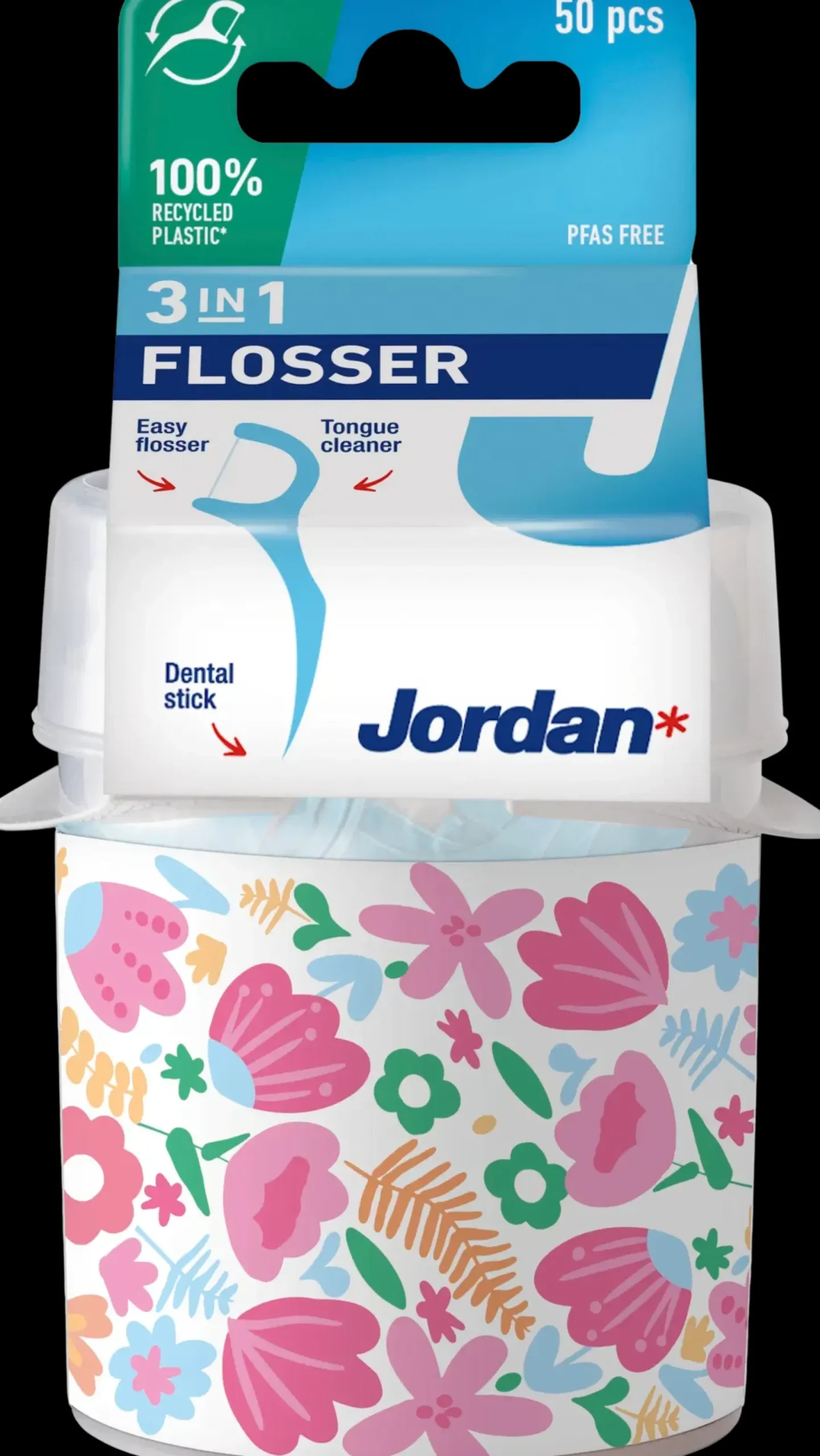 – Suosittu Jordan 3in1 Flosser nyt myös kätevässä huomiota herättävässä purkissa! Helppokäyttöisessä tuotteessa yhdistyy kolme huippuominaisuutta: hammaslanka, hammastikku ja kielenpuhdistaja! Purkki sisältää 50kpl hammaslankaimia.