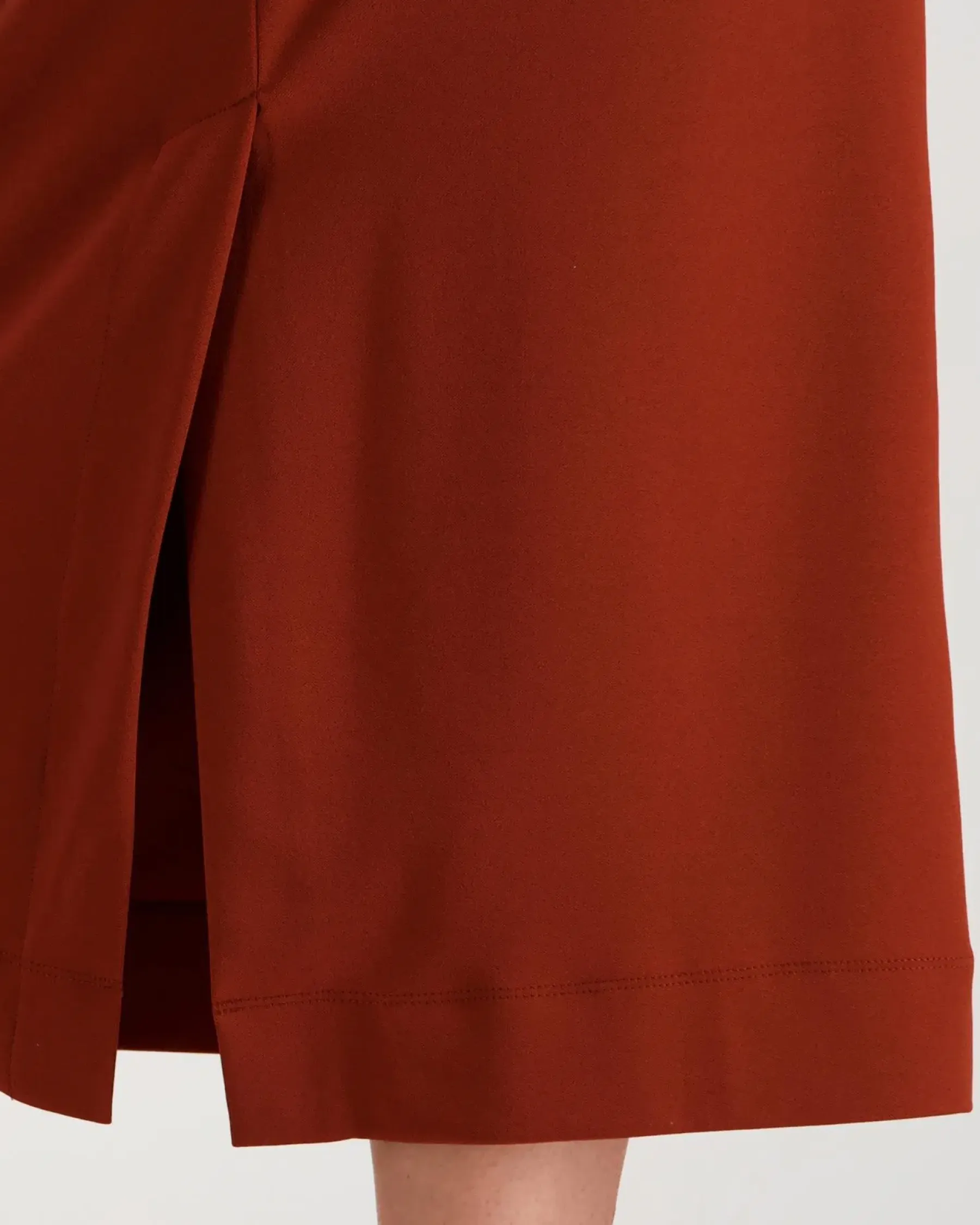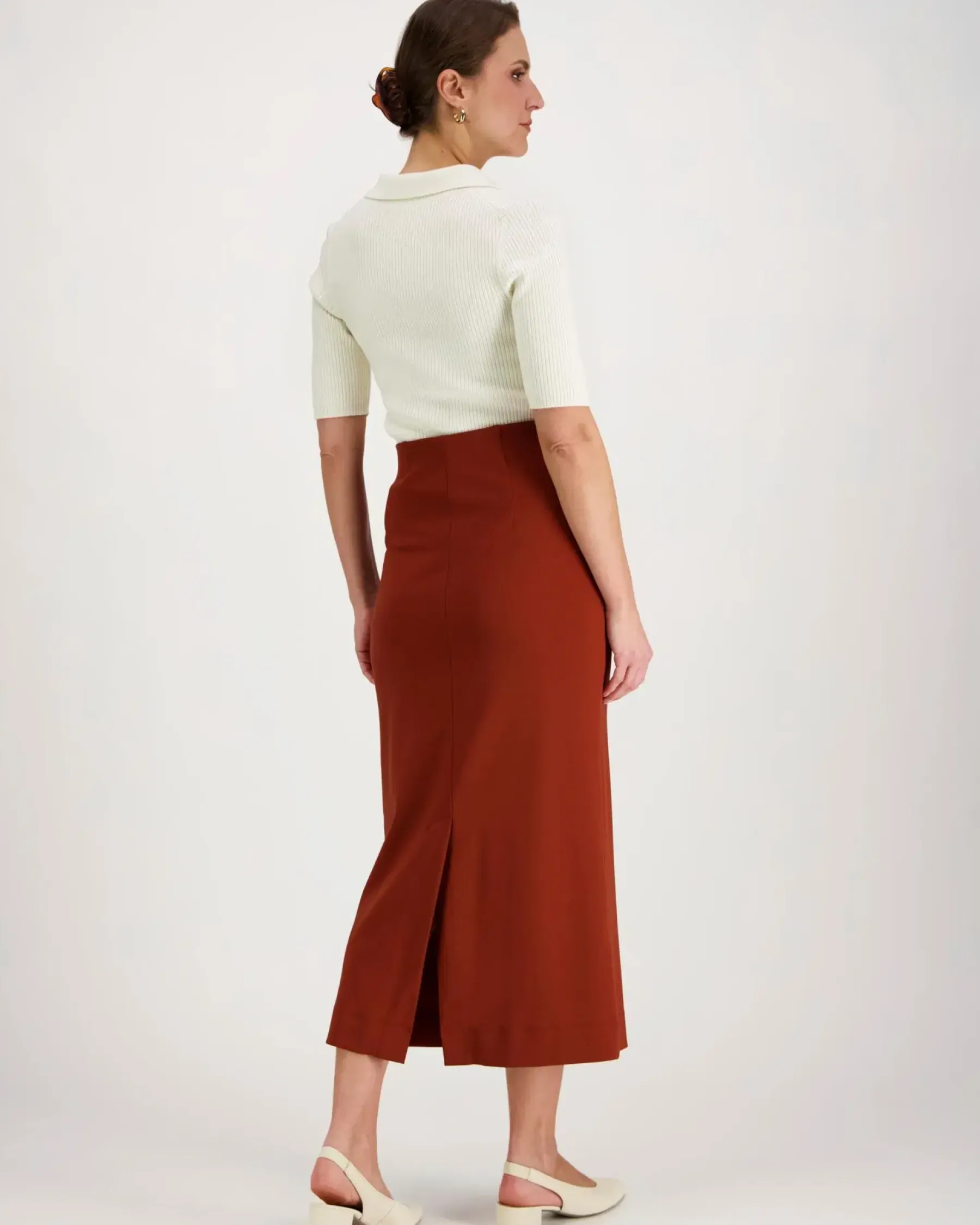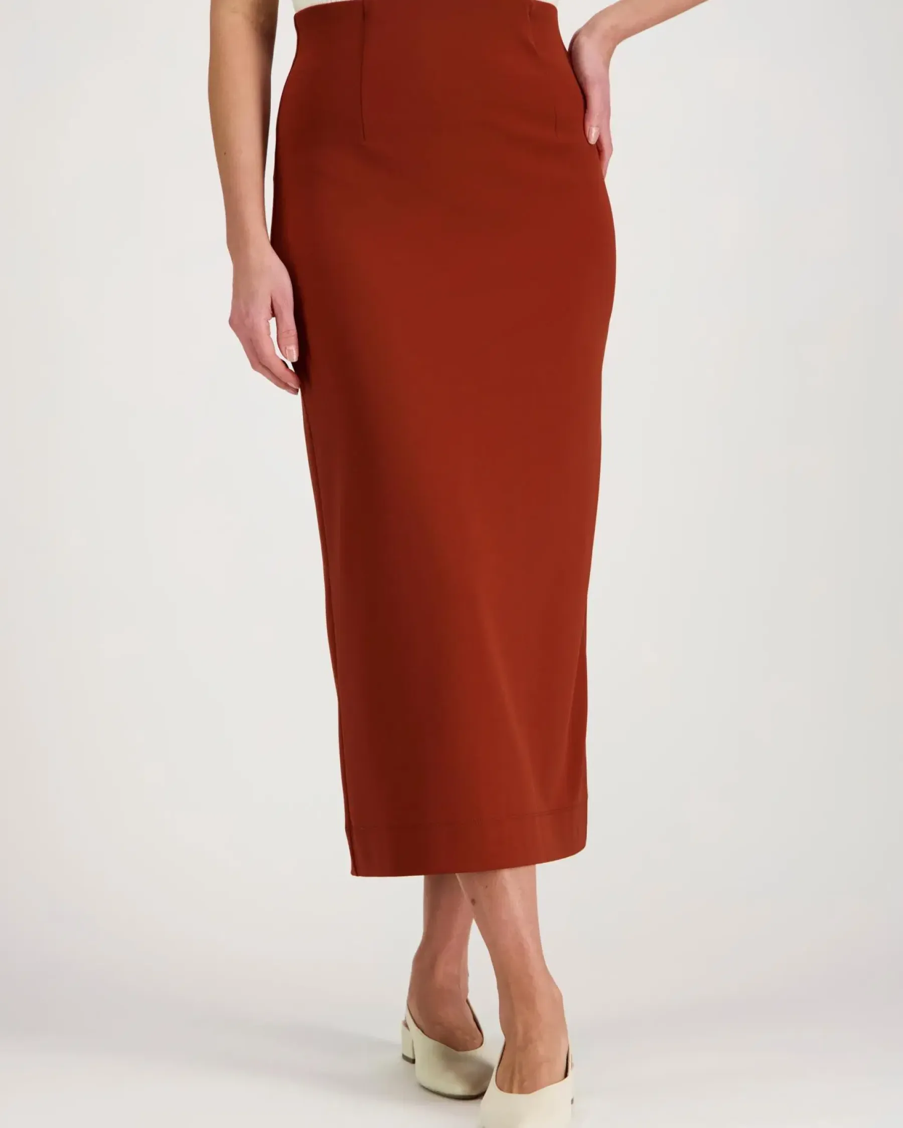 Kapeassa, vartalonmyötäisessä Fiia-hameessa on korkea vyötärö. Hameen materiaali on joustavaa, napakkaa, Jersey-neulosta. Pituus vyötäröltä helmaan koossa S on 90 cm. Suunniteltu Suomessa.