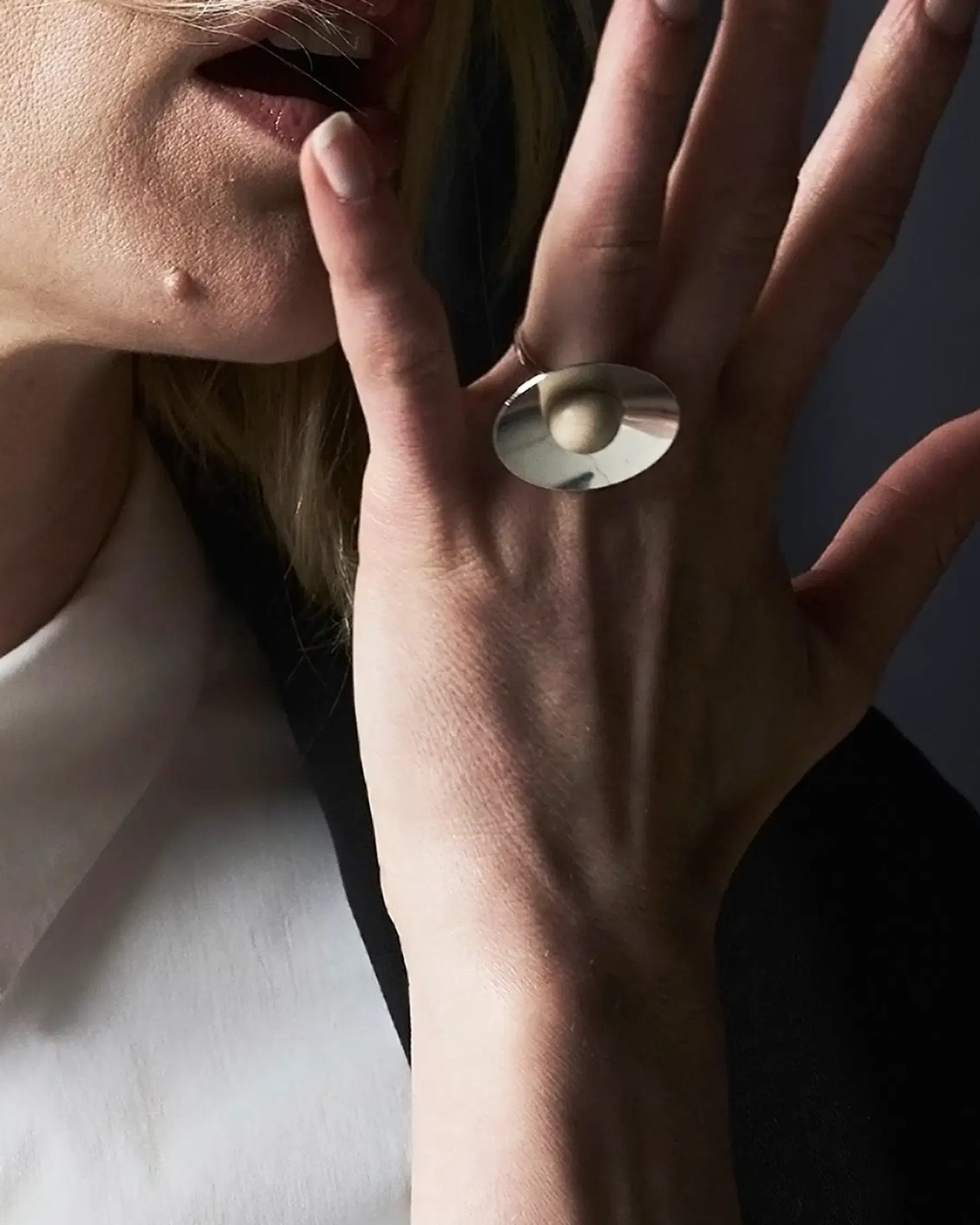 Pyöreässä Ava-sormuksessa on vaahterapuinen helmi upotettu hopeiseen pohjaan. Koristeosan halkaisija on 3 cm. Valmistettu käsityönä Suomessa.