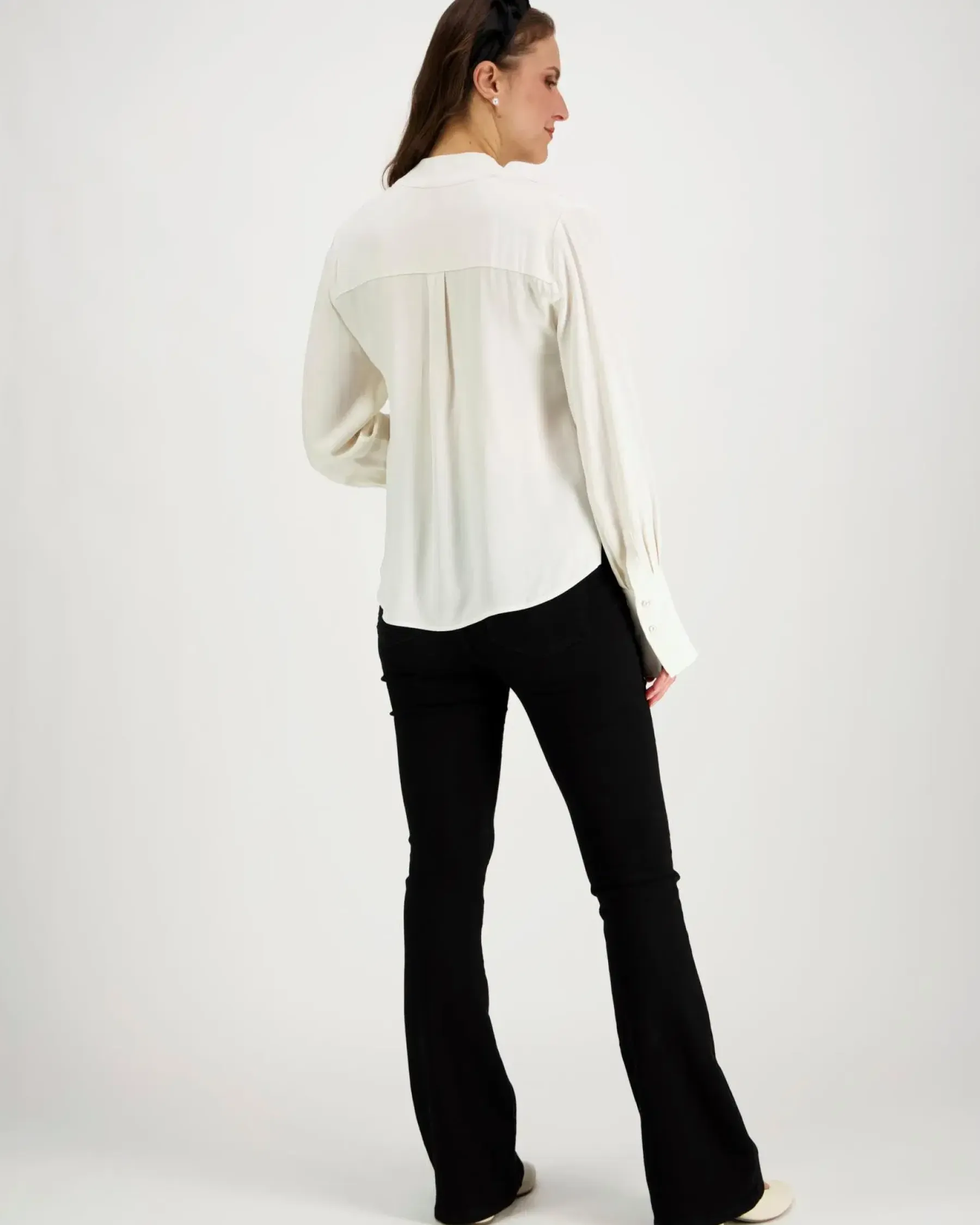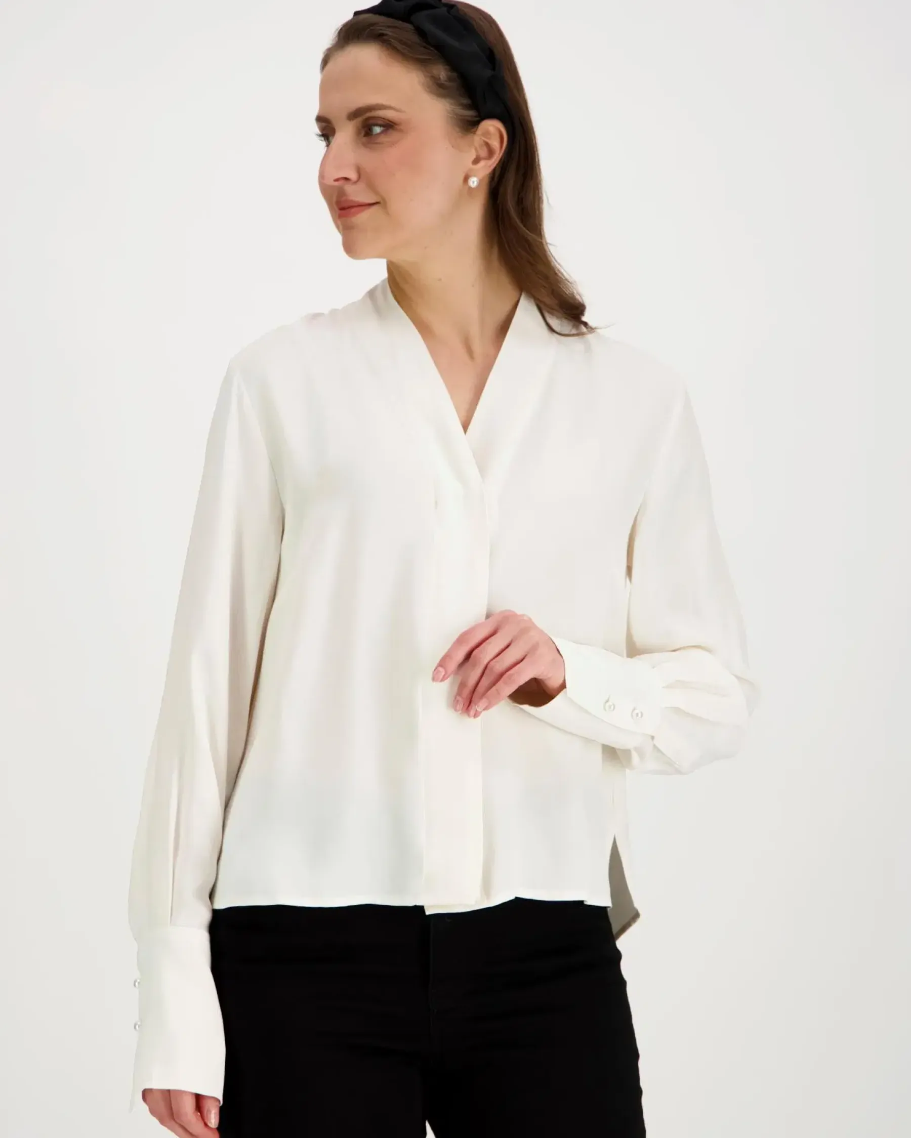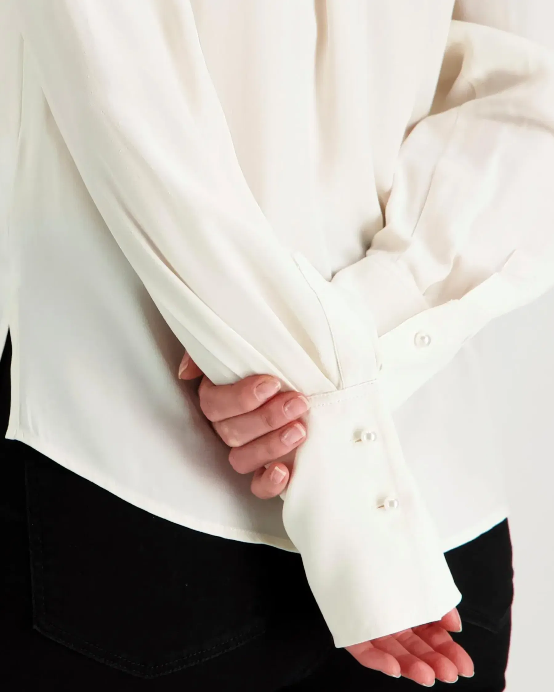 Gisele-puserossa on rento istuvuus, piilonapitus, kimonomainen kaulus, korkeat mansetit ja pallonapit hihansuissa. Paidan sisäpuoli on miellyttävän satiininen. Hartiasta helmaan mitattuna pituus koossa S on 64 cm. Suunniteltu Suomessa.