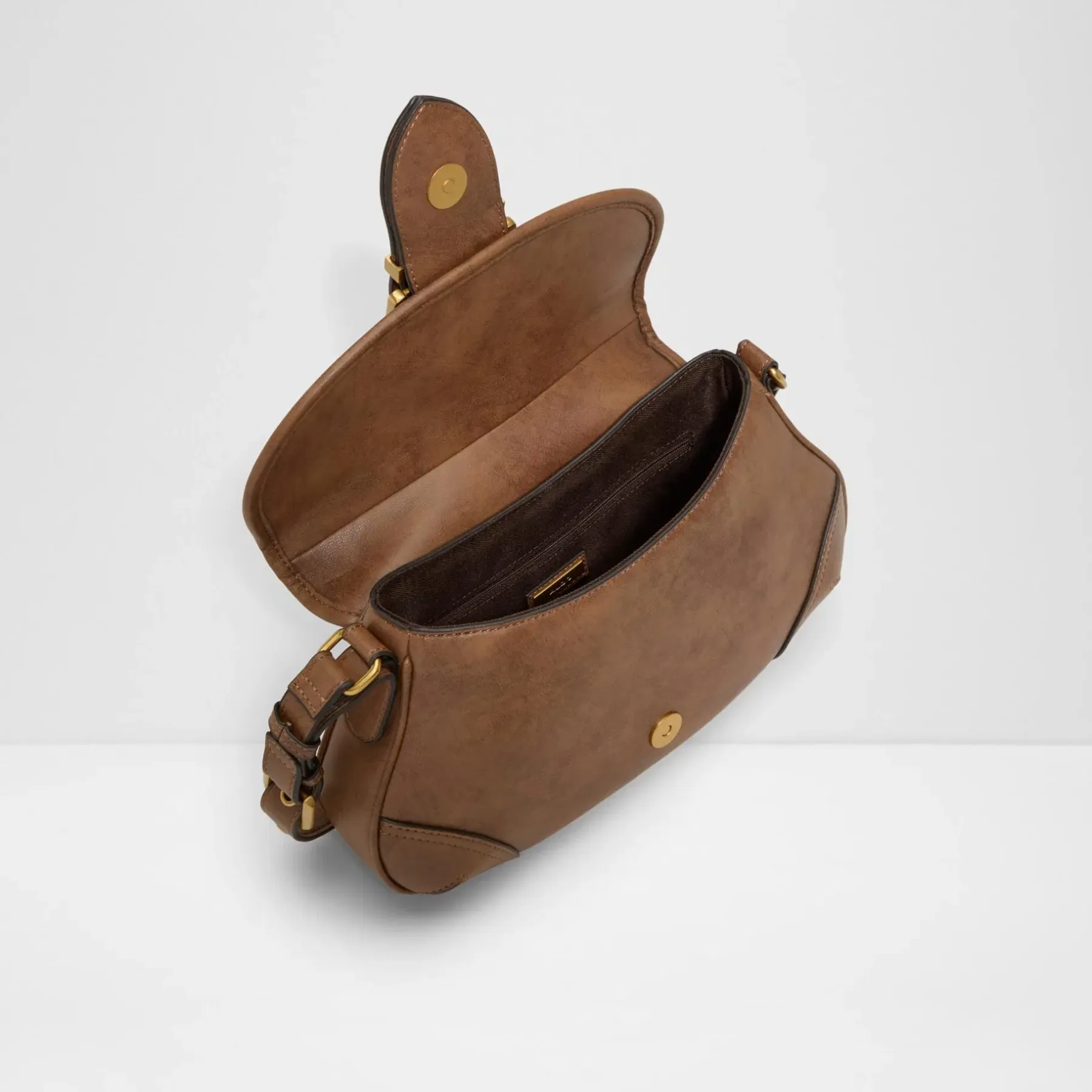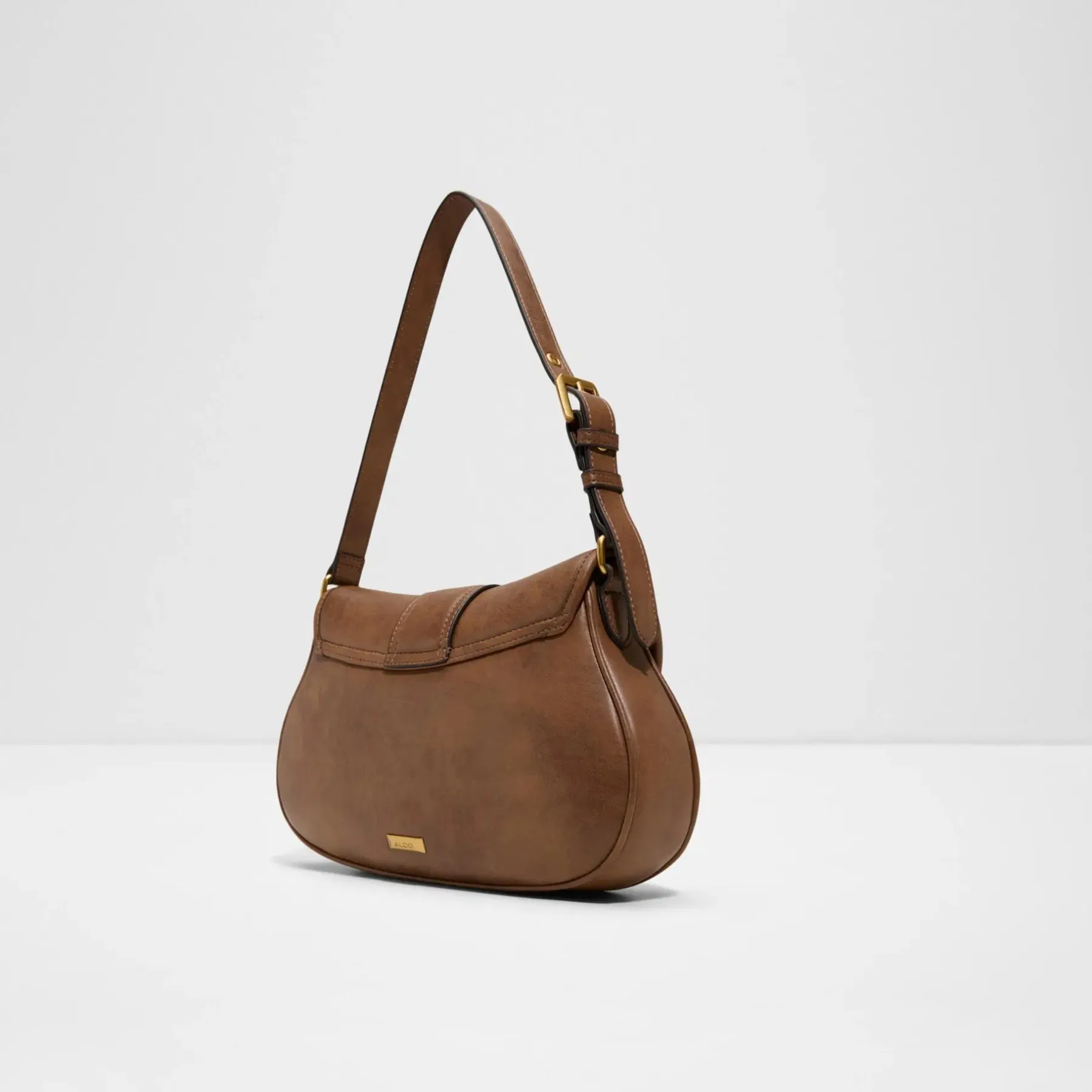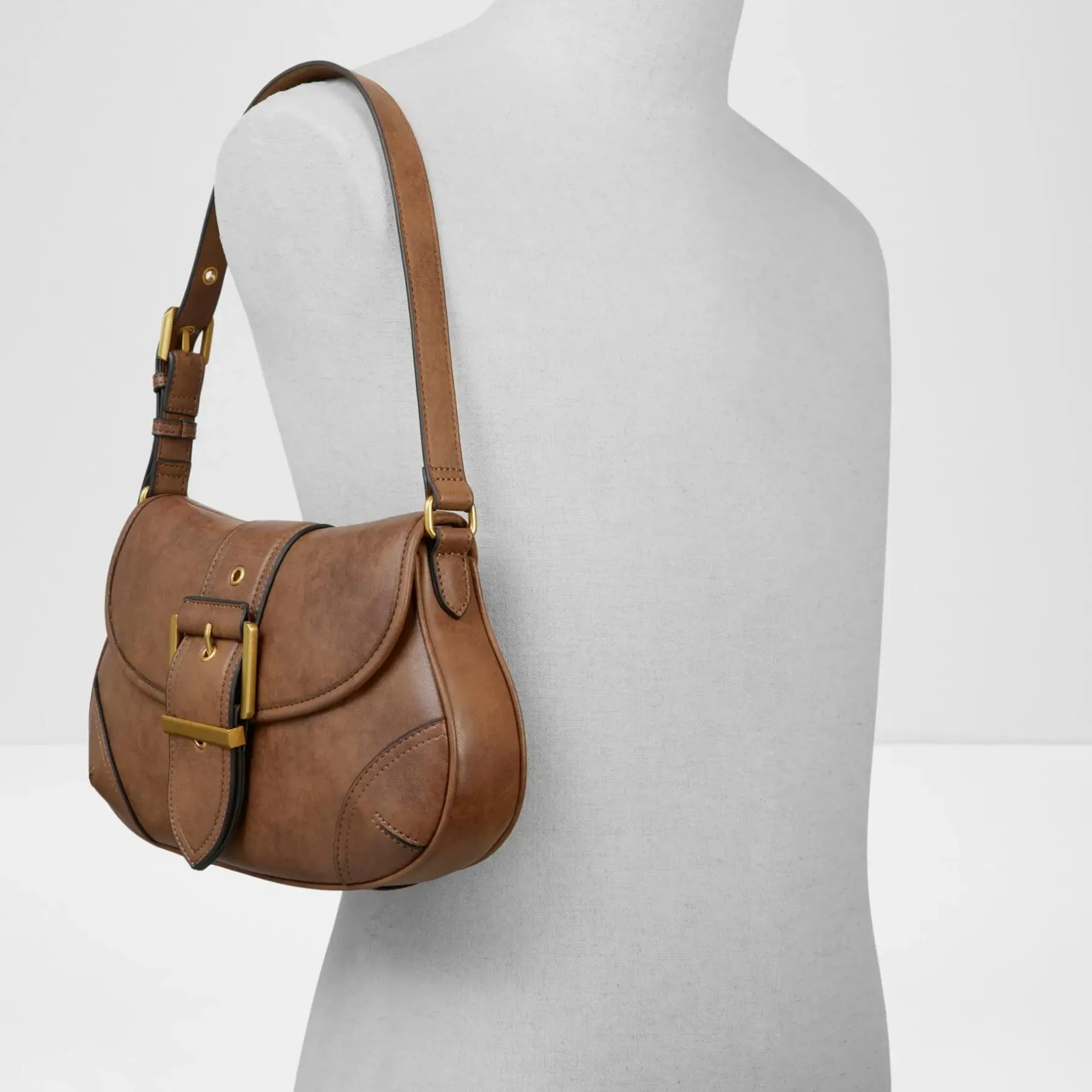 Ruskea olkalaukku, jossa upea iso koristesolki edessä. Siinä on säädettävä lyhyt olkahihna ja se suljetaan nepparilla.