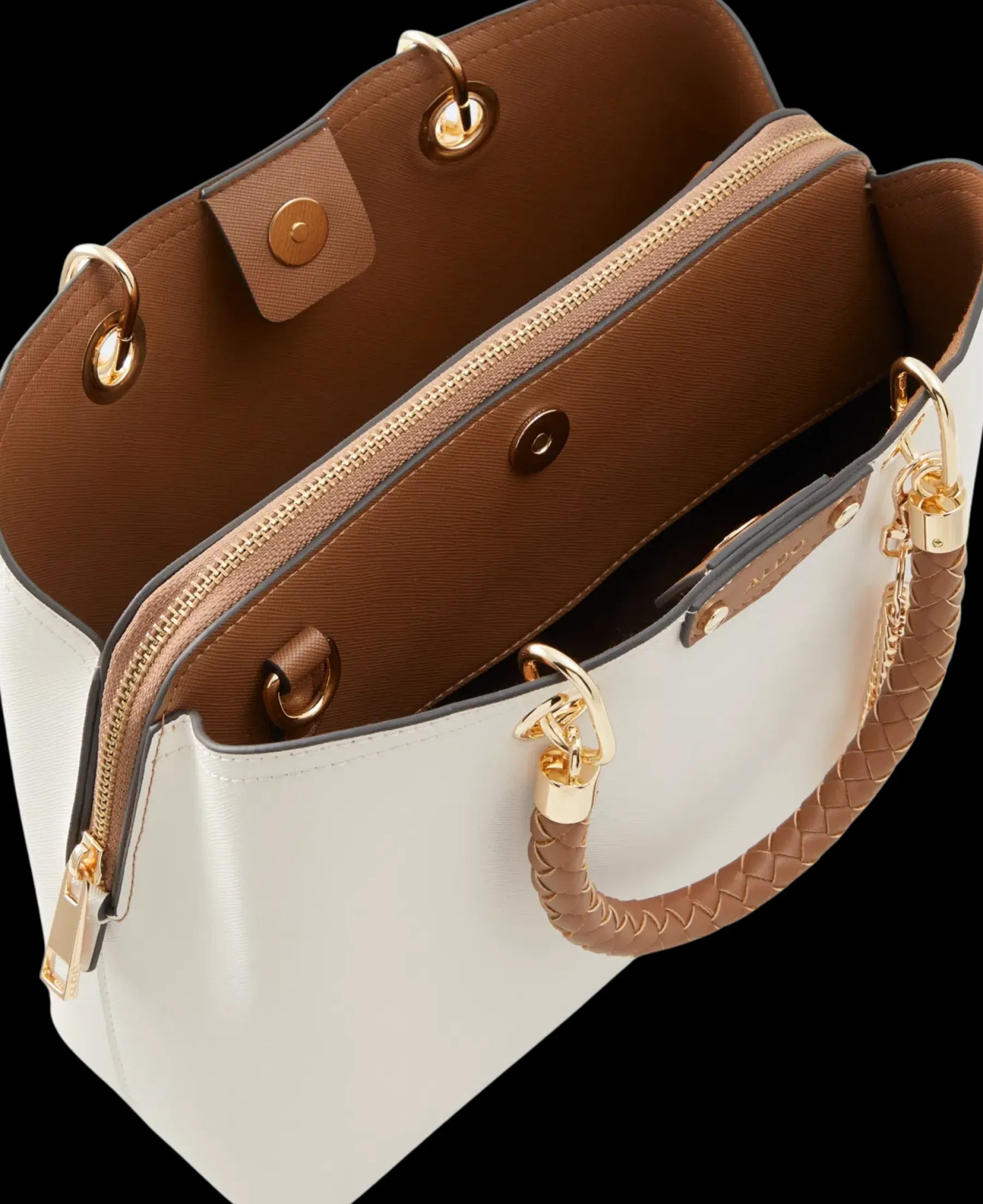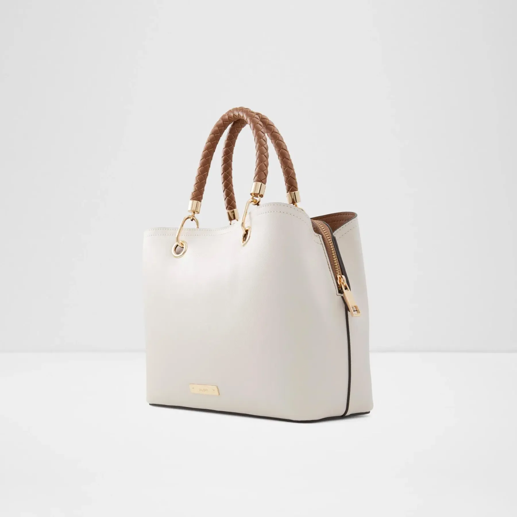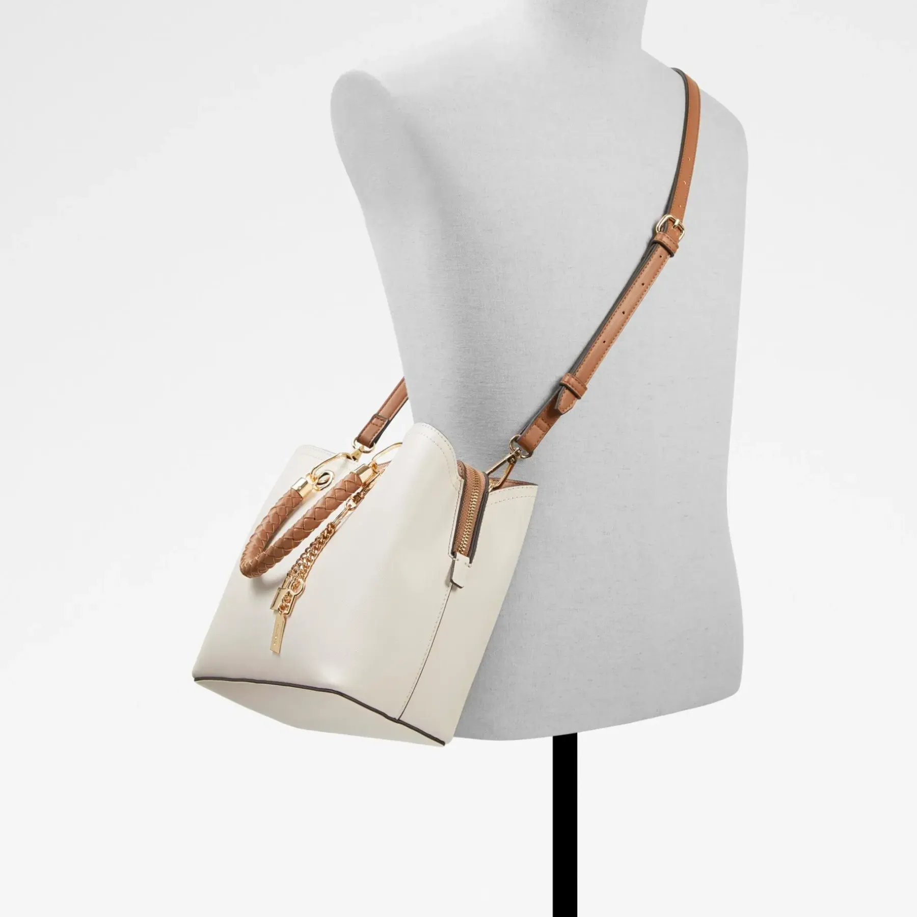 Kahvat ja irrotettava säädettävä olkahihna. Runko vaalea beige, kahvat ja hihna ruskeita. Irrotettava laukkukoru.
