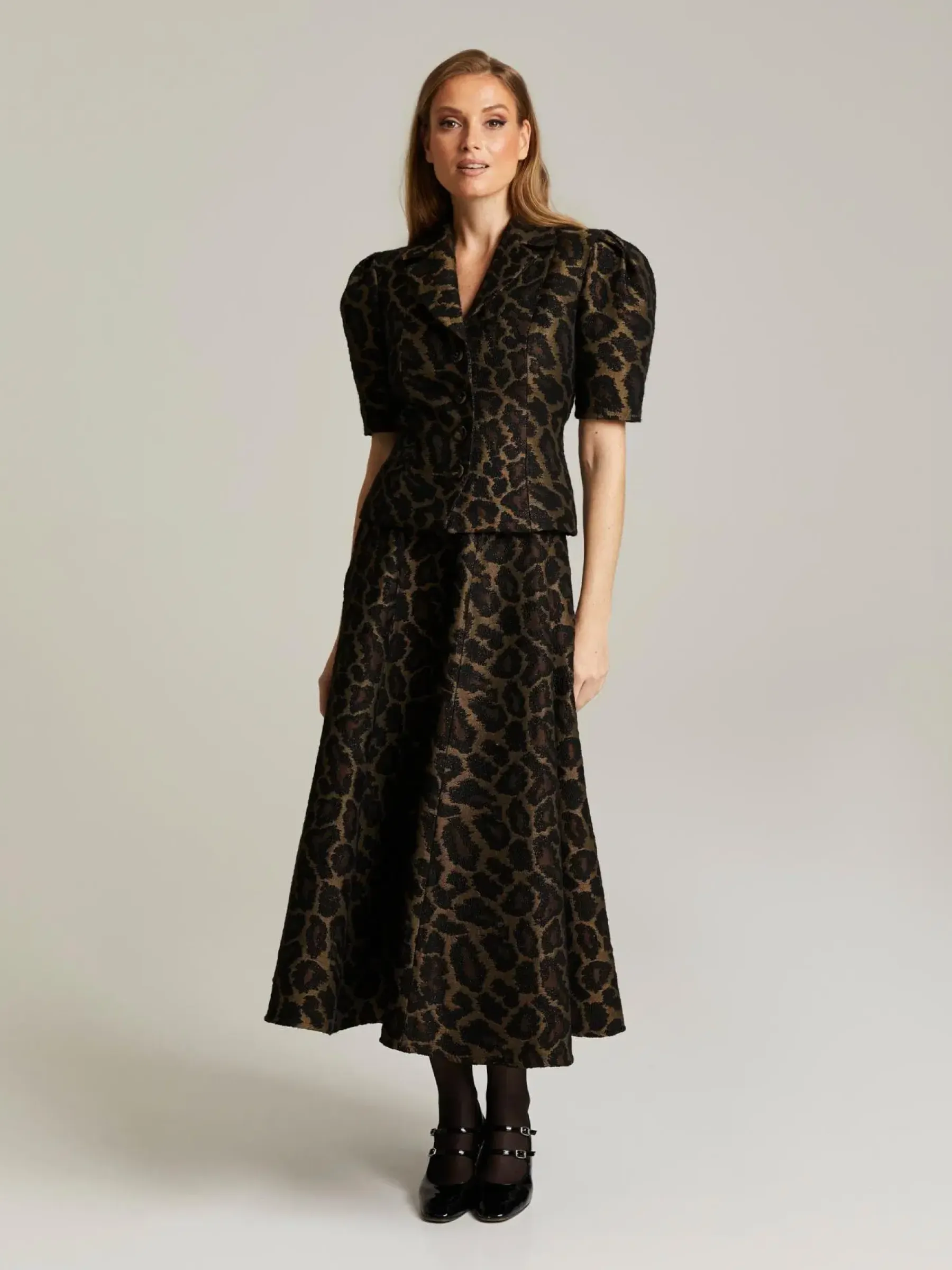 Kellotettu hame istuvalla vyötäröllä hieman kimaltelevasta, leopardikuvioisesta kankaasta.