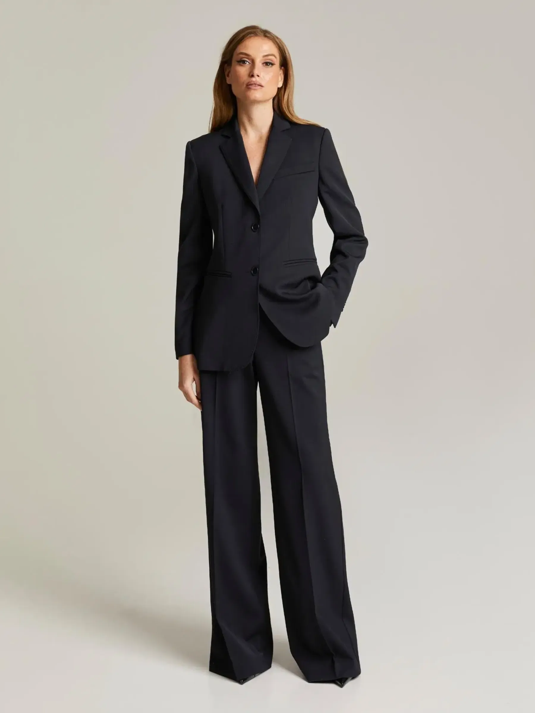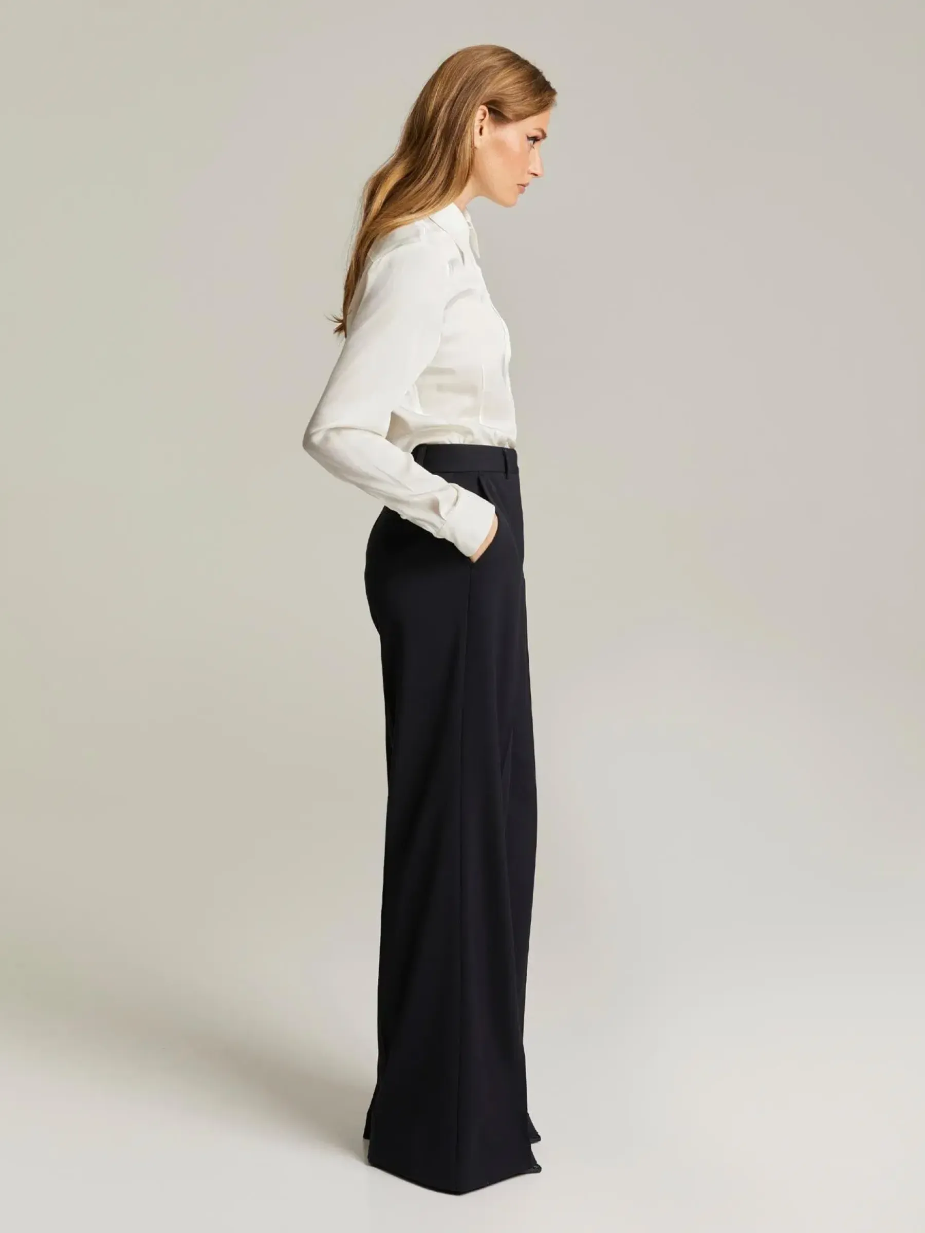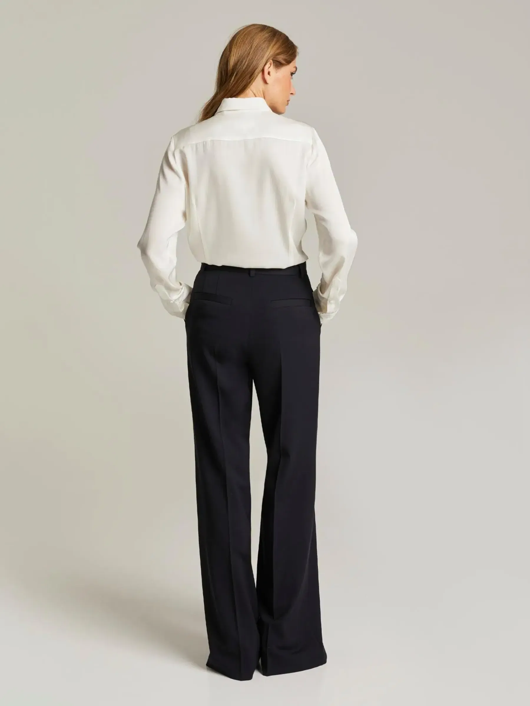 Suorat, leveälahkeiset housut korkealaatuisesta villasekoitekankaasta. Housussa on etuprässi, vyölenkit sekä taskut.