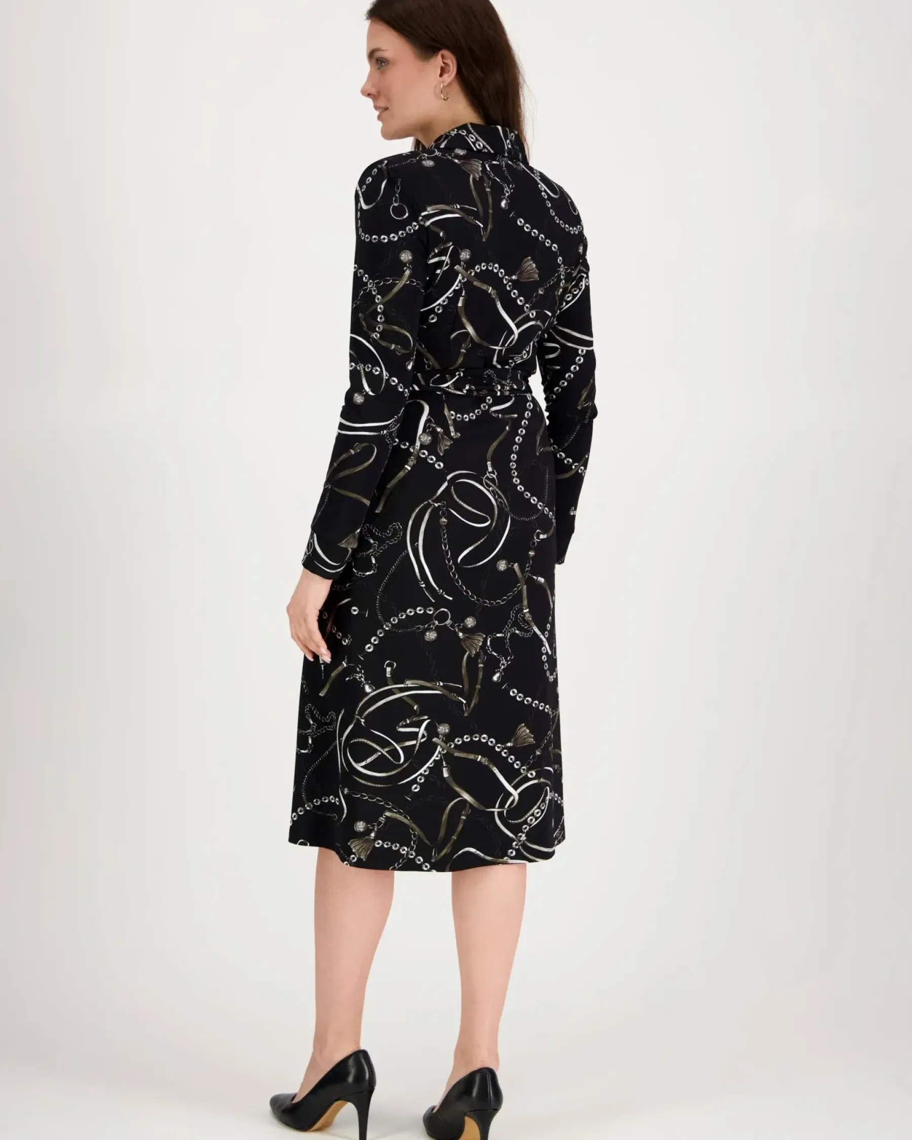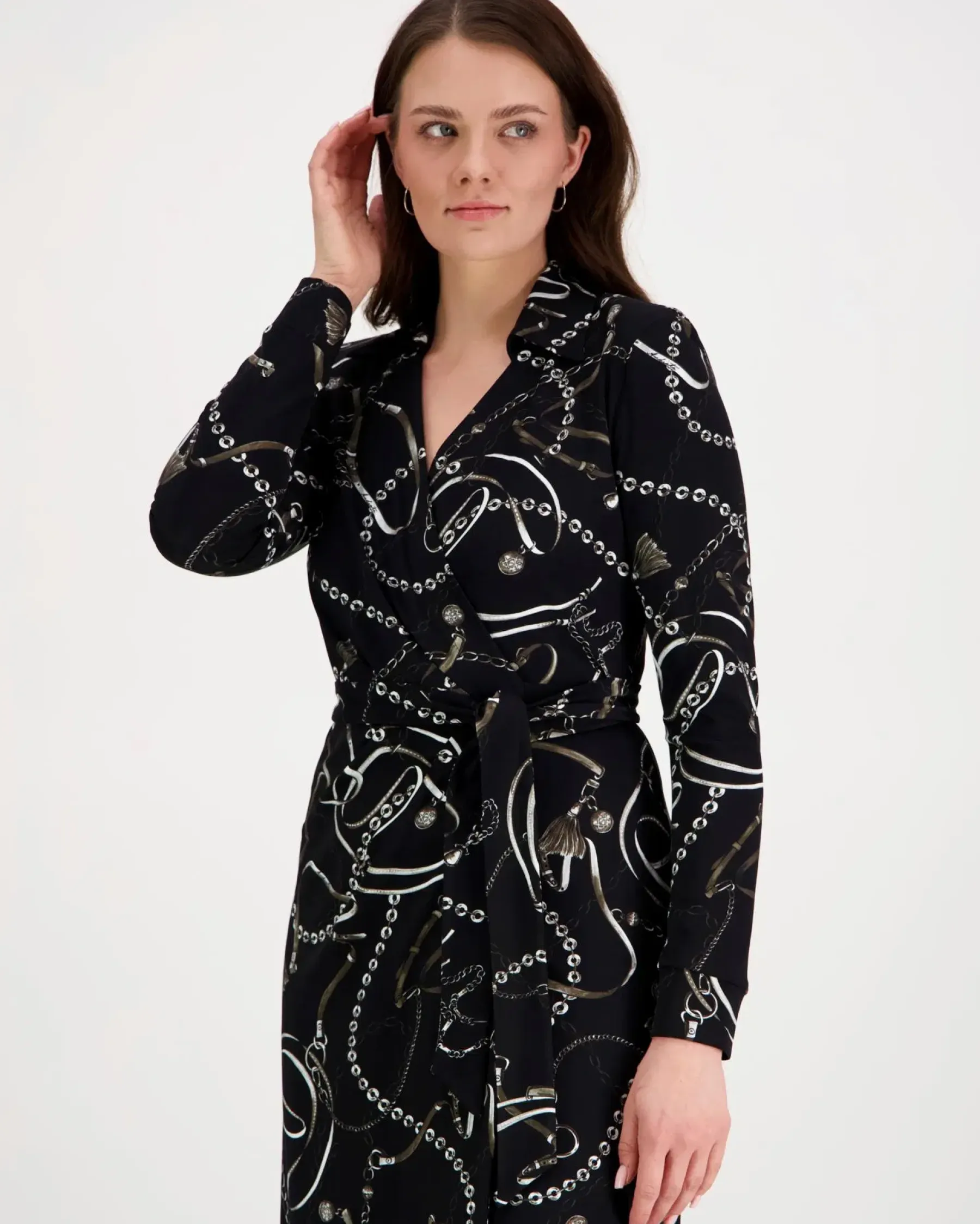 Polvipituinen trikoinen kietaisumekko, jossa on kauluksellinen V-pääntie, pitkät hihat ja nauhasidonta.